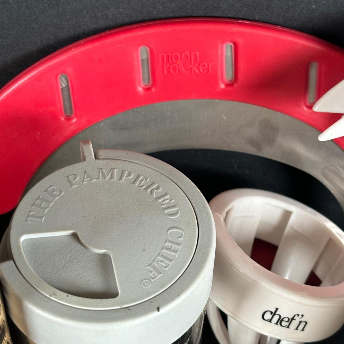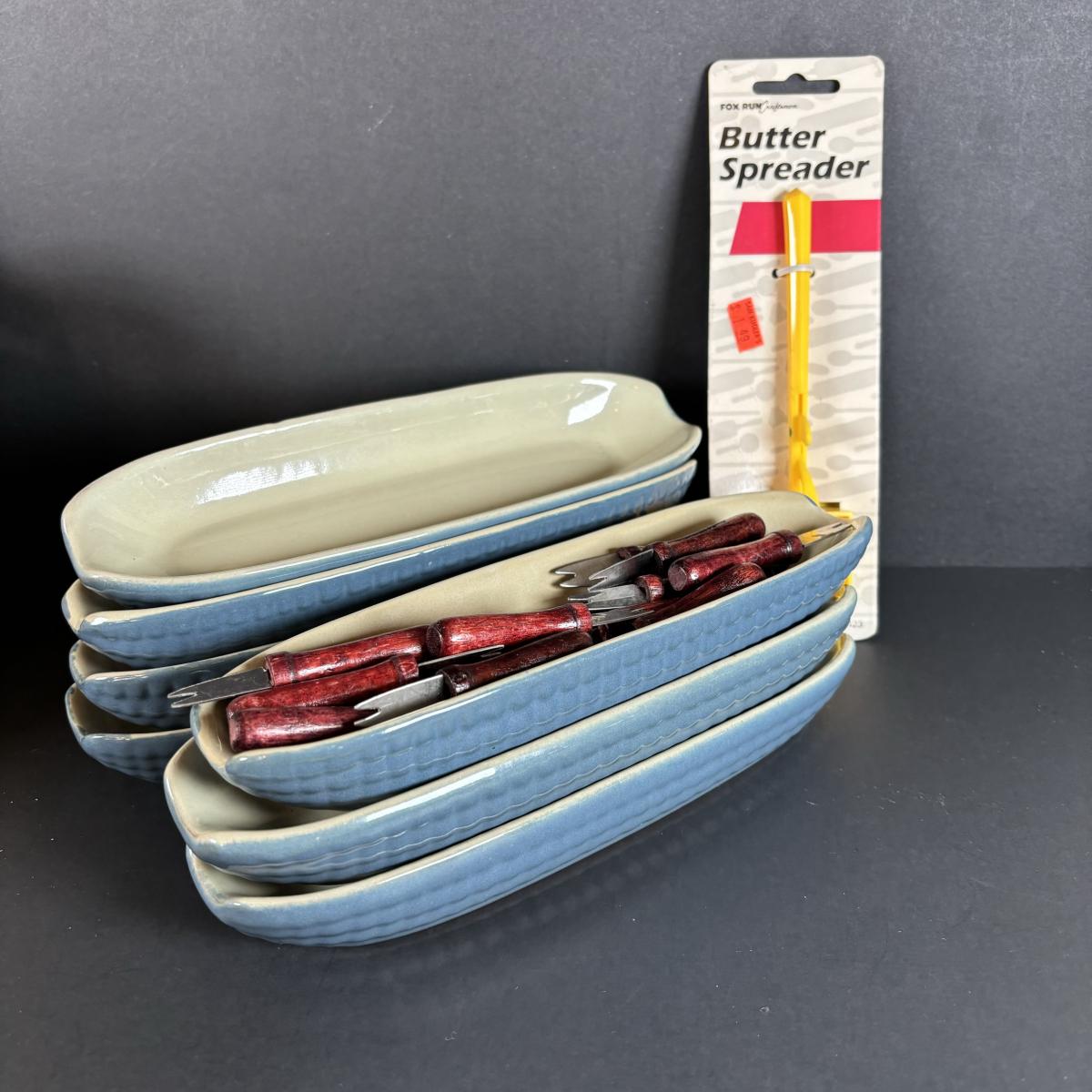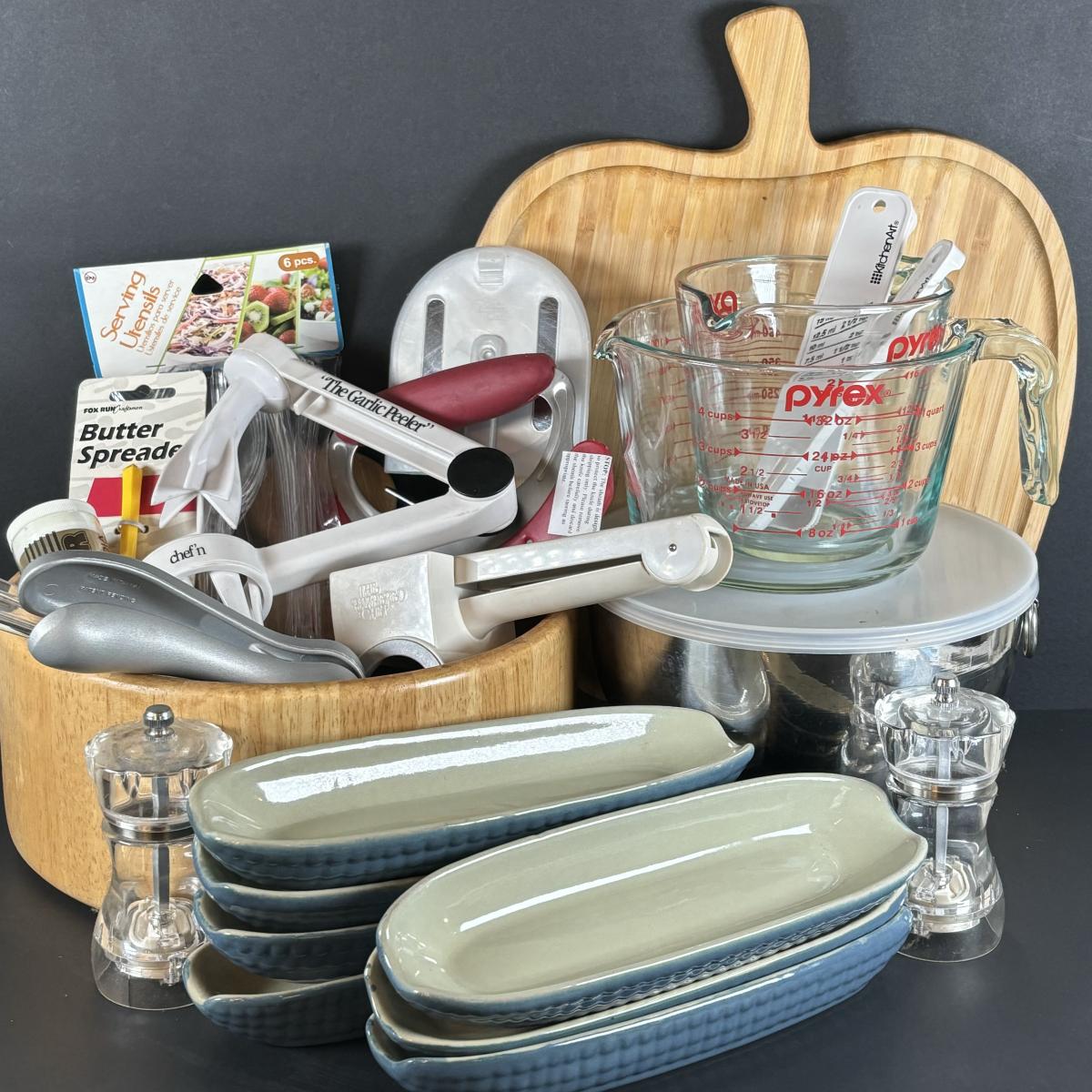 LOT 5: Kitchen Collection: Stoneware Corn on the Cob Plates, Pamper Chef Gadgets, Pyrex Measuring Cup, Revere Ware Mixing Bowls w/Lids & More