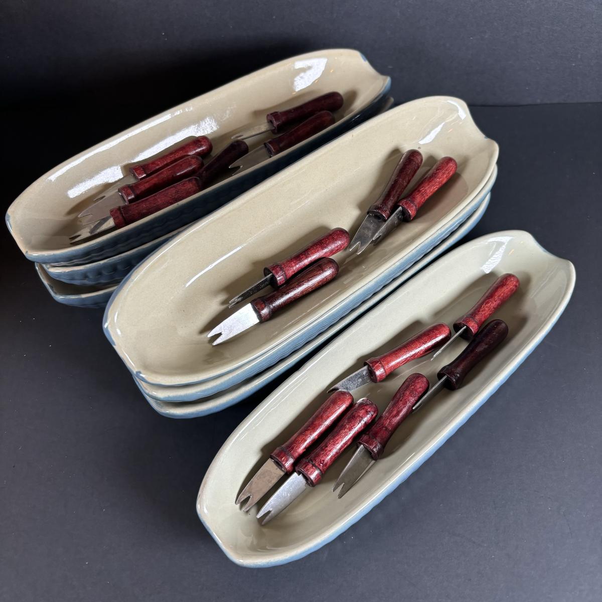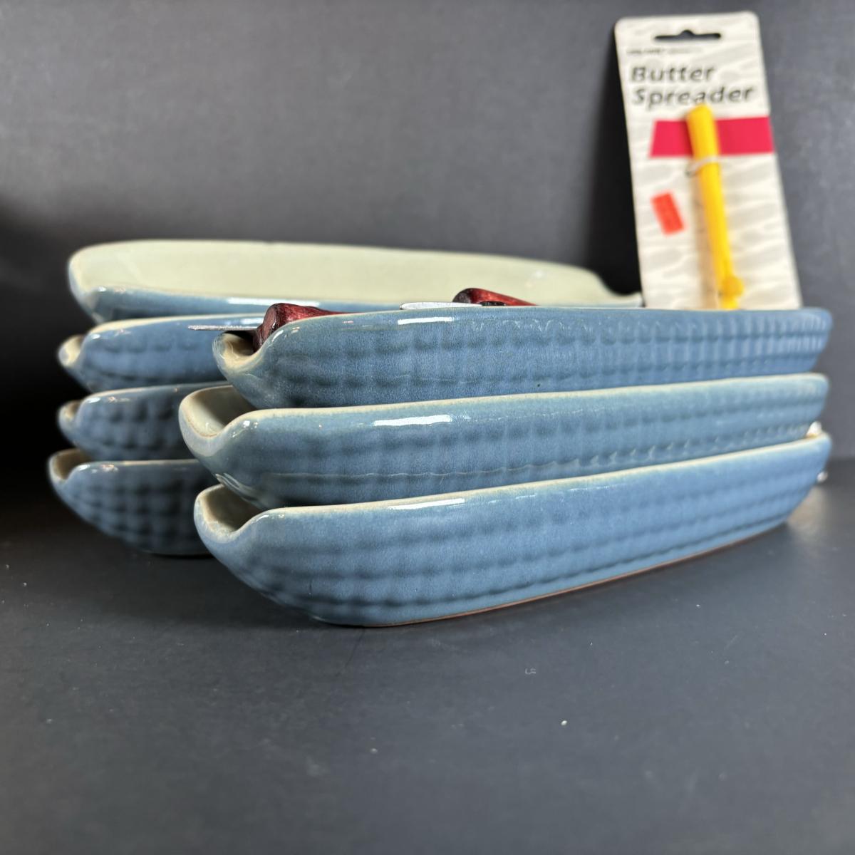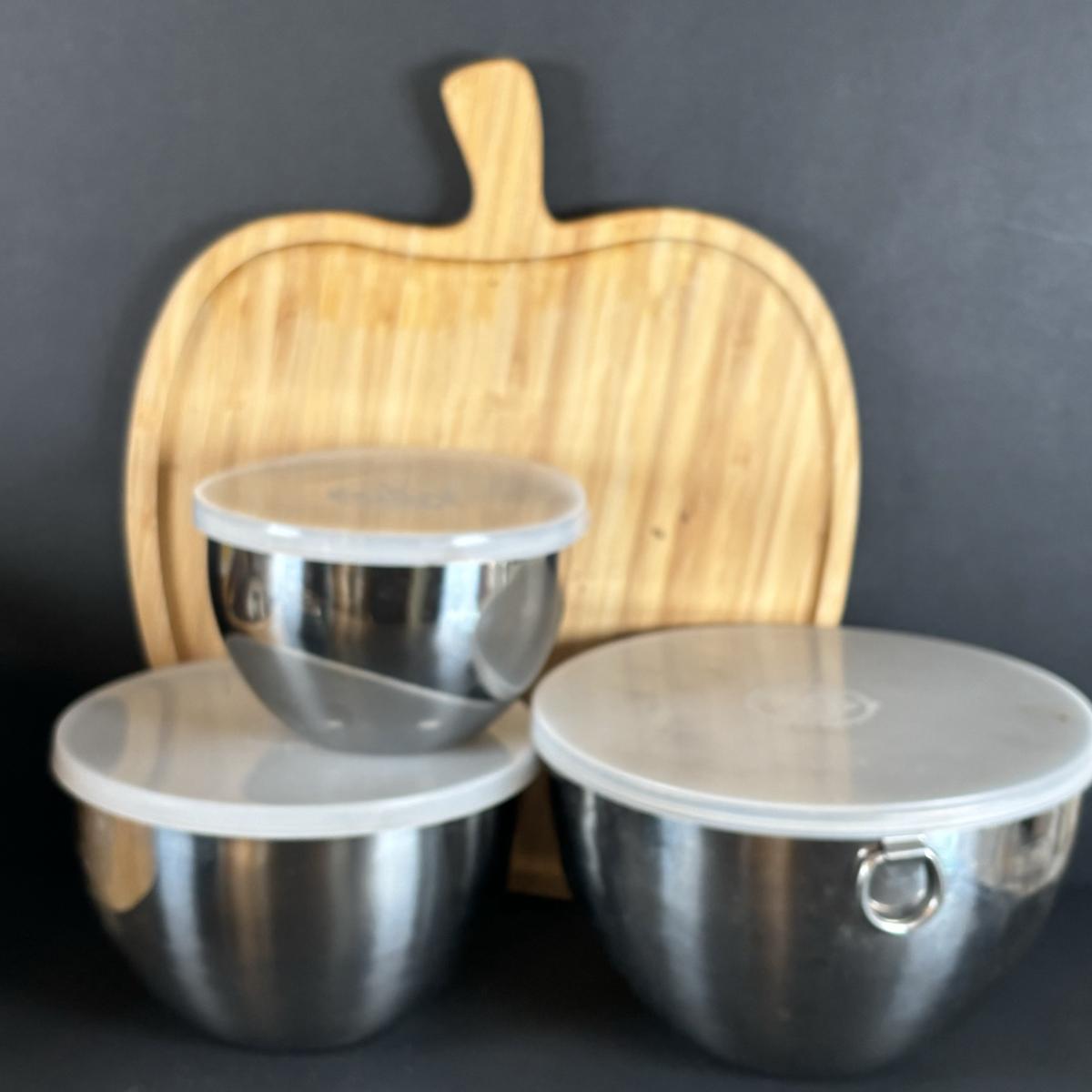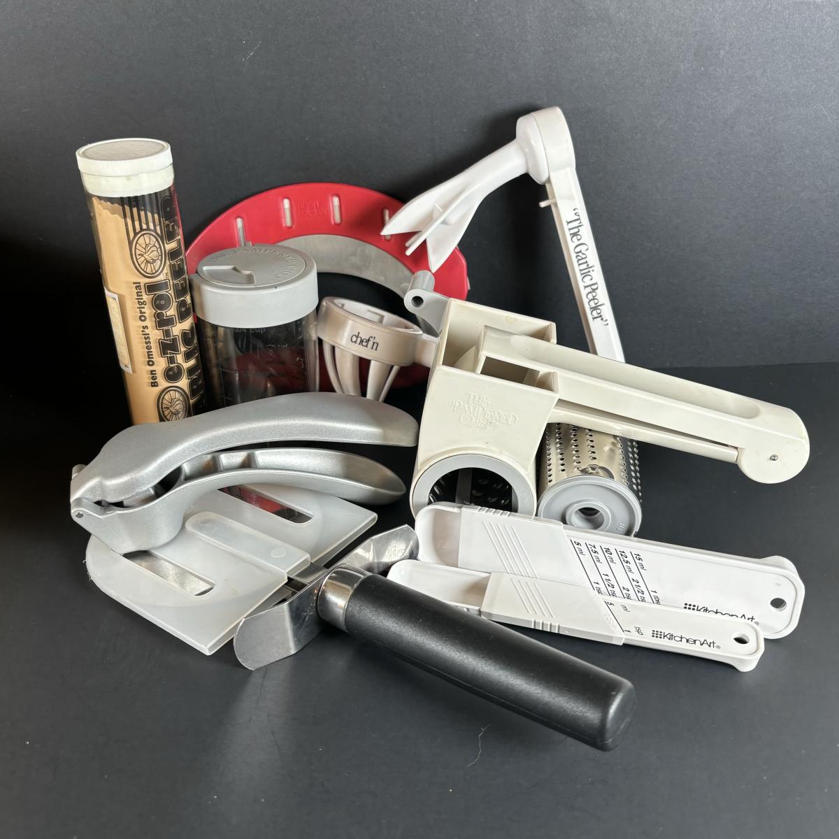LOT 5: Kitchen Collection: Stoneware Corn on the Cob Plates, Pamper Chef Gadgets, Pyrex Measuring Cup, Revere Ware Mixing Bowls w/Lids & More