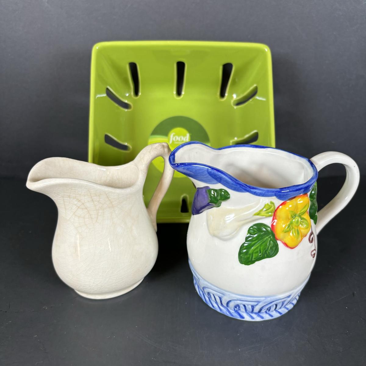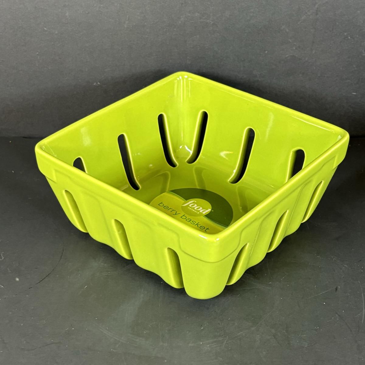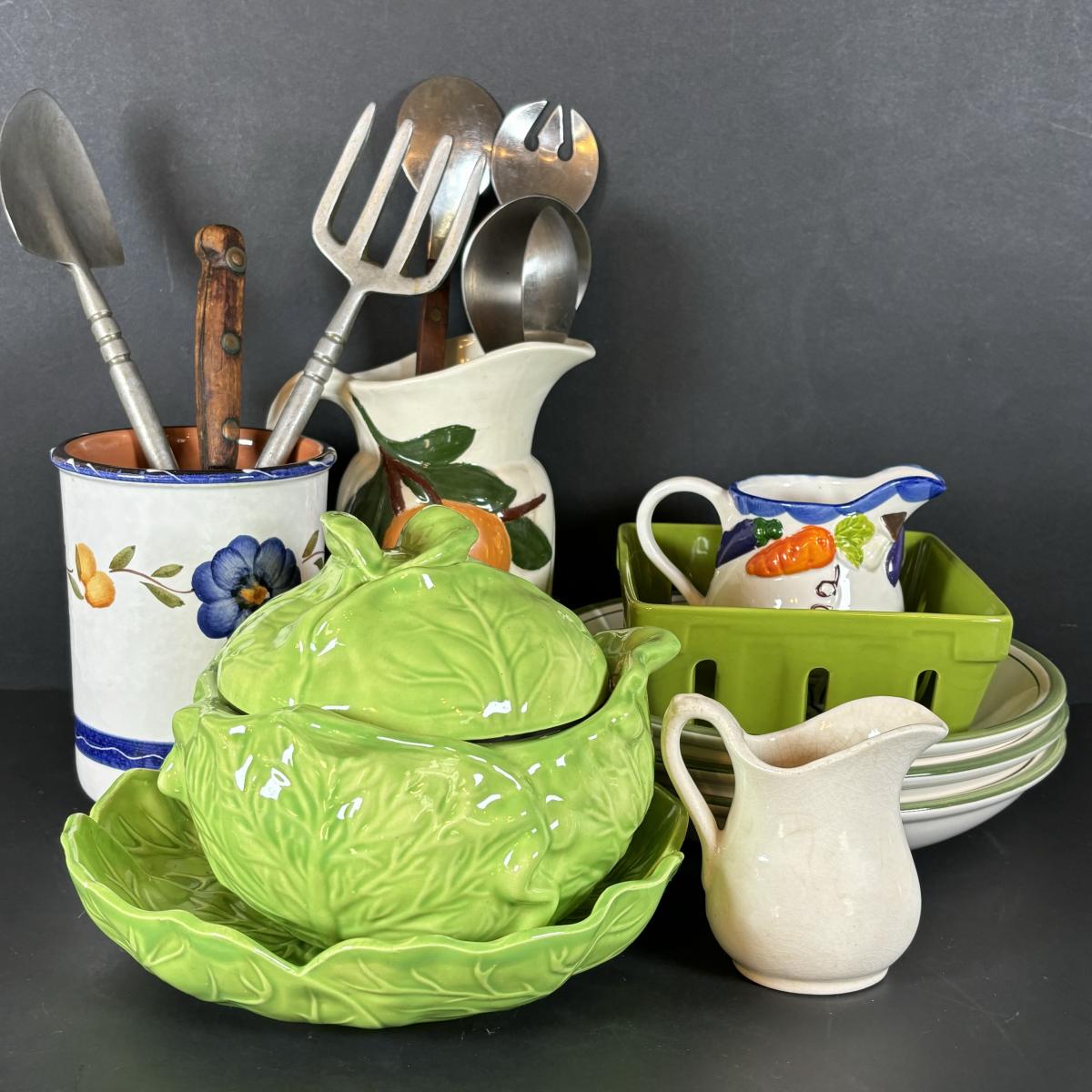 LOT 15: Willaims-Sonoma Heirloom 4pc. Bowl Set, Serving Utensils, Food Network Ceramic Berry Basket, Holland Mold Ceramic Lettuce Set, & More