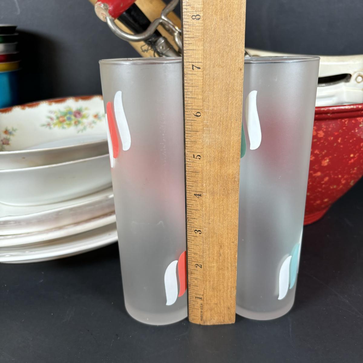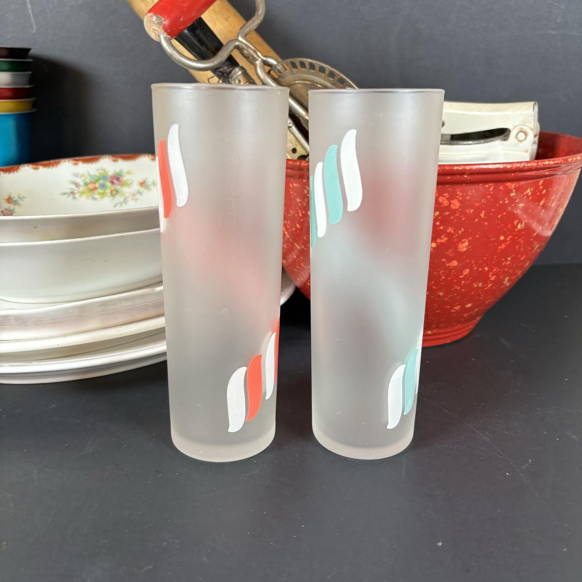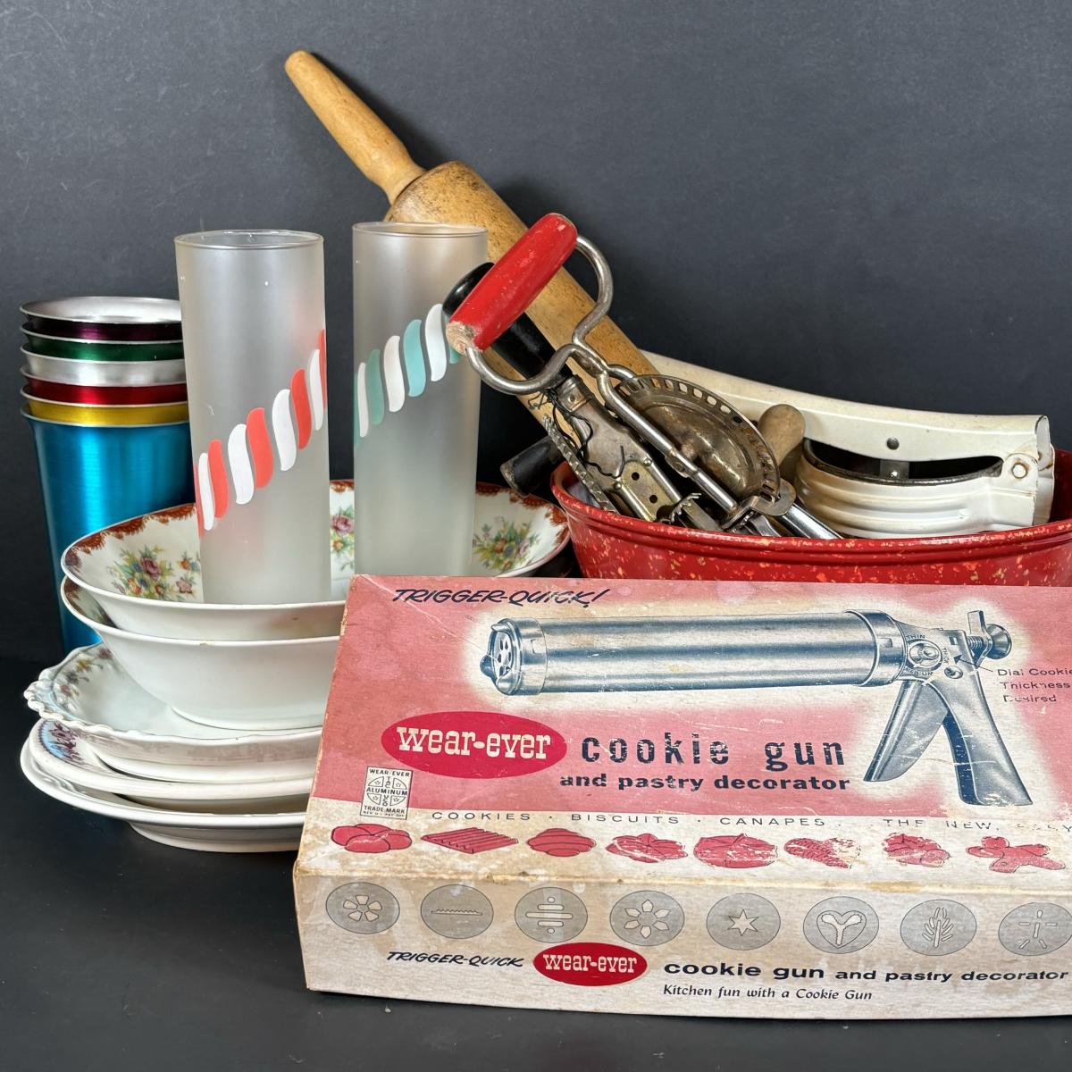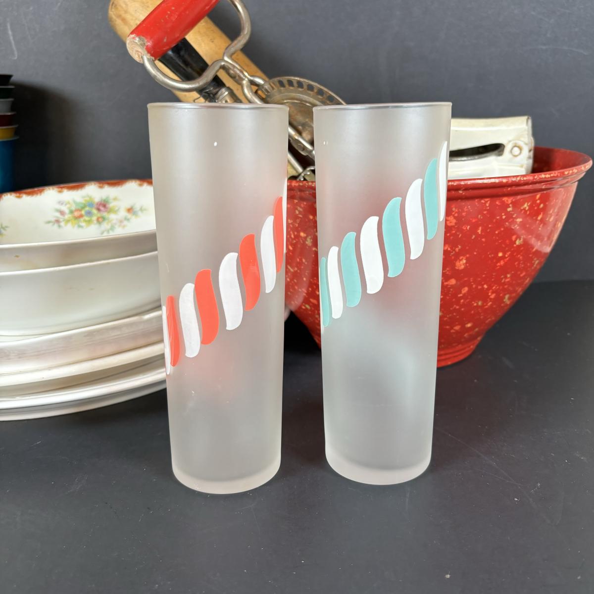 LOT 16: Vintage Candy Stripe Frosted Glasses, Vintage Limoges, Buffalo China, Vintage Kitchen Utensils, Retro Aluminum Tumblers, Wear-Ever Cookie Gun, Rachel Ray Retro Mixing Bowl