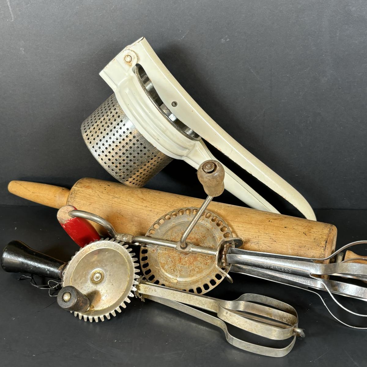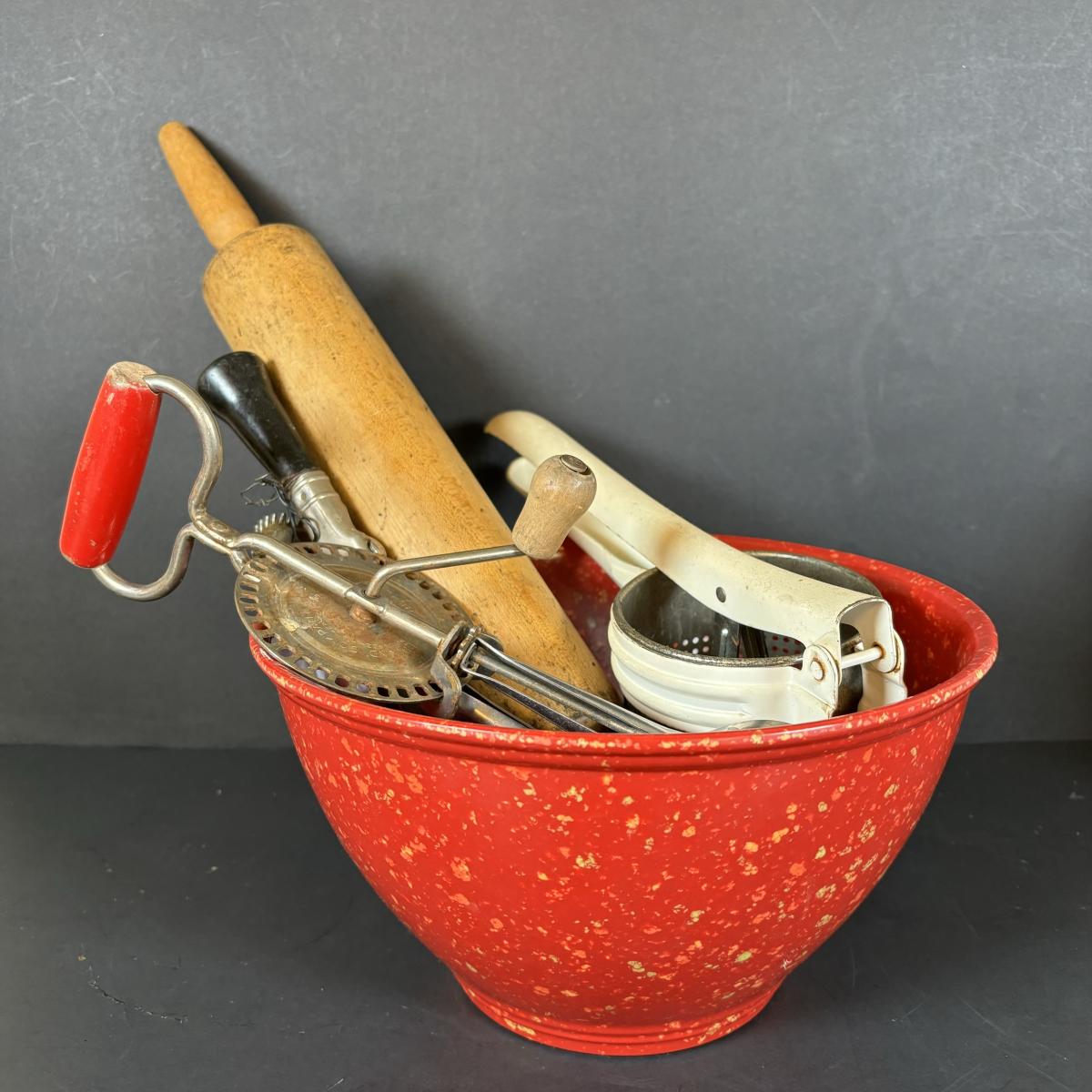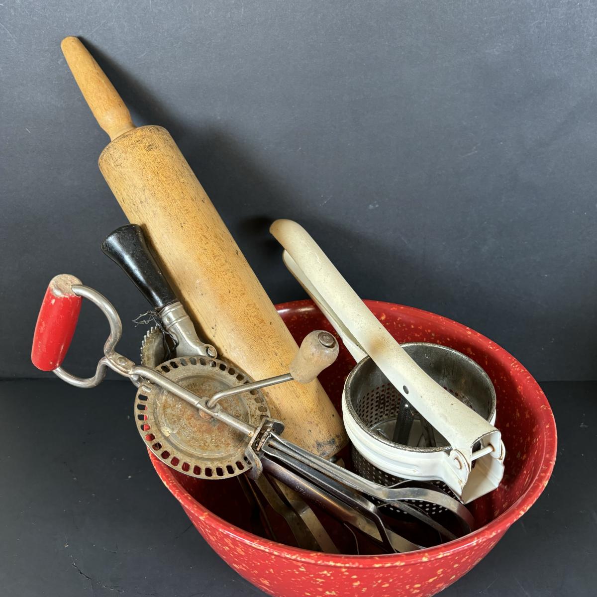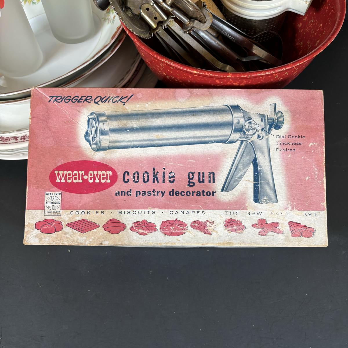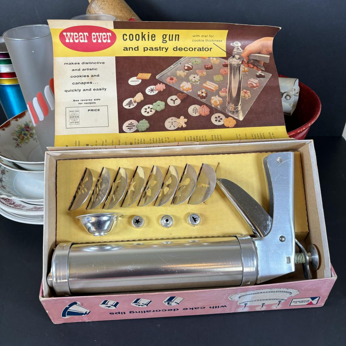 LOT 16: Vintage Candy Stripe Frosted Glasses, Vintage Limoges, Buffalo China, Vintage Kitchen Utensils, Retro Aluminum Tumblers, Wear-Ever Cookie Gun, Rachel Ray Retro Mixing Bowl