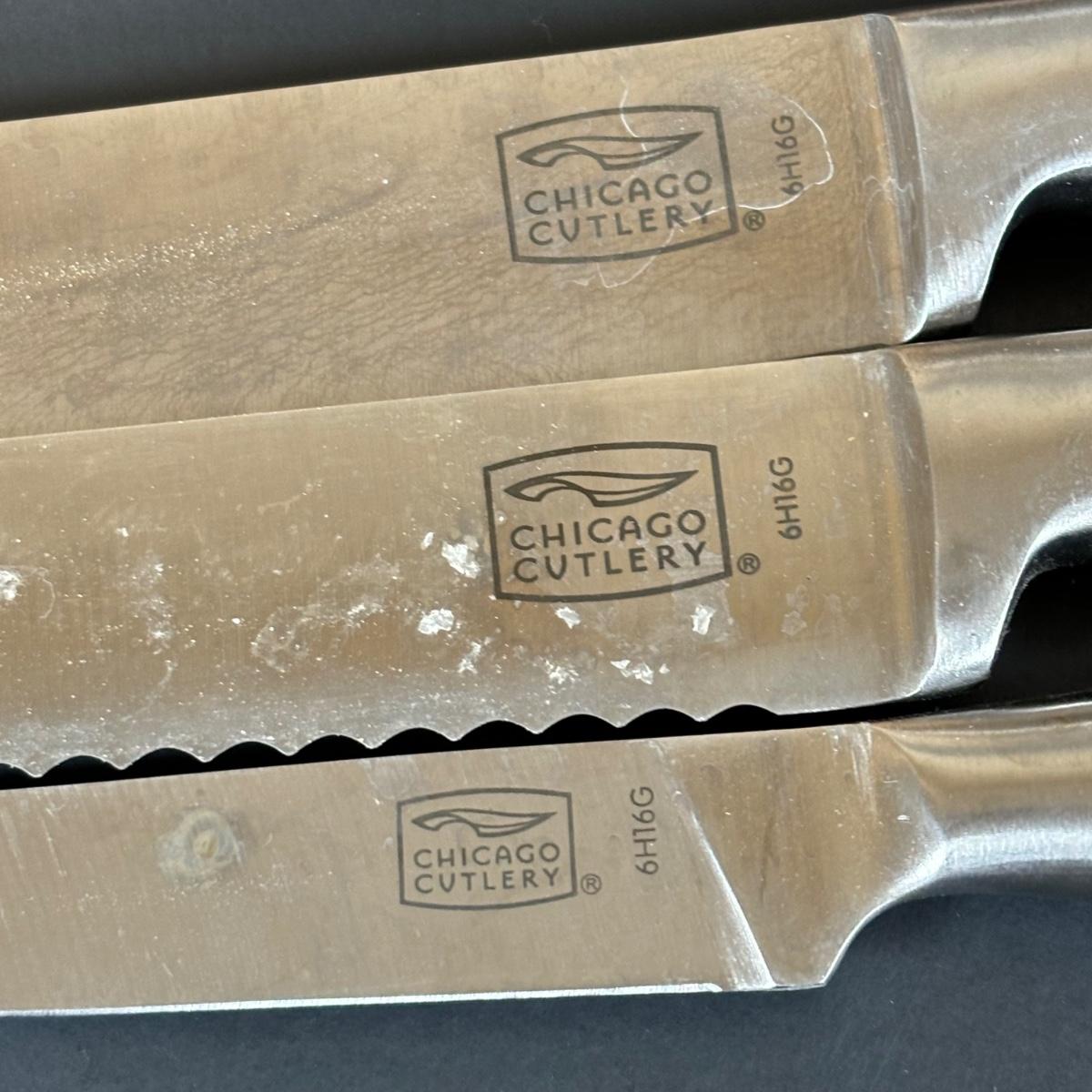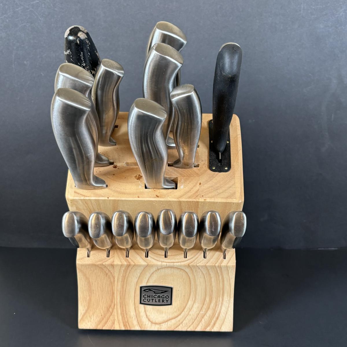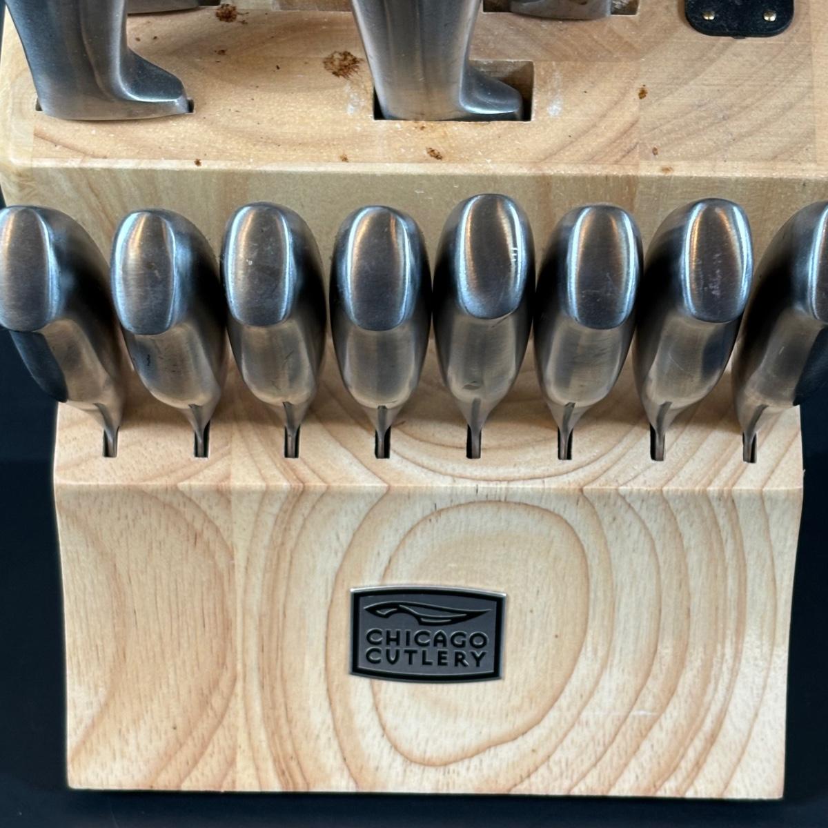 Knife sharpener powers on. Chicago Cutlery is missing 1 knife, 1 knife was replaces with a Henkle knife and sharpener is not original to the set.