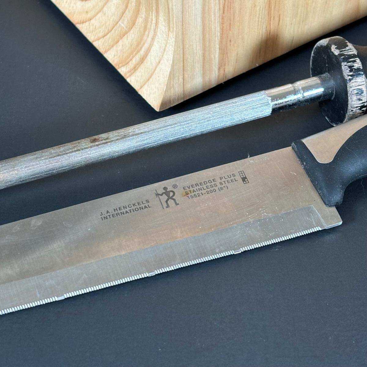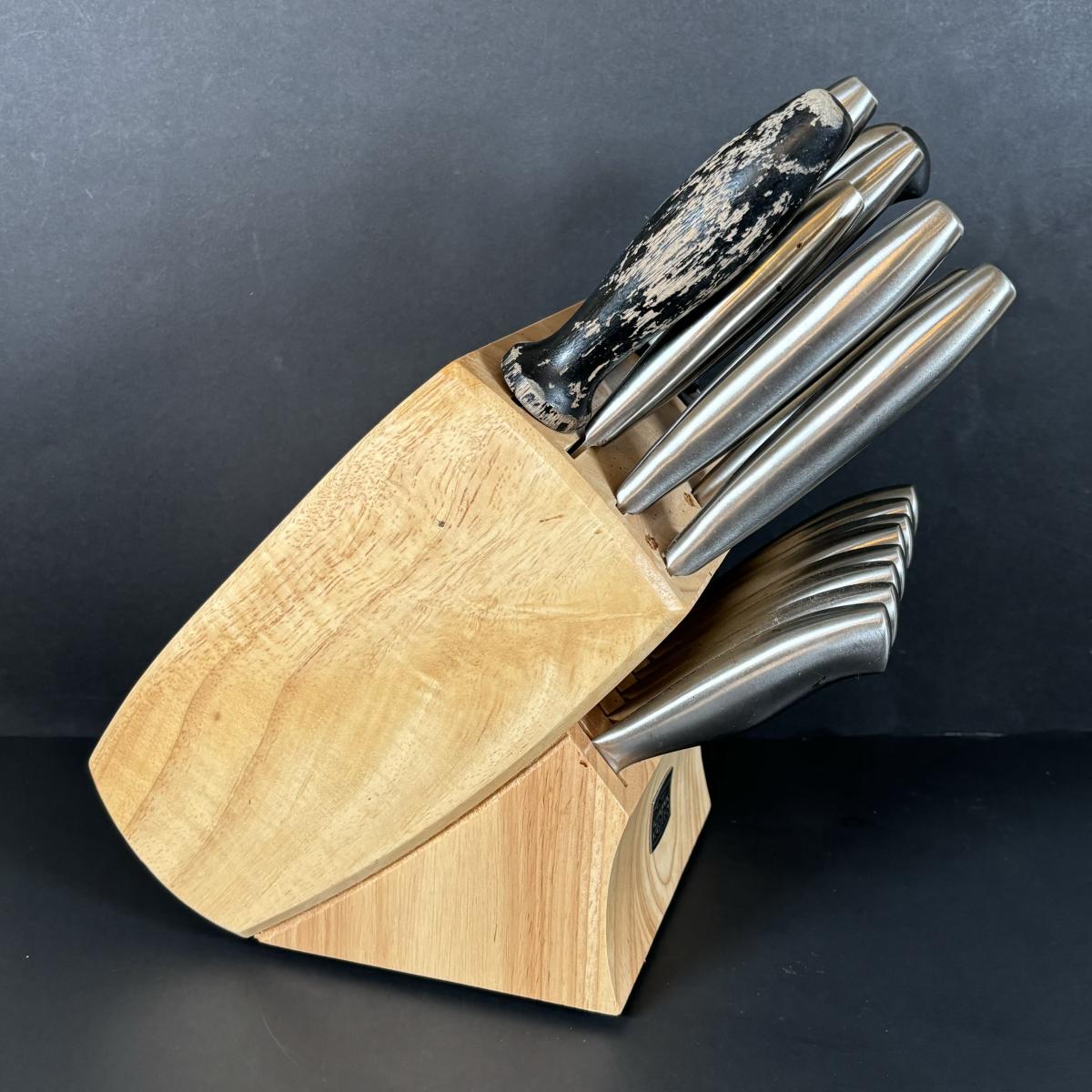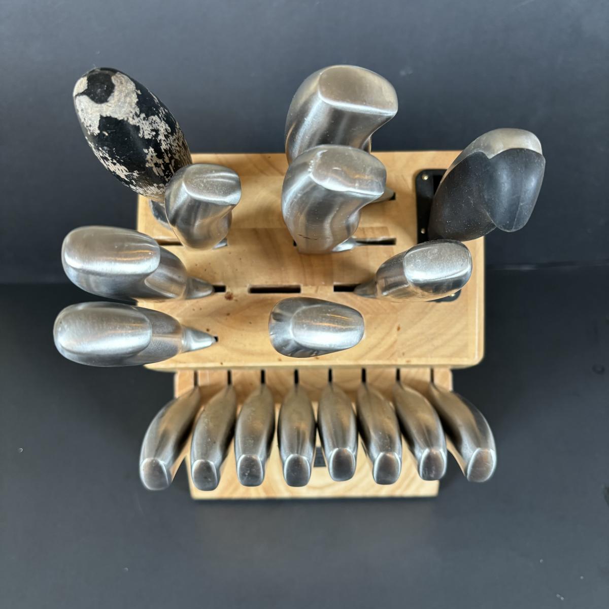 Knife sharpener powers on. Chicago Cutlery is missing 1 knife, 1 knife was replaces with a Henkle knife and sharpener is not original to the set.