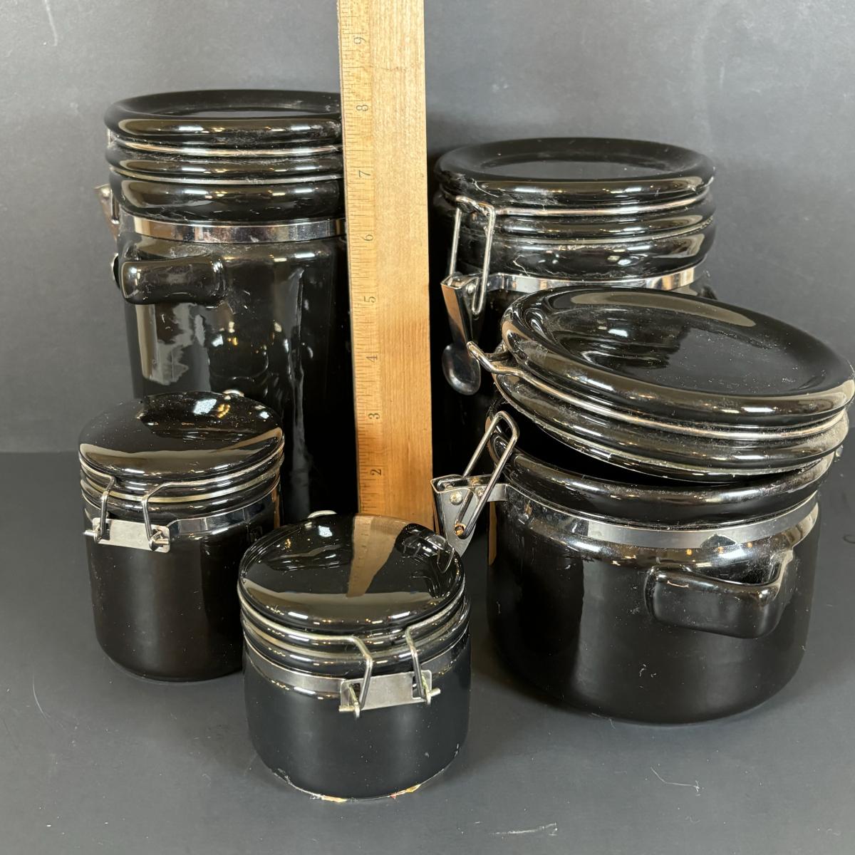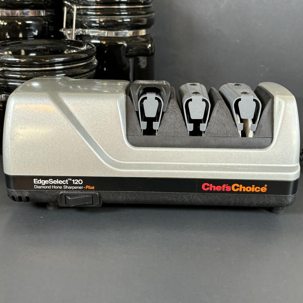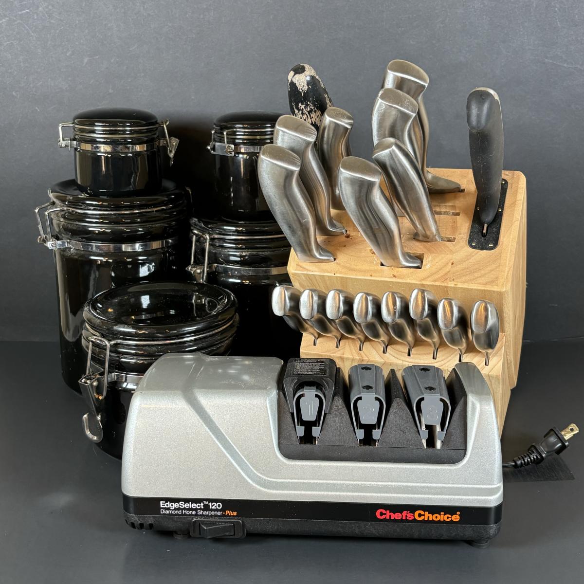 LOT 17: Chef's Choice Knife Sharpener, Chicago Cutlery Knives, Black Ceramic Canisters