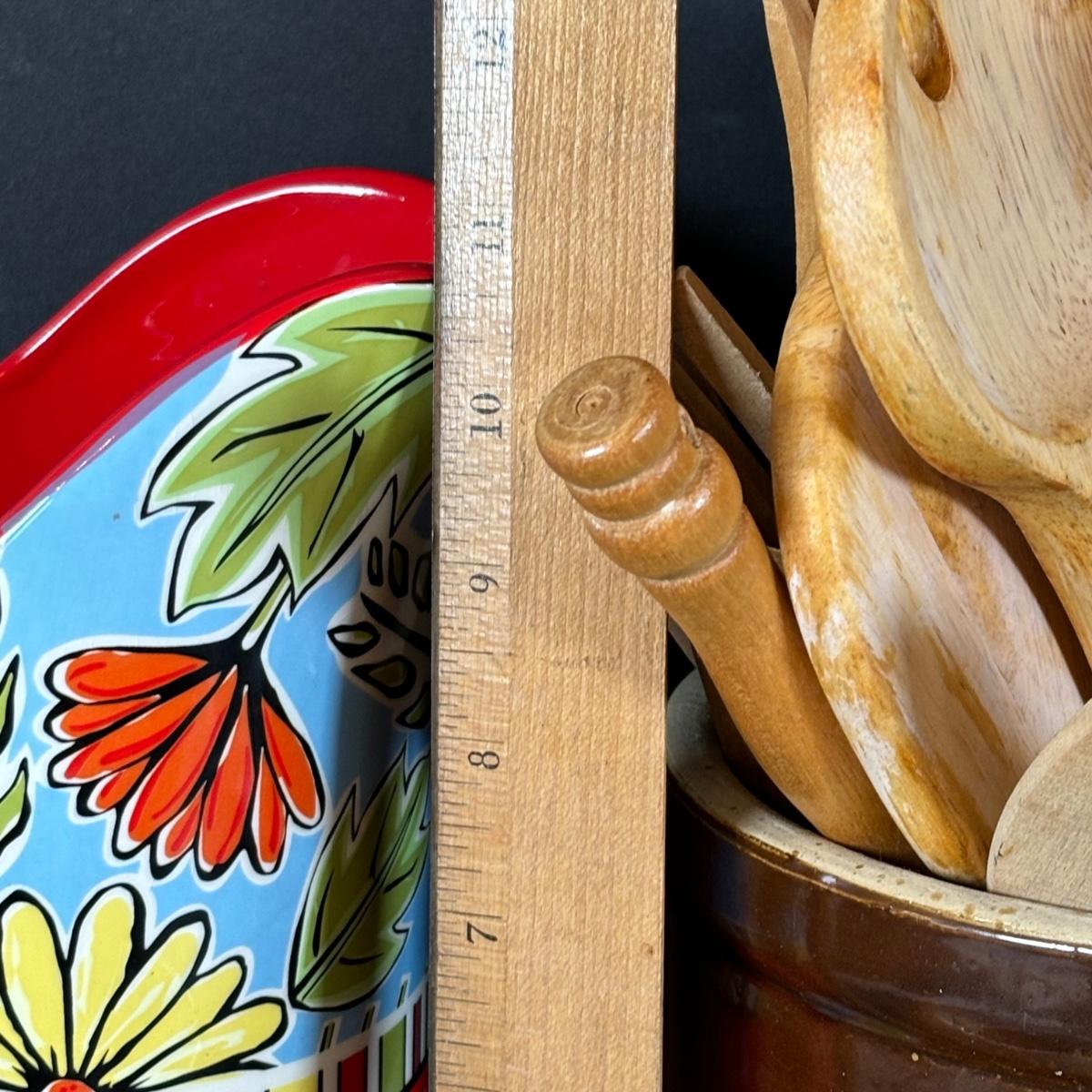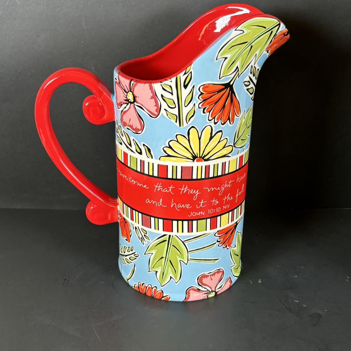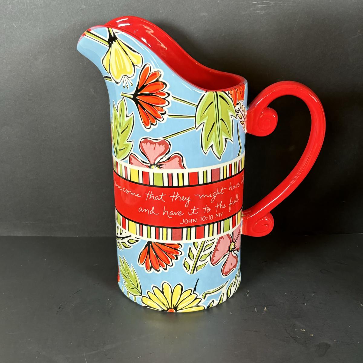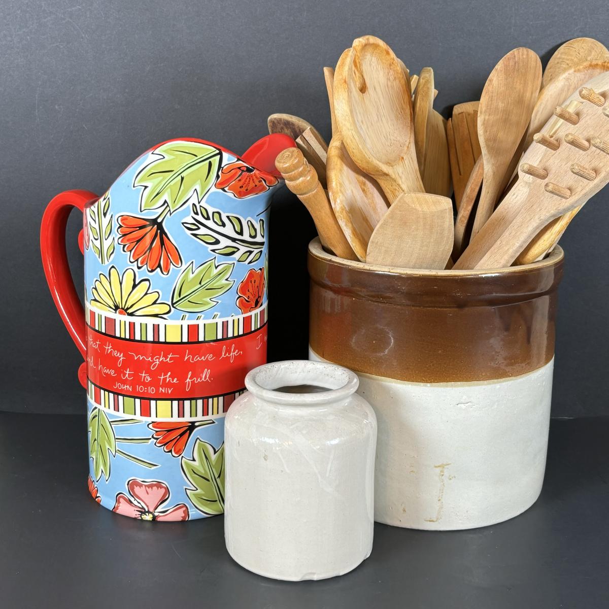 LOT 22: Stoneware Crock w/Wooden Utensils, Inspirational Dayspring 10" Pitcher & Unmarked Stoneware Jar