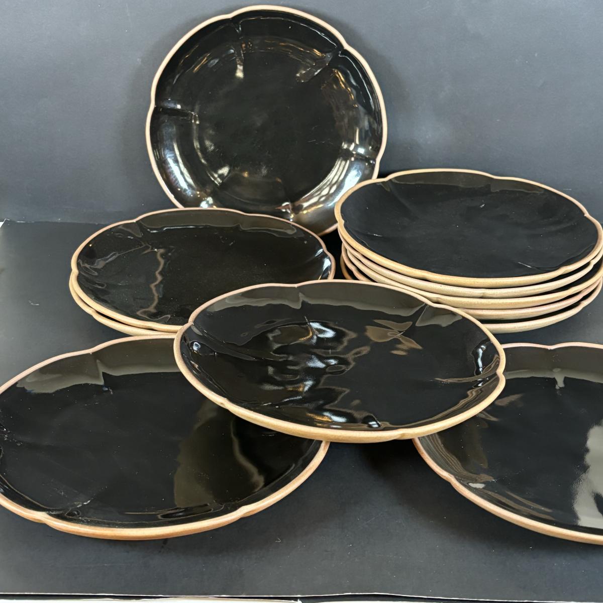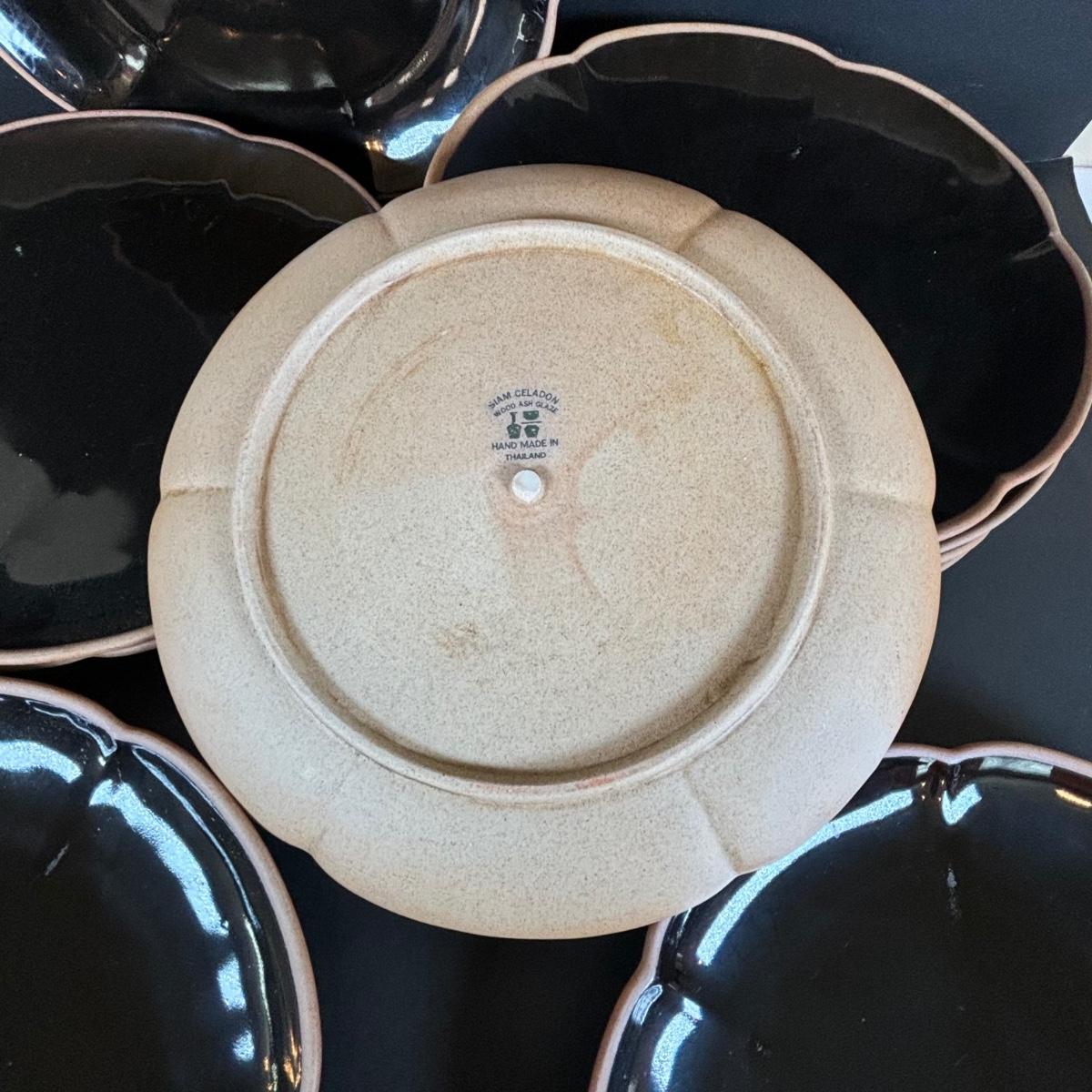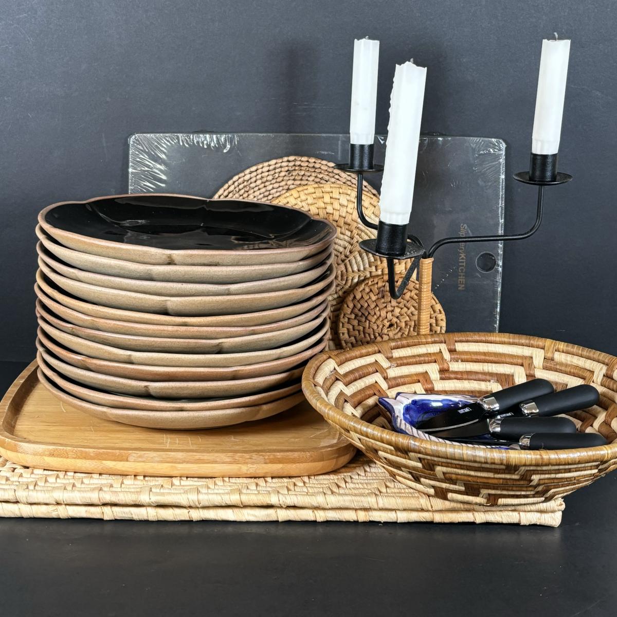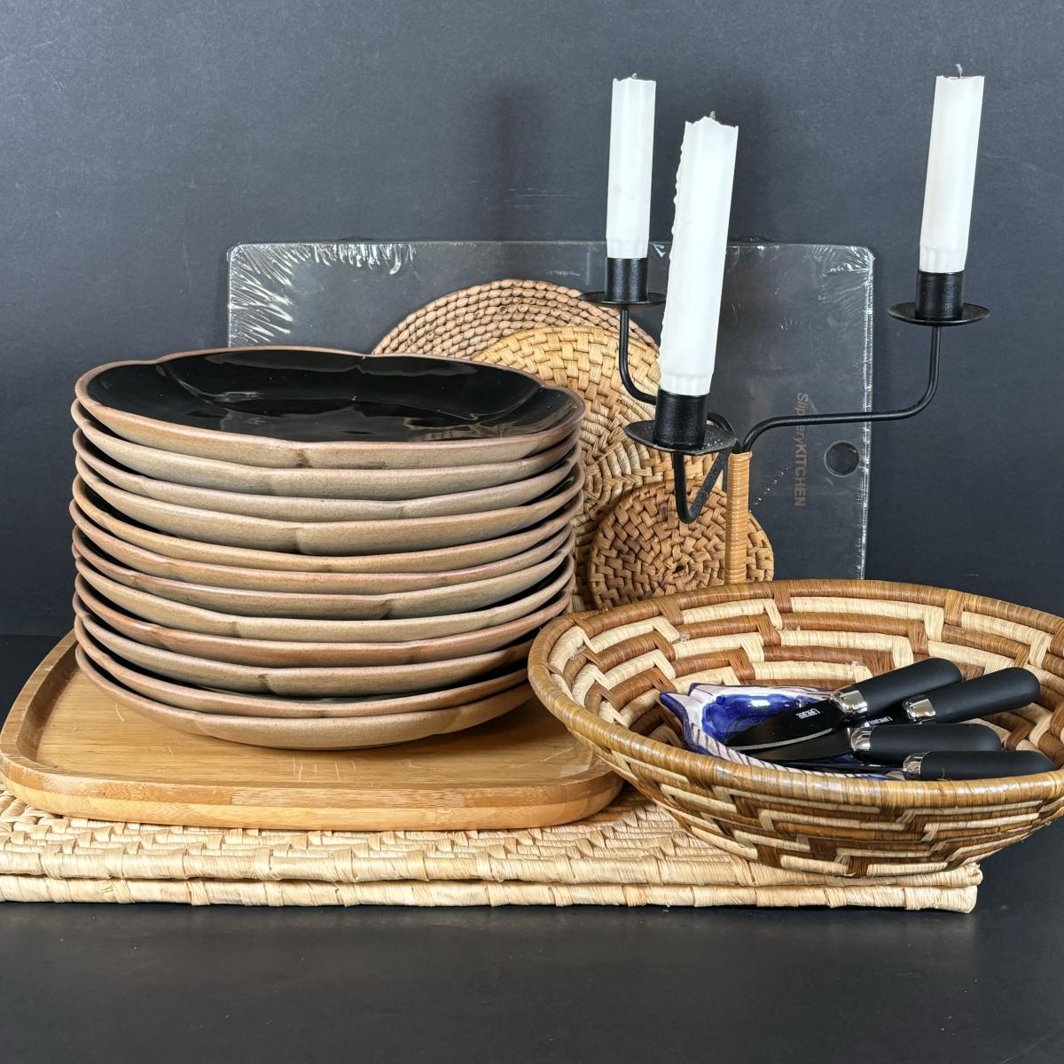 LOT 25: Vintage Siam Celadon Wood Ash Glaze Plates, NIP Cutting Board, Black Metal Candle Holder & More
