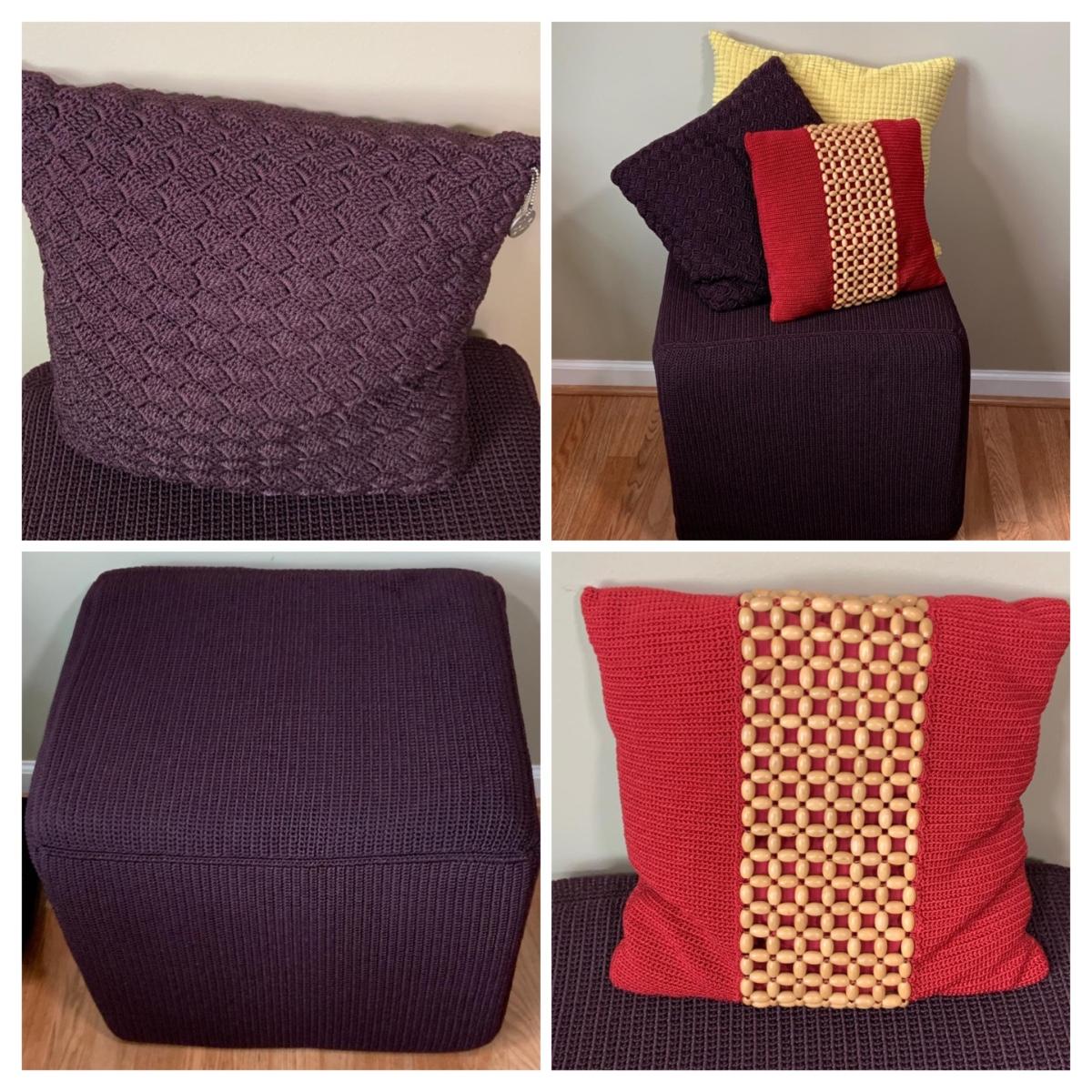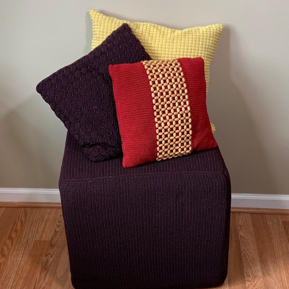 LOT:35: Square Foot Stool/ Ottoman with 2 The Sack and Other Decorative Pillows