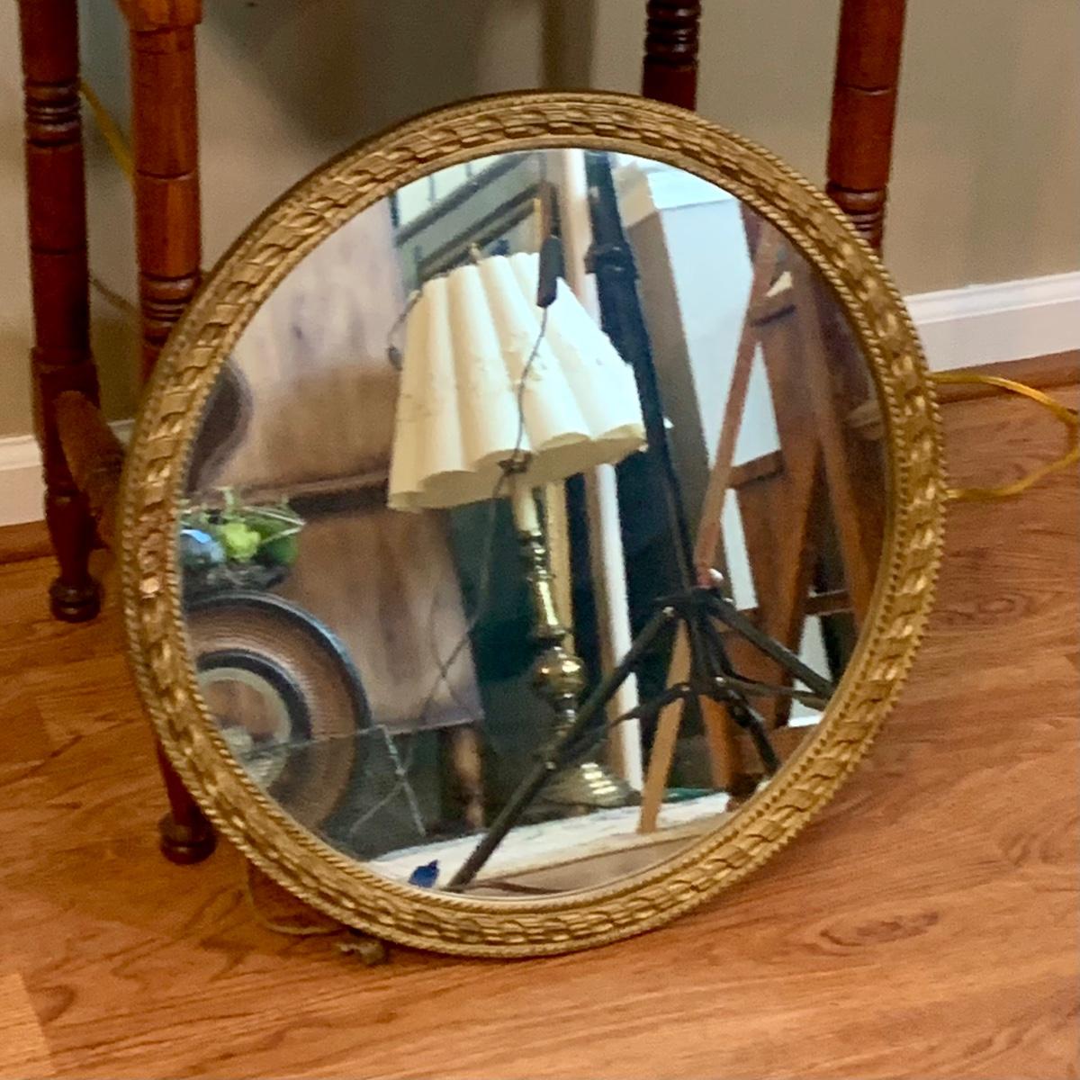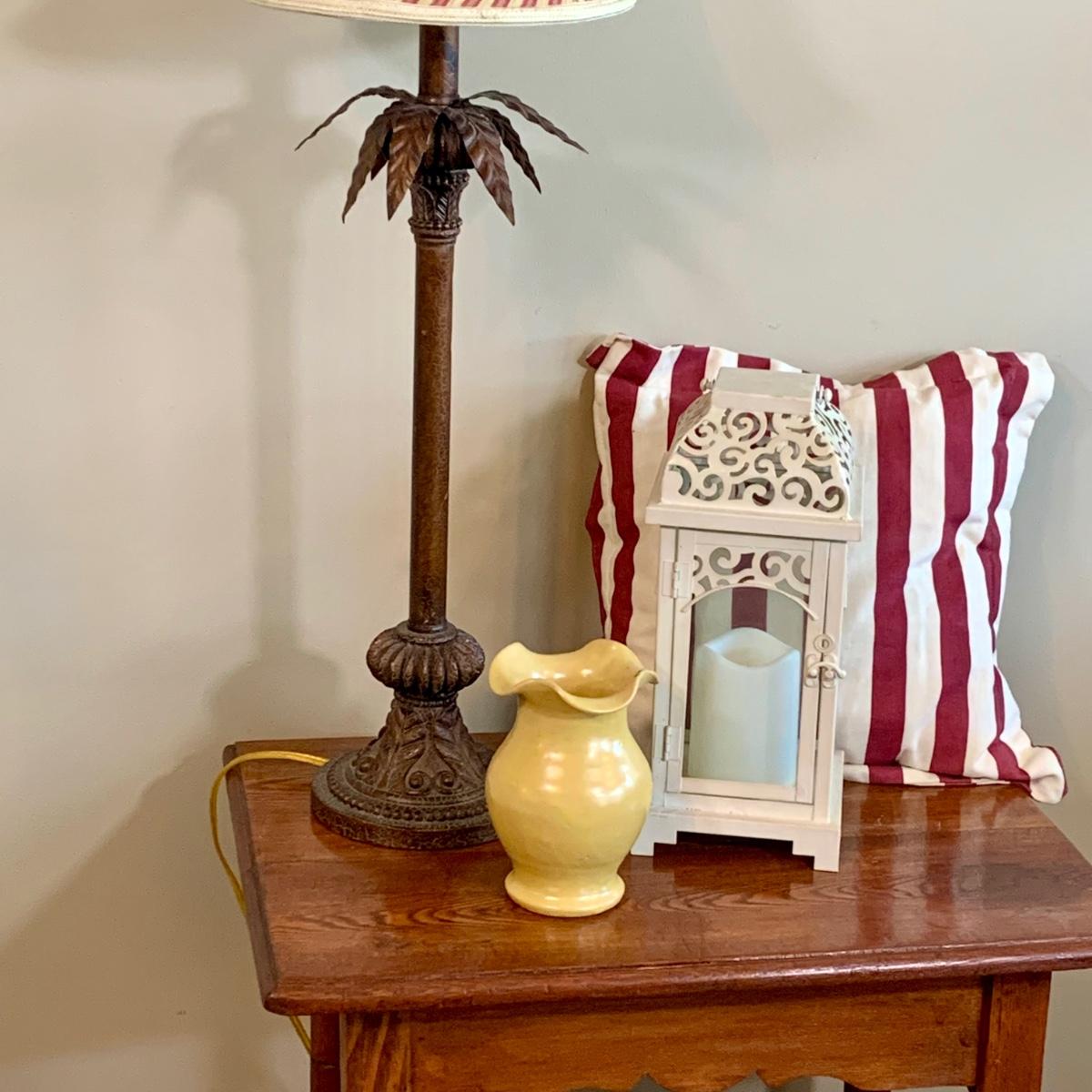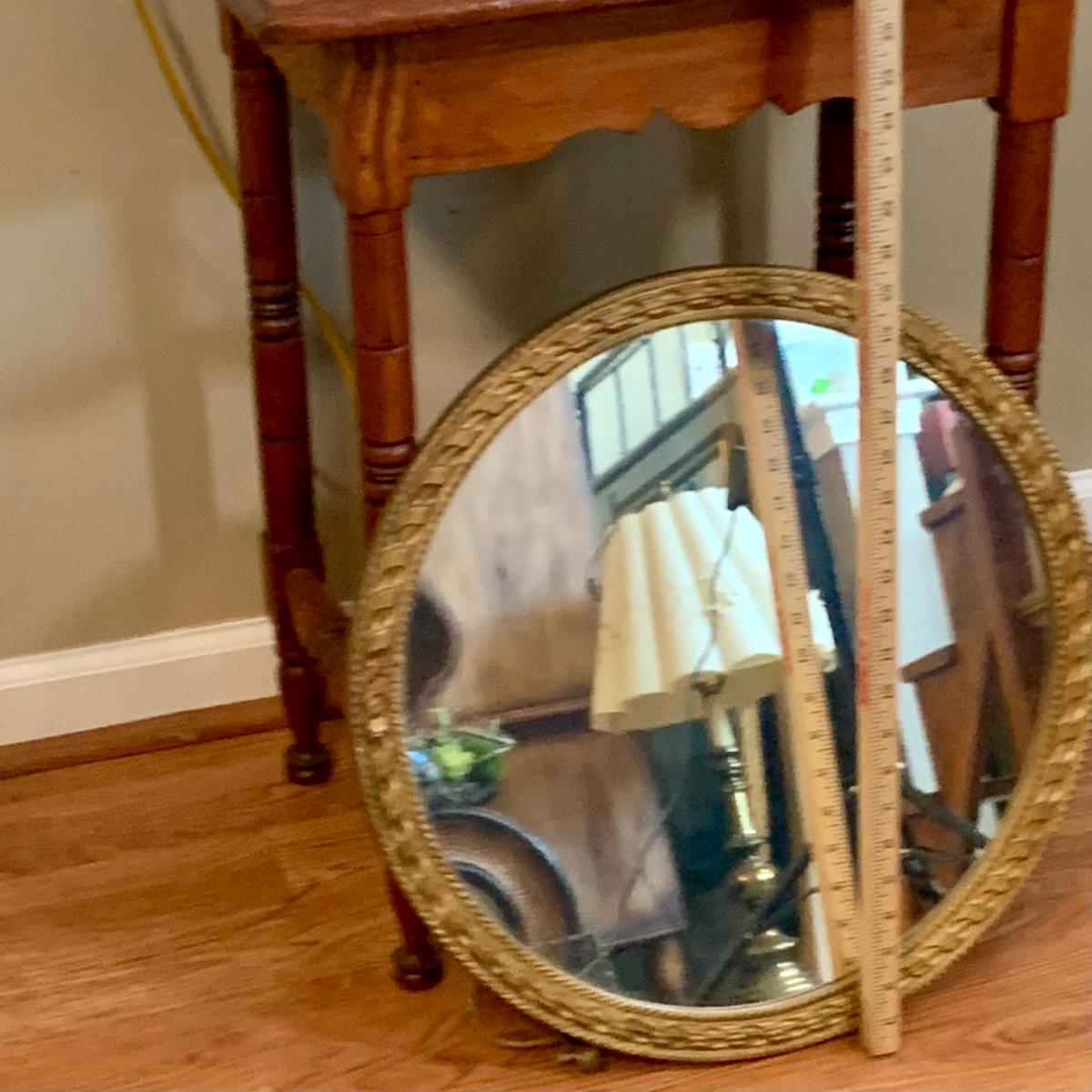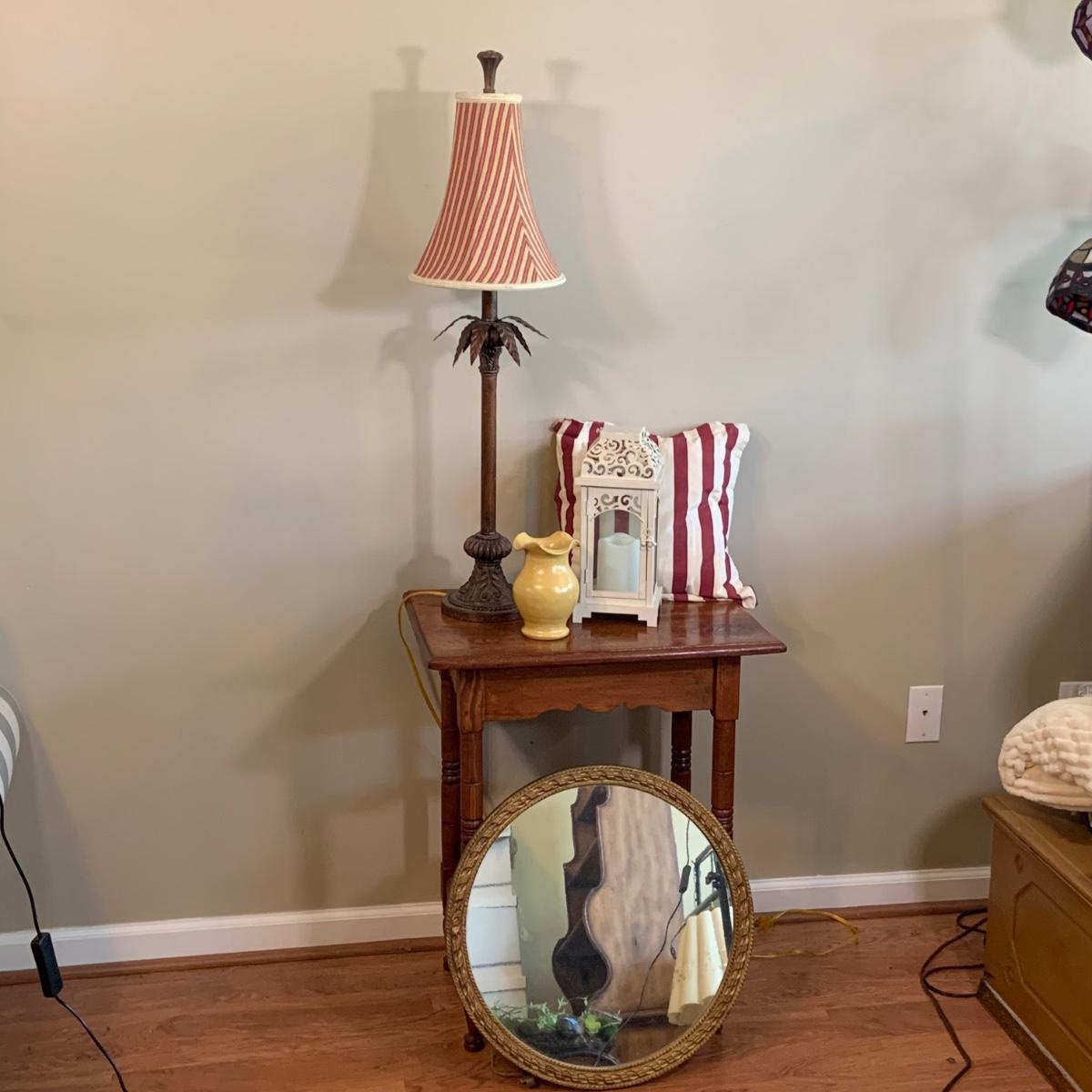 LOT:41: Antique/Vintage Mirror and Side Table with Lamp Pillow and Other Home Decor