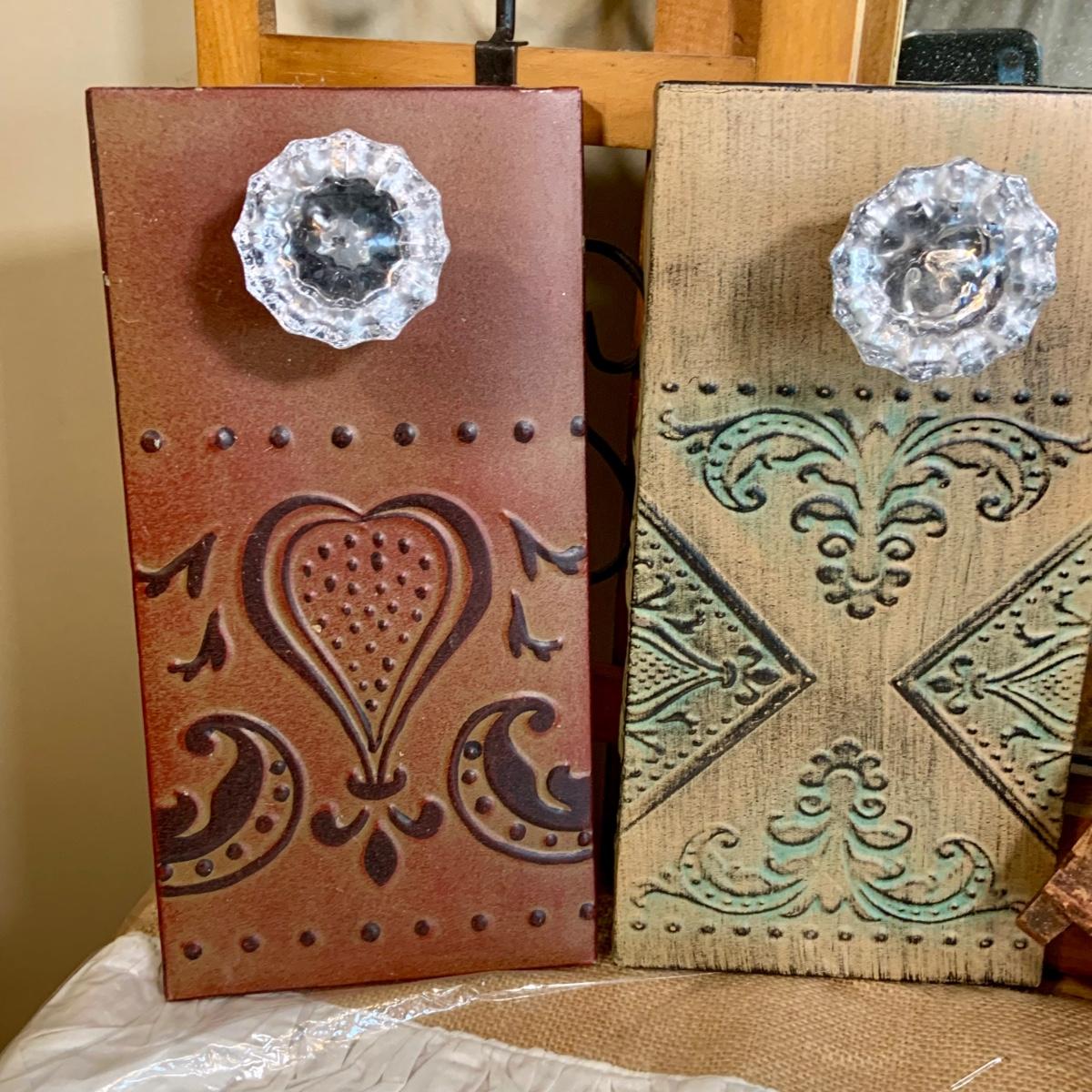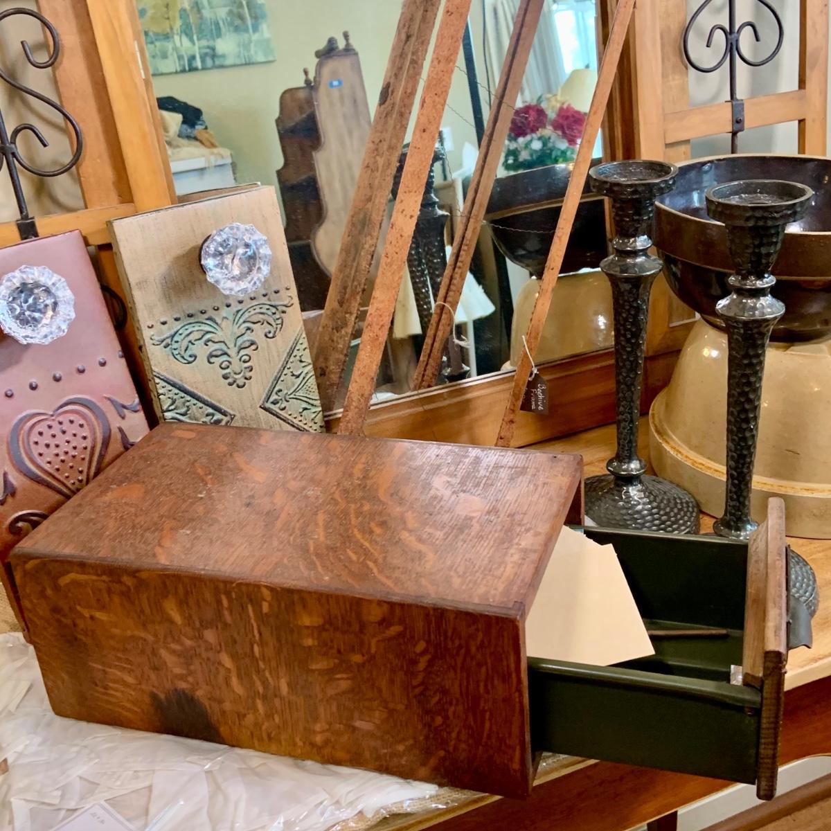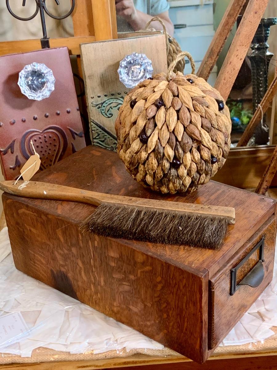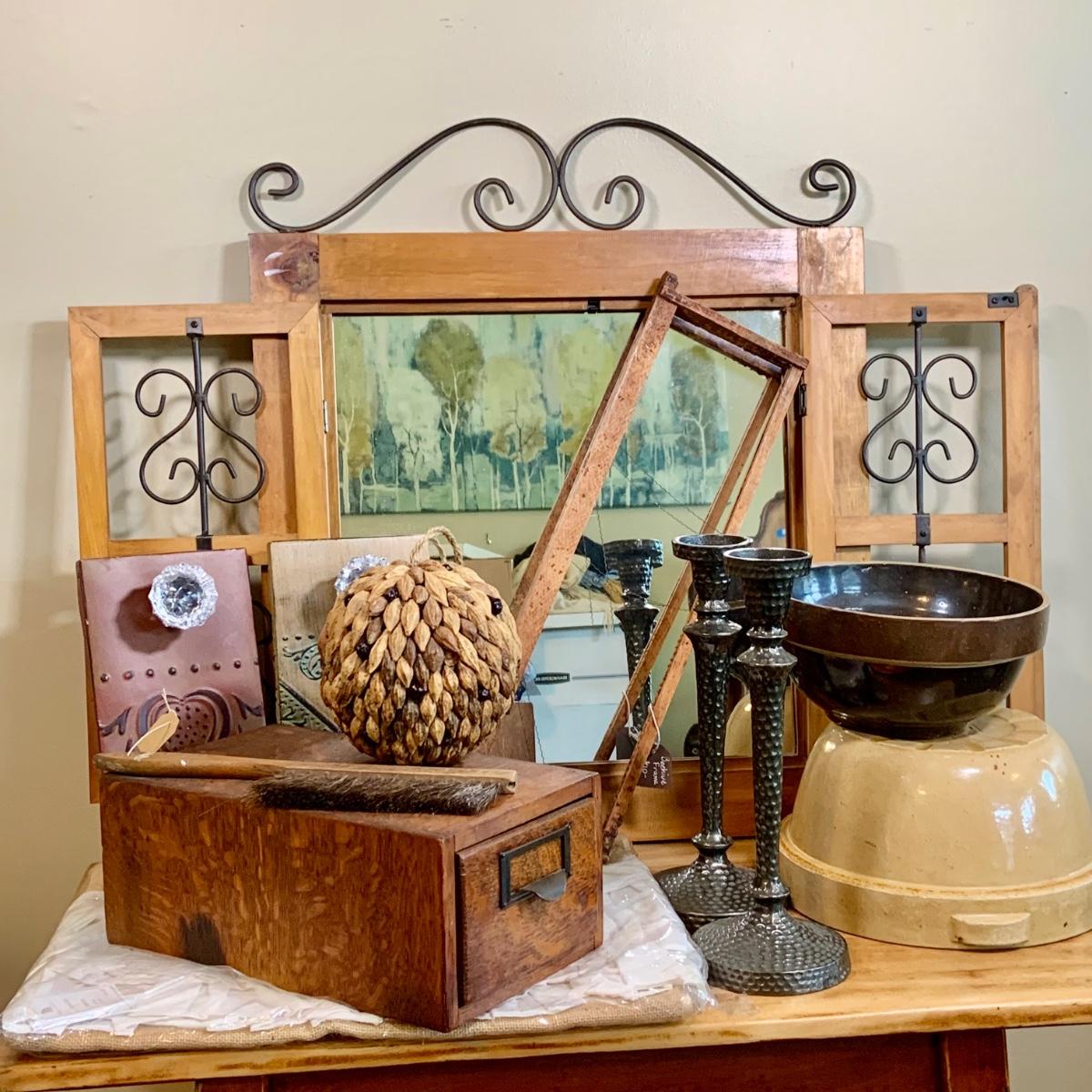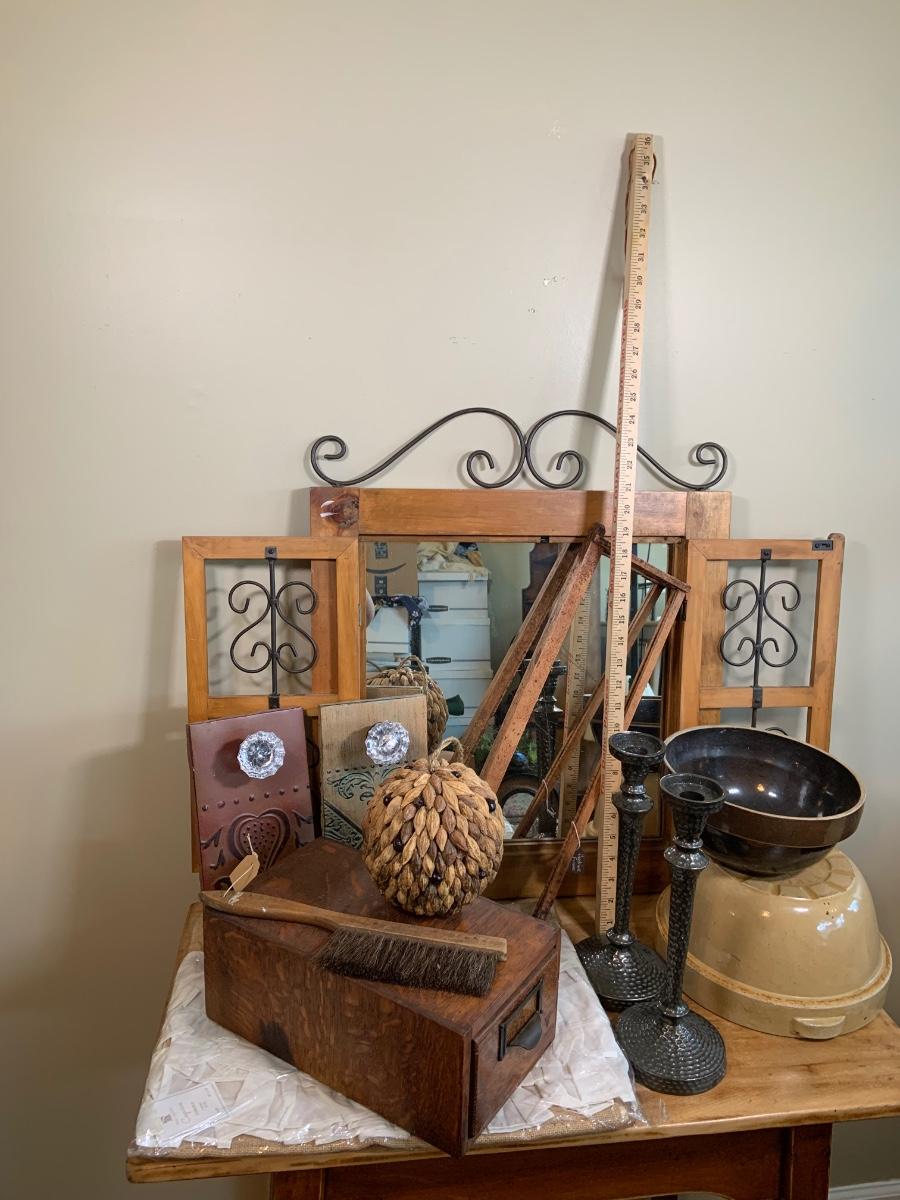 LOT:43: Wood and Metal Window Frame Style Mirror, Vintage Index Card Box Ceramic Bowls, Beehive Frame Glass Door Knob Decor and More