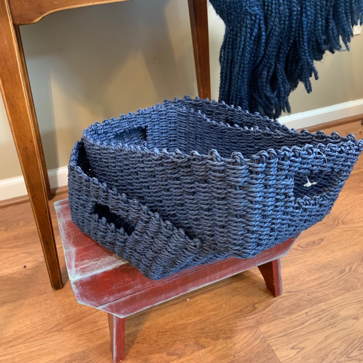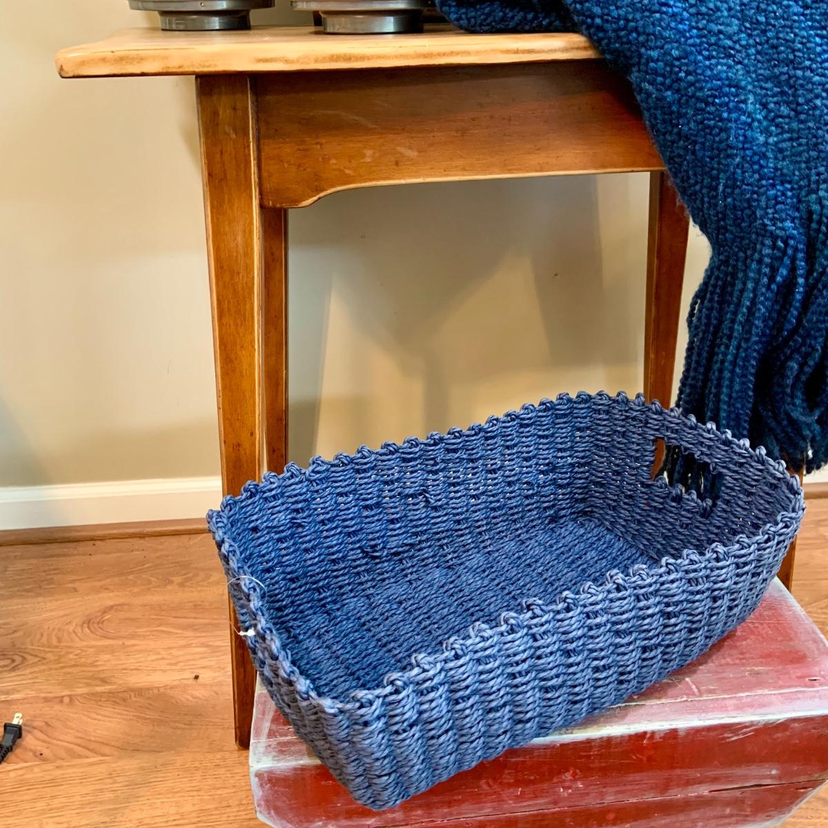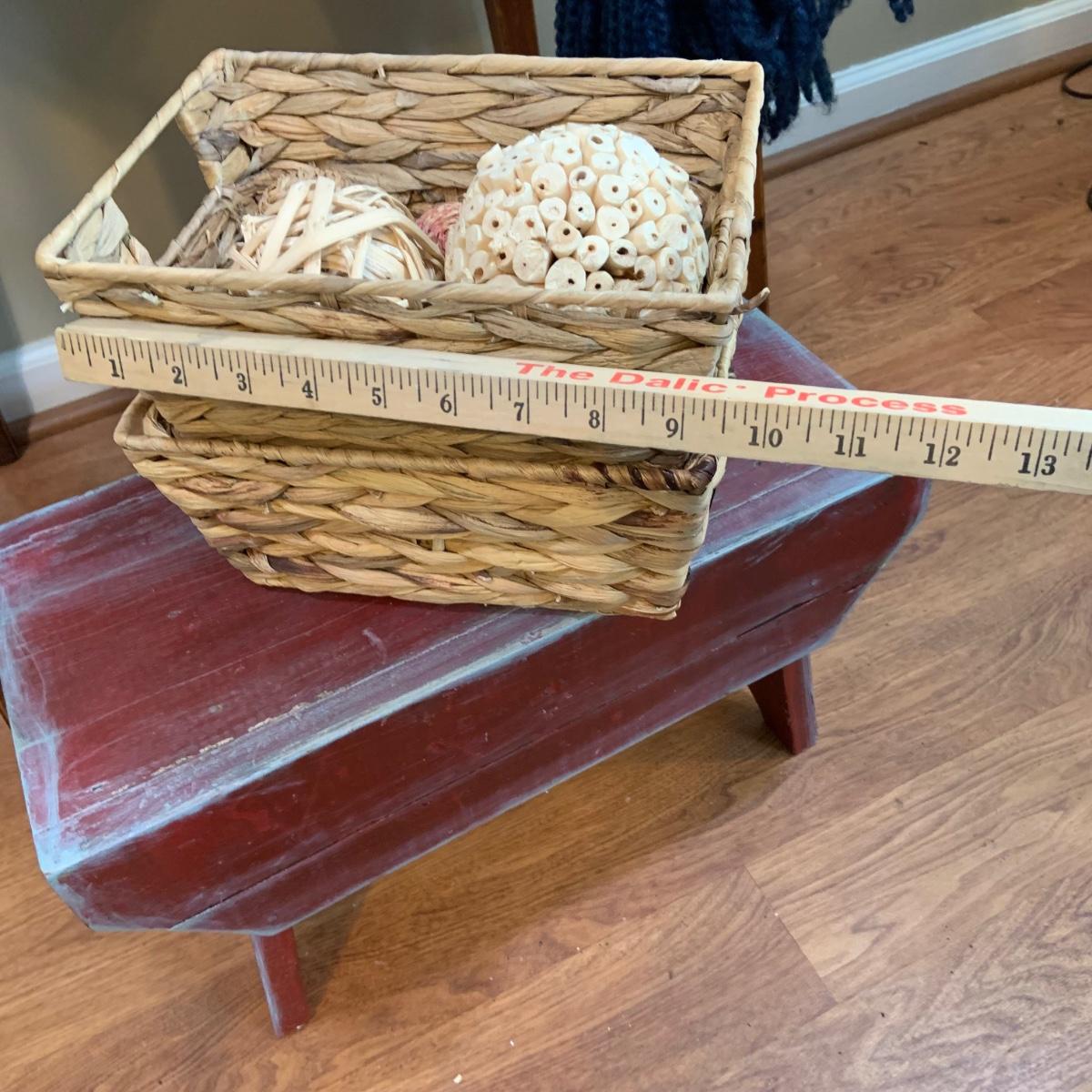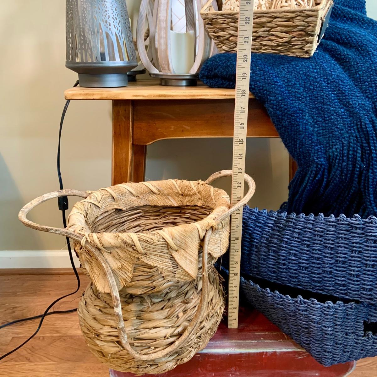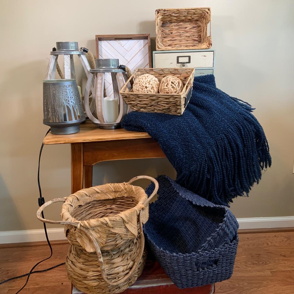 LOT:47:Baskets, Blanket and Lanterns, Featuring a Large Rustic Woven Basket, Blue Woven Baskets, Metal Lanterns, a Wax Warmer, Drawer Storage Box and More