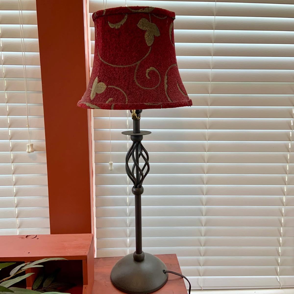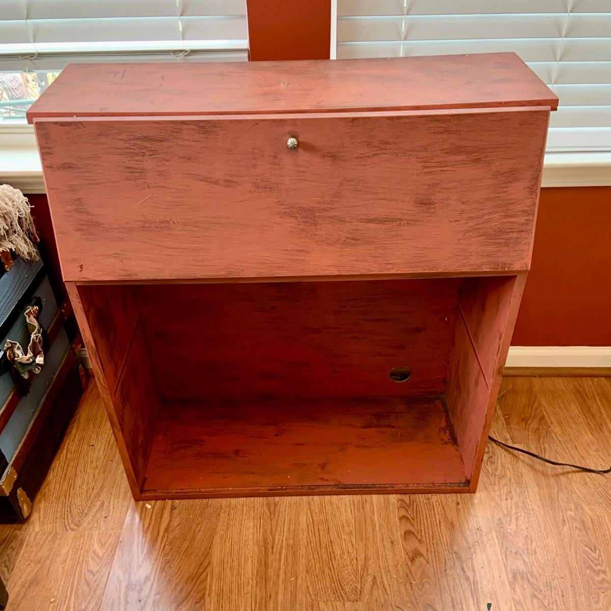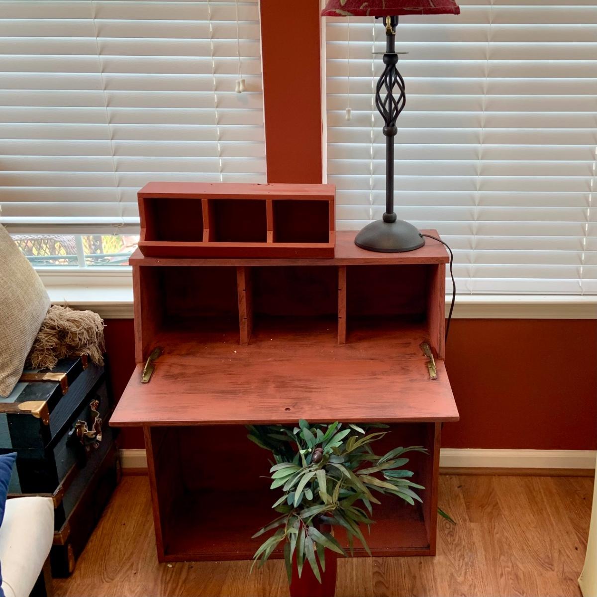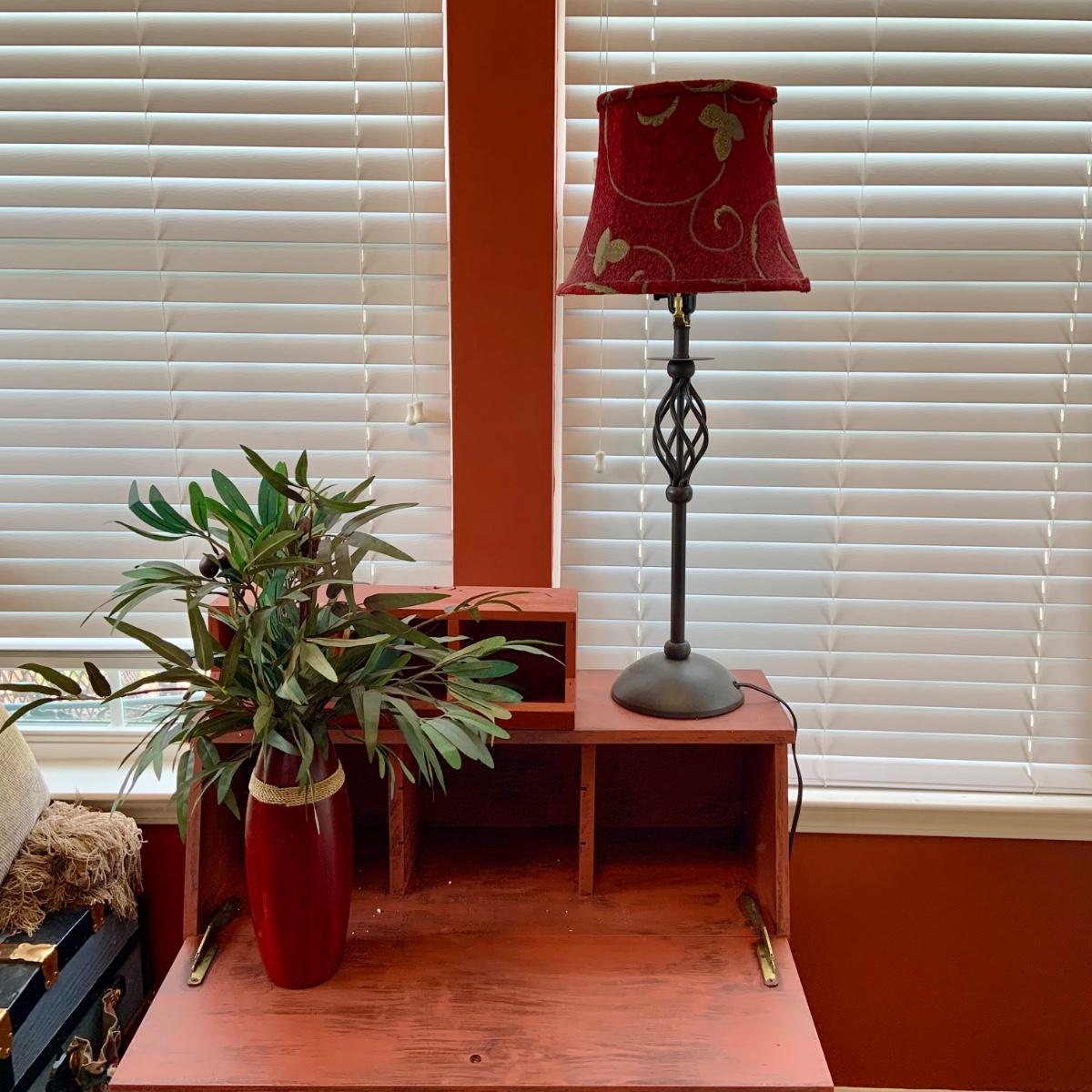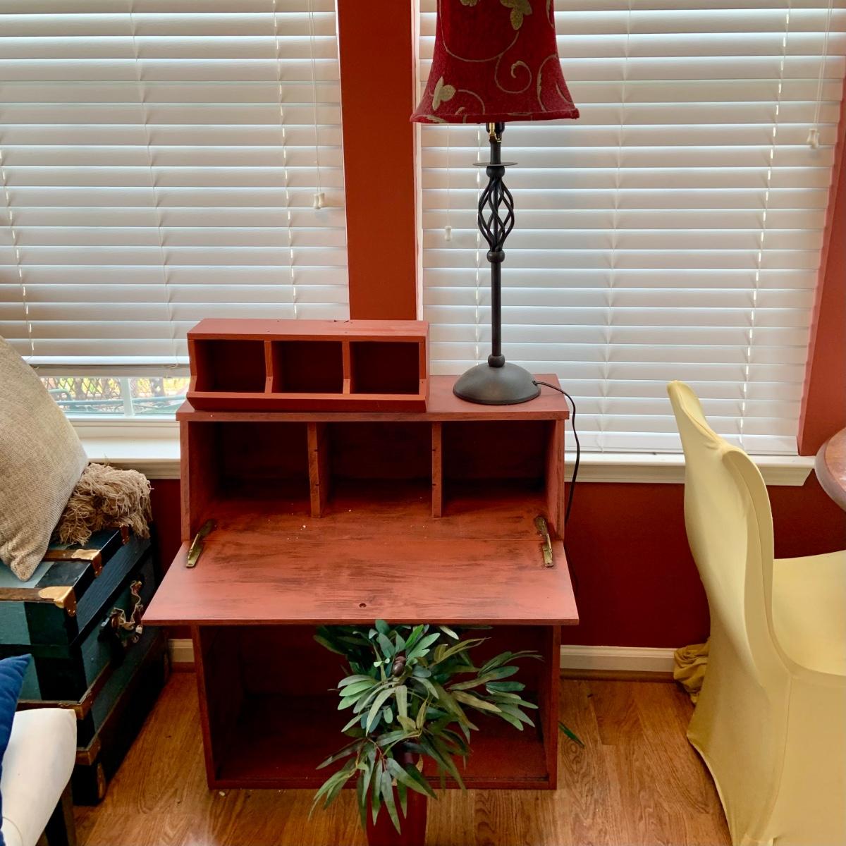 LOT48: Drop Top Desk, Storage Bin, Lamp and Faux Olive Tree