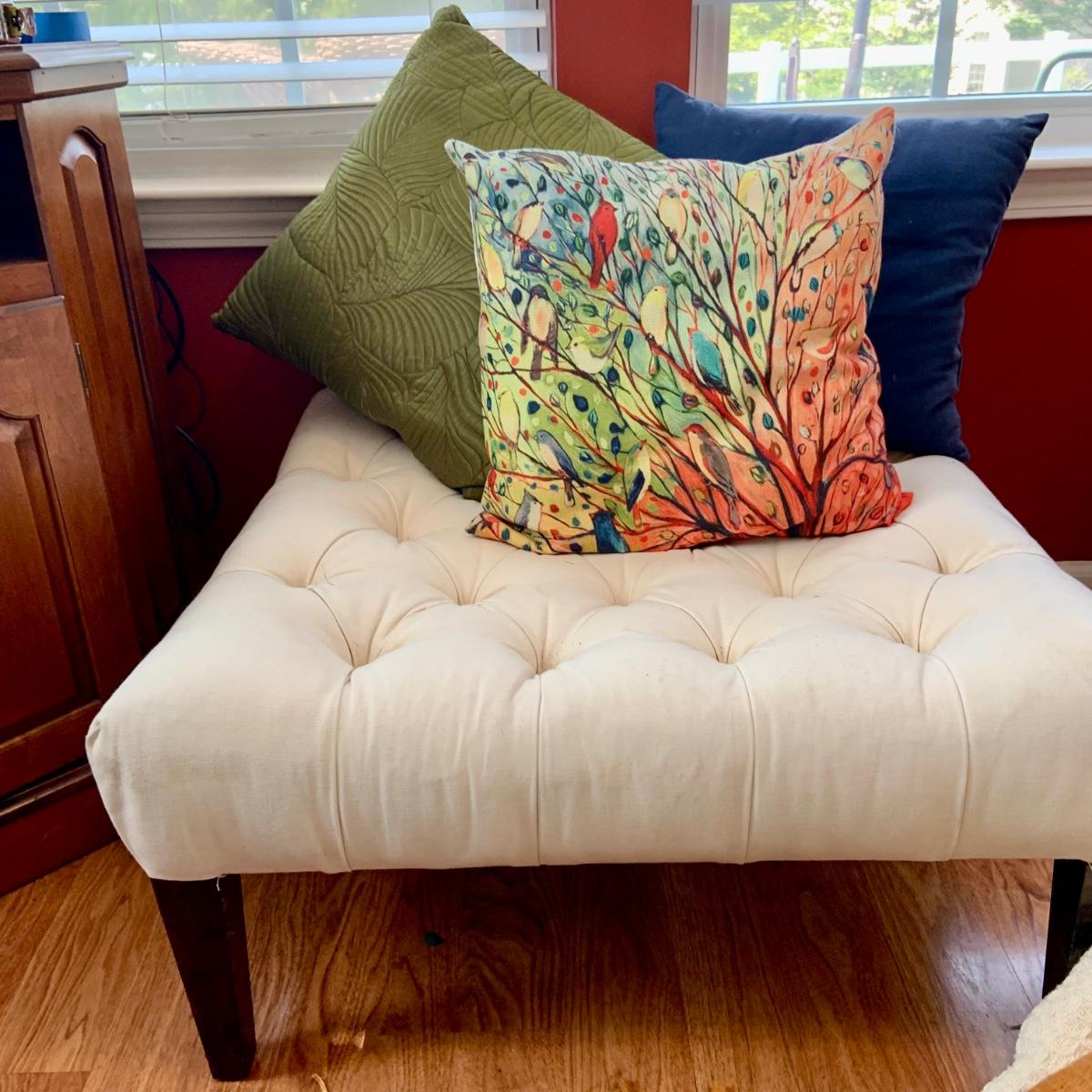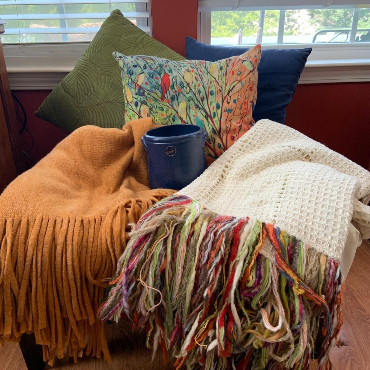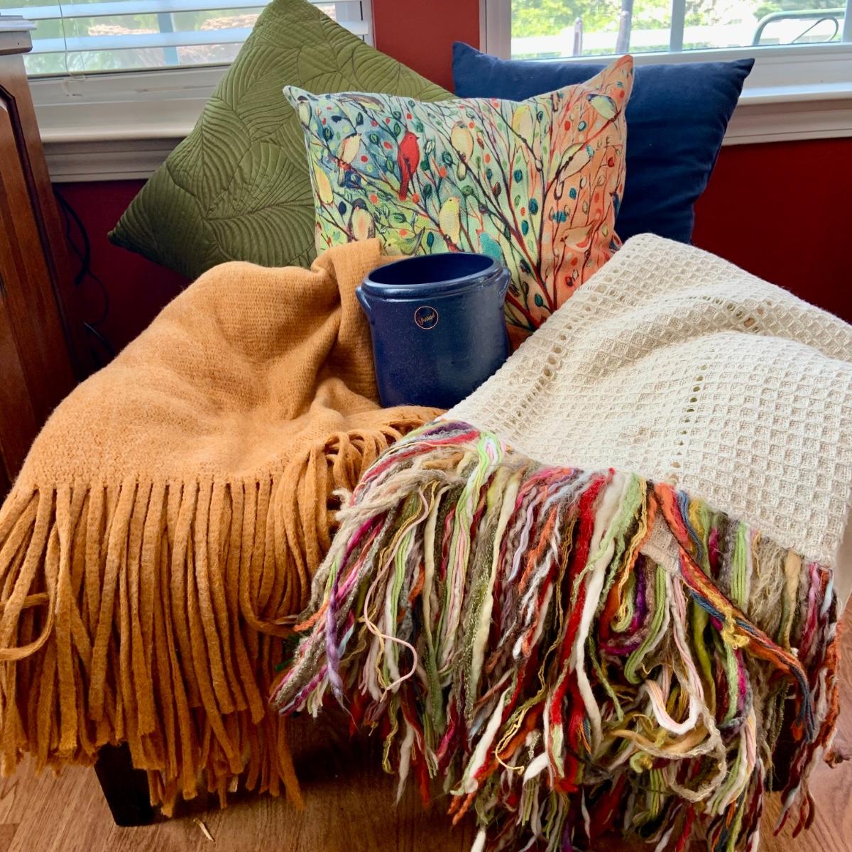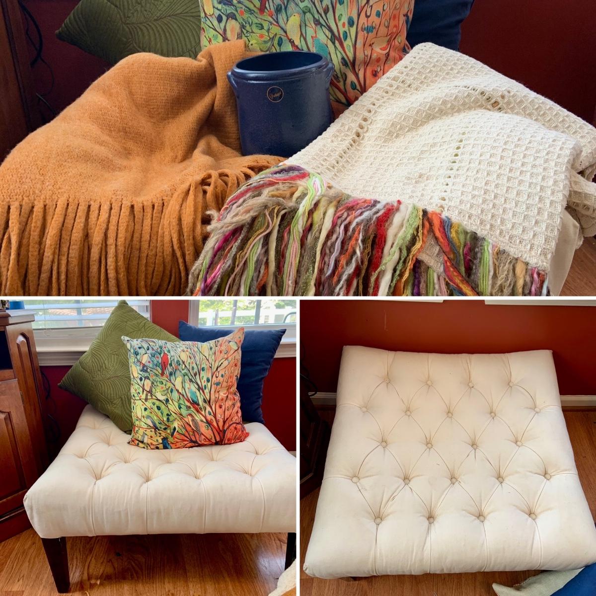 LOT:54: Tuffted White Square Ottoman with Cozy Fringed Blankets, Pillows and More