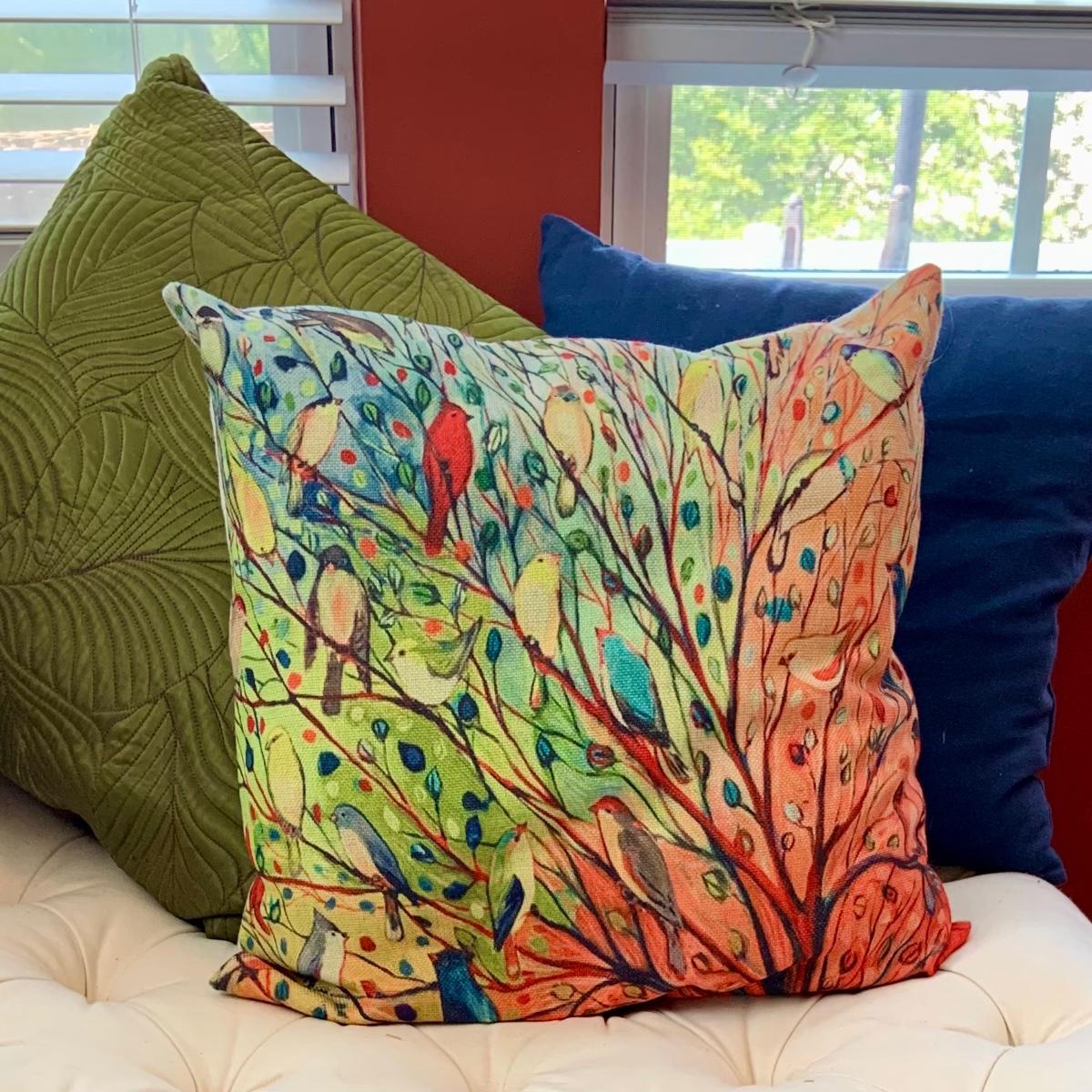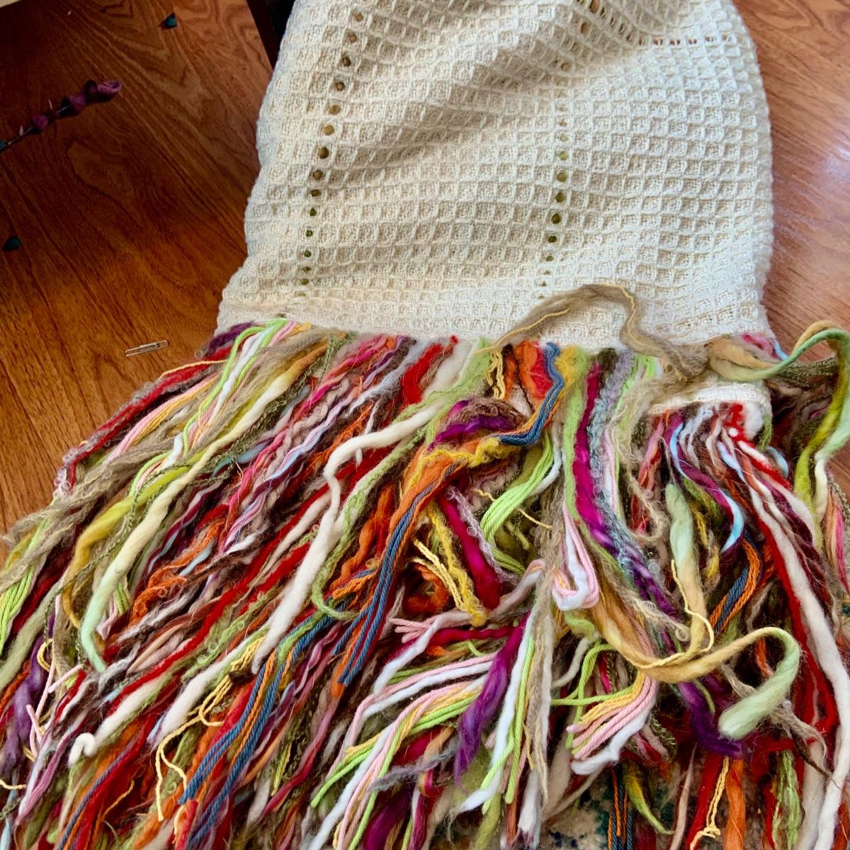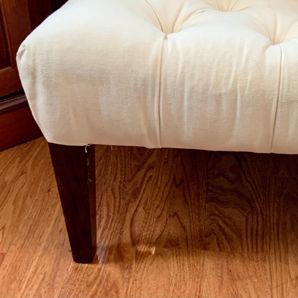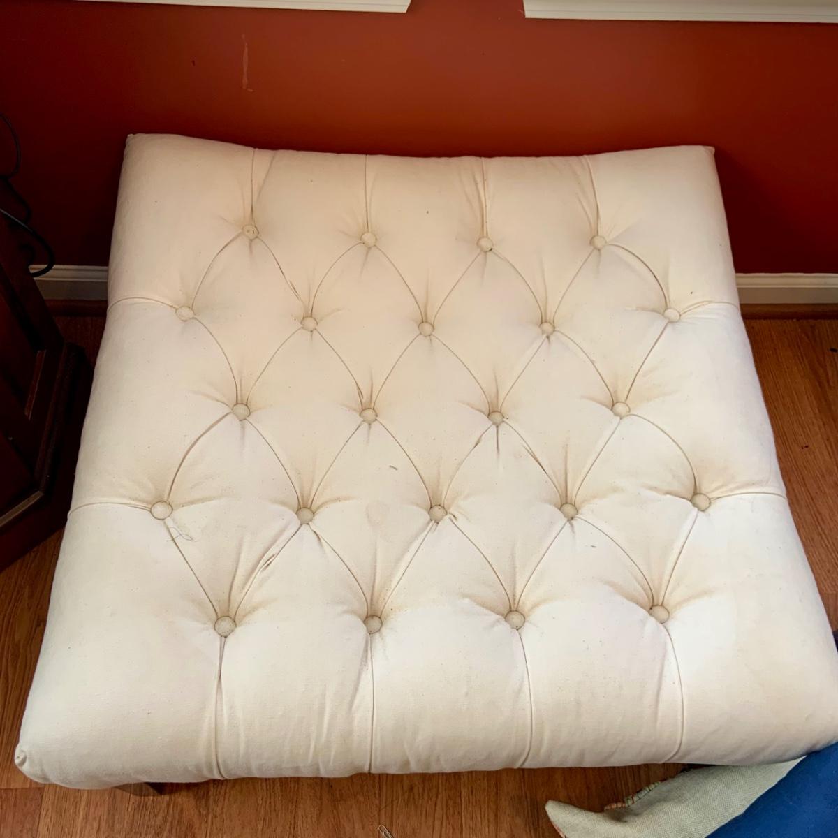 LOT:54: Tuffted White Square Ottoman with Cozy Fringed Blankets, Pillows and More