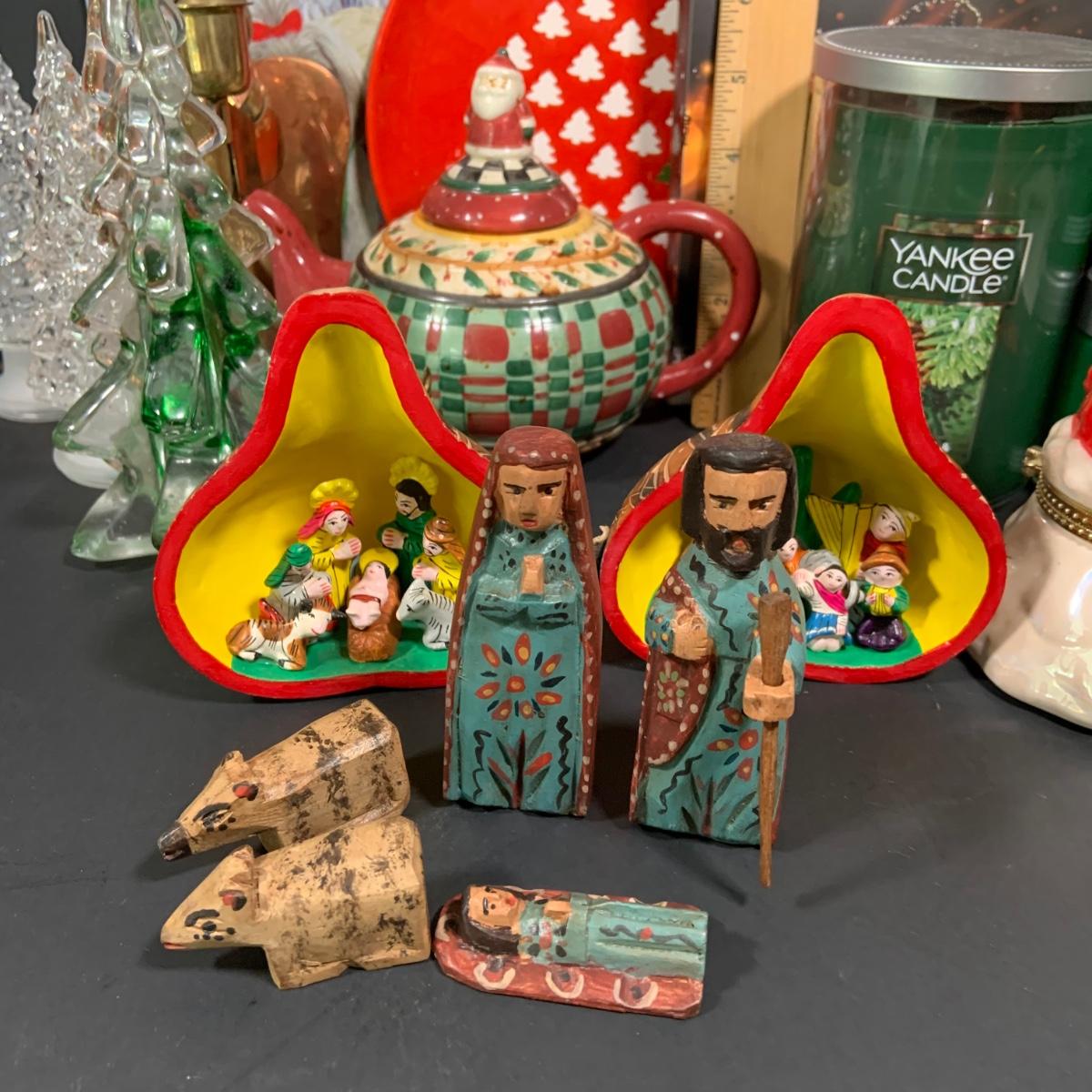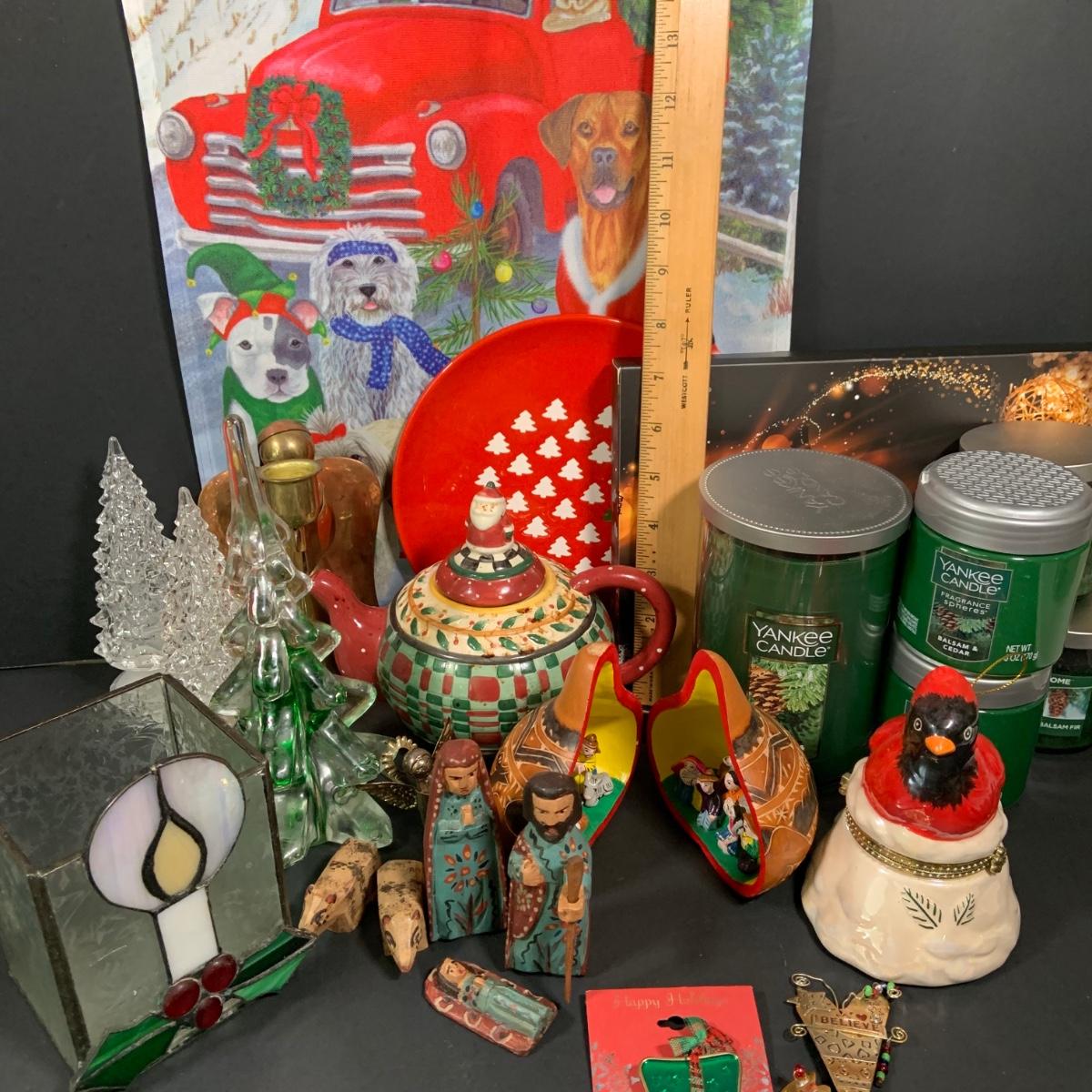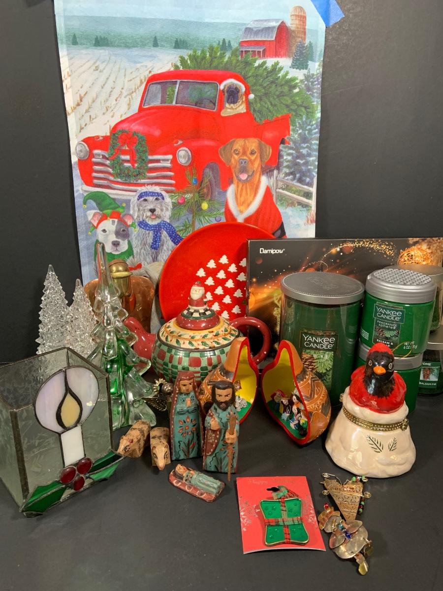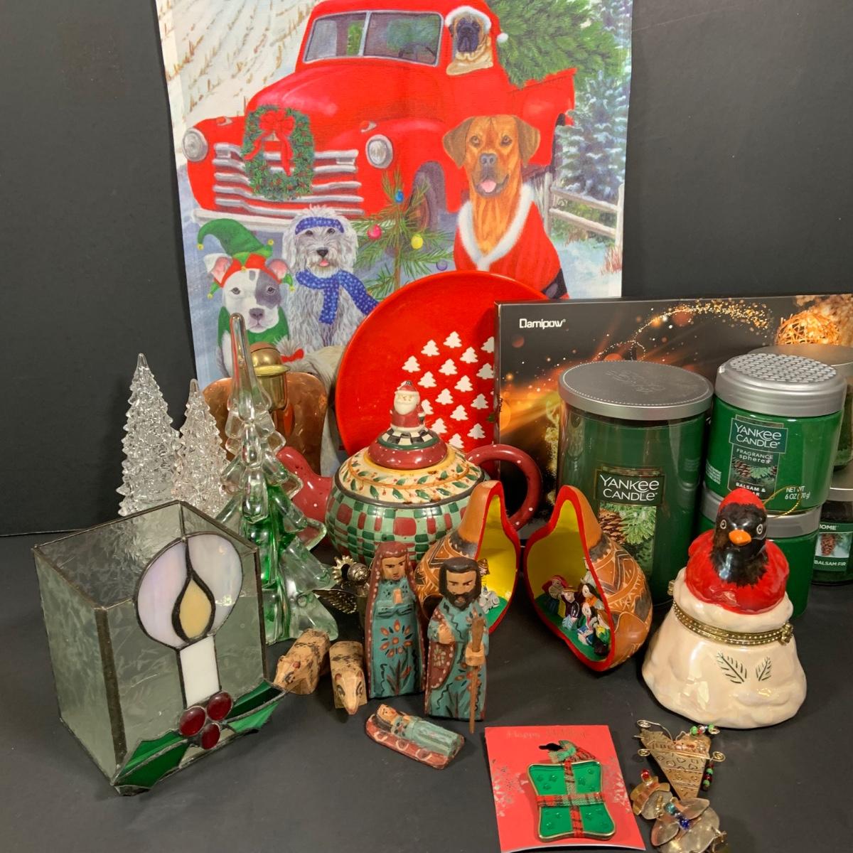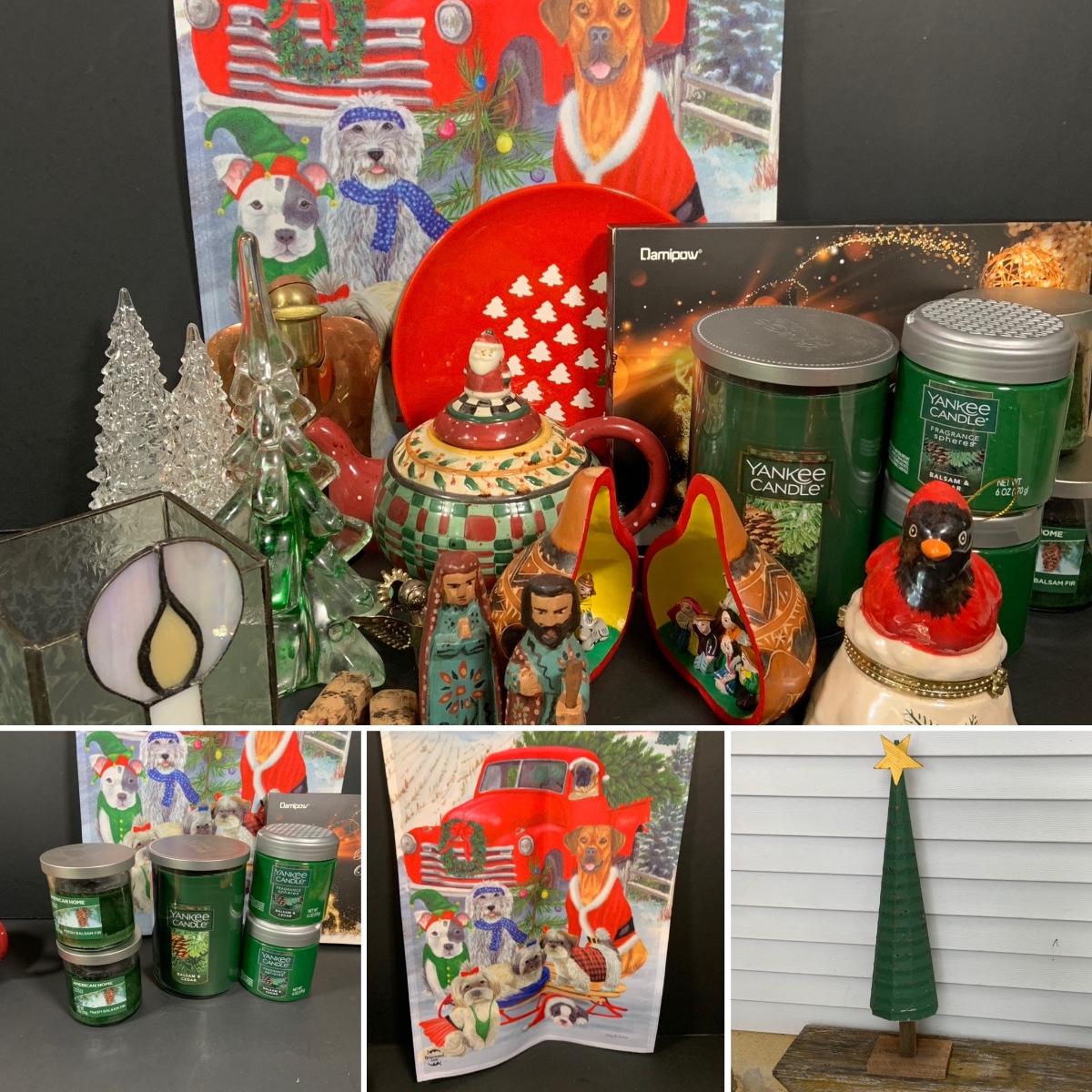 LOT:61: Holiday Christmas Decor and More Featuring Balsam Candle and Air Freasheners by Yankee and Other, Large Rustic Wooden Christmas Tree and Much More
