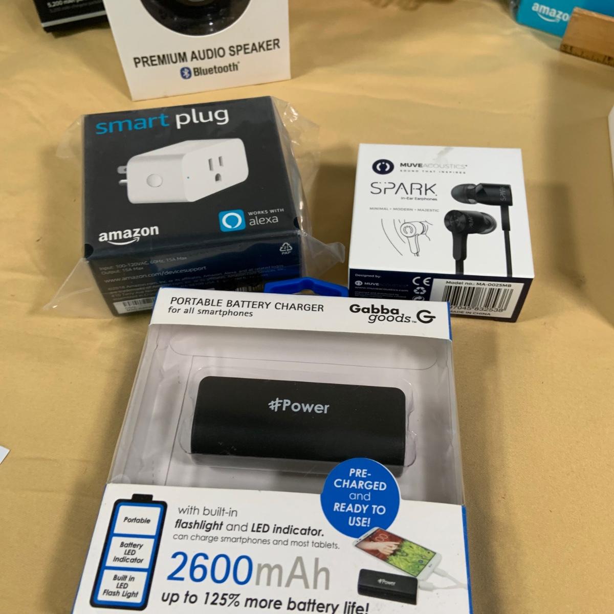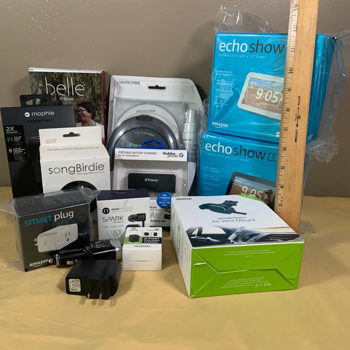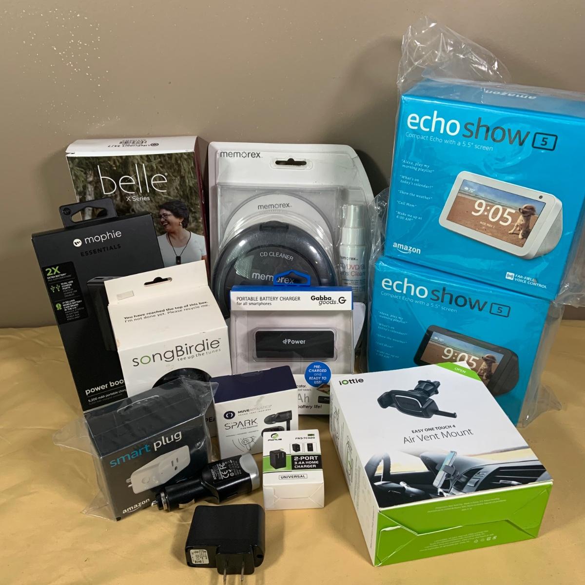 LOT:67: An Assortment of New or Unused Gagets Featuring 2 Amazon Echo Show (5) Belle Medical Alert, Speakers, Charges and Much More