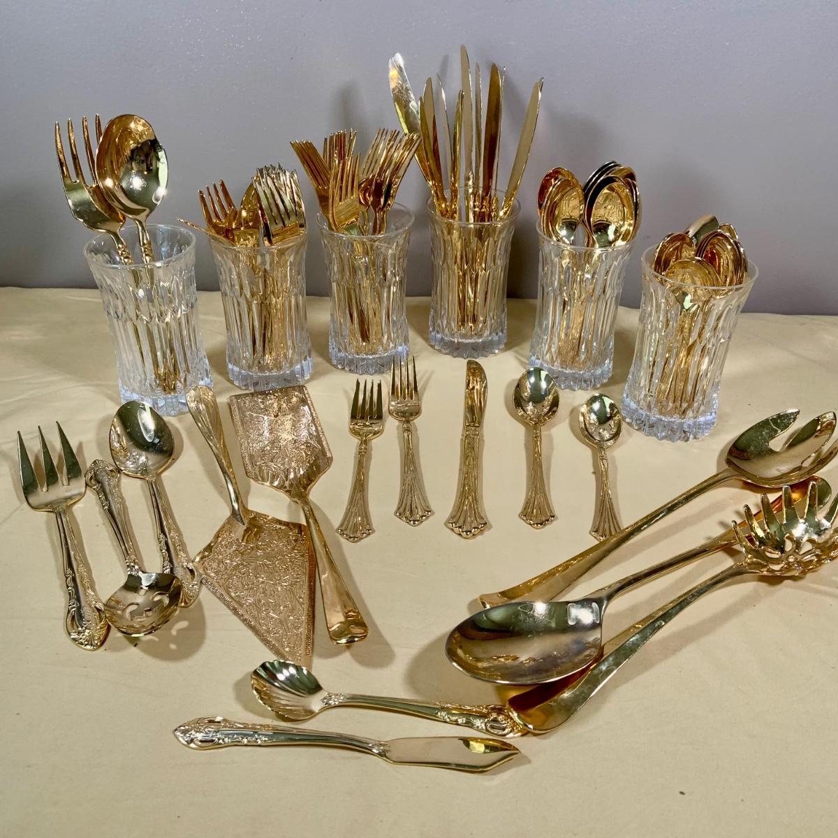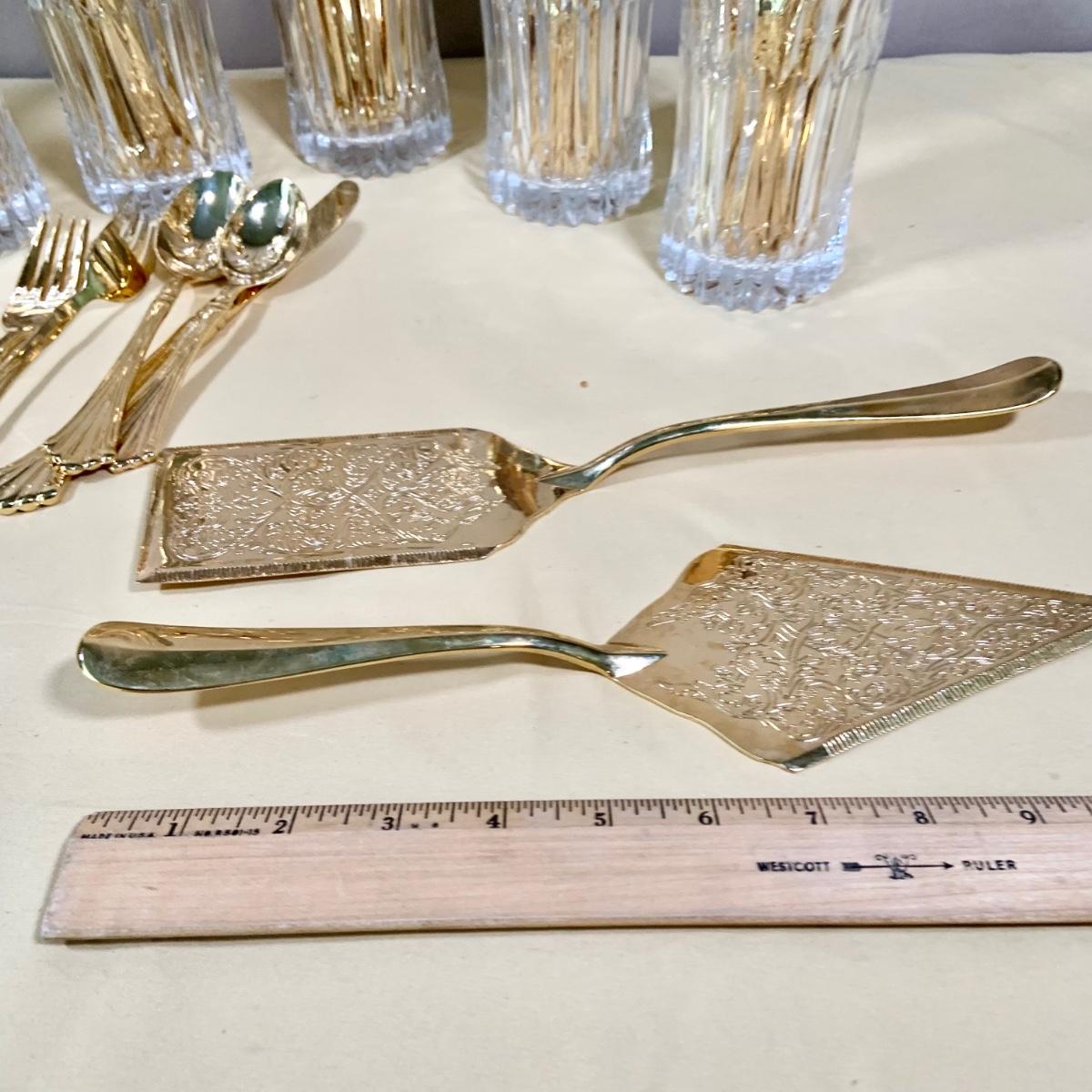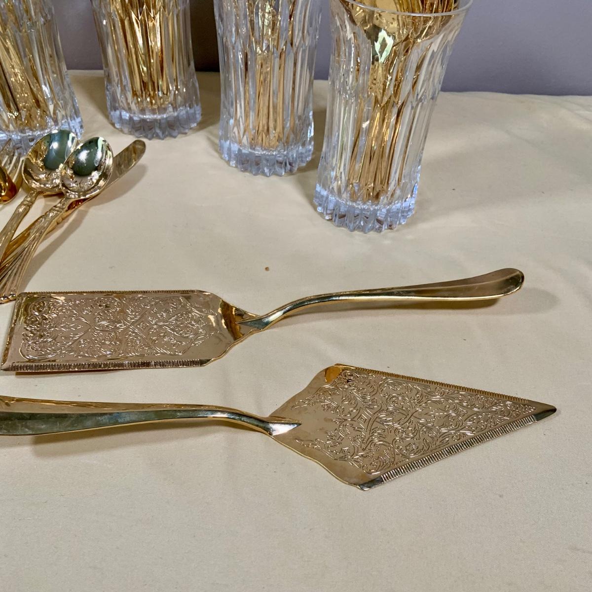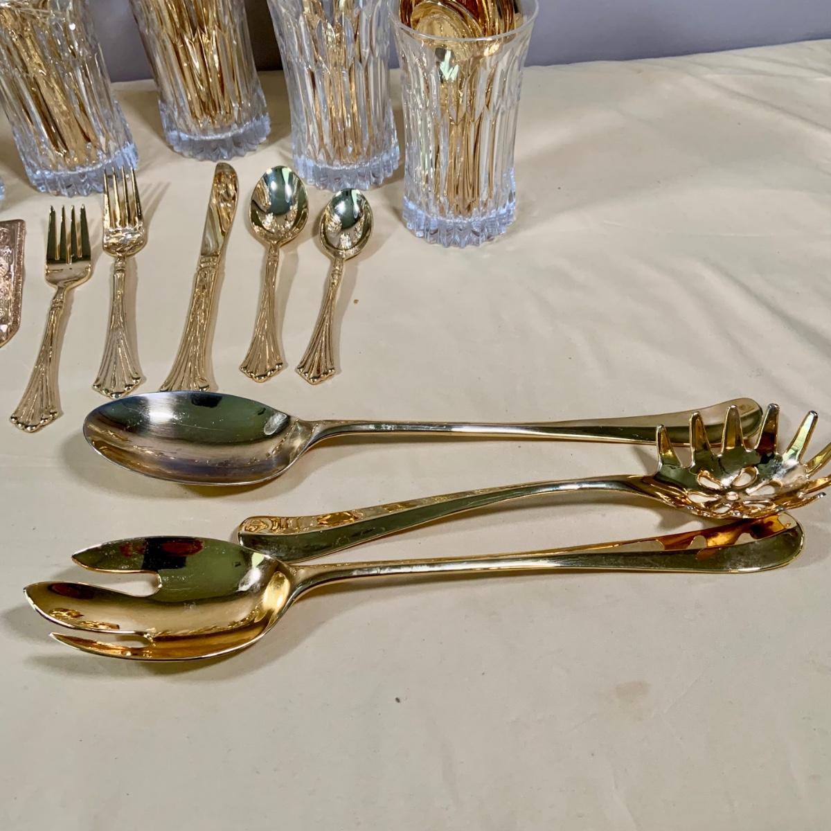 LOT:68: Goldtone Flatware and Service Set and Set of 6 Glasses