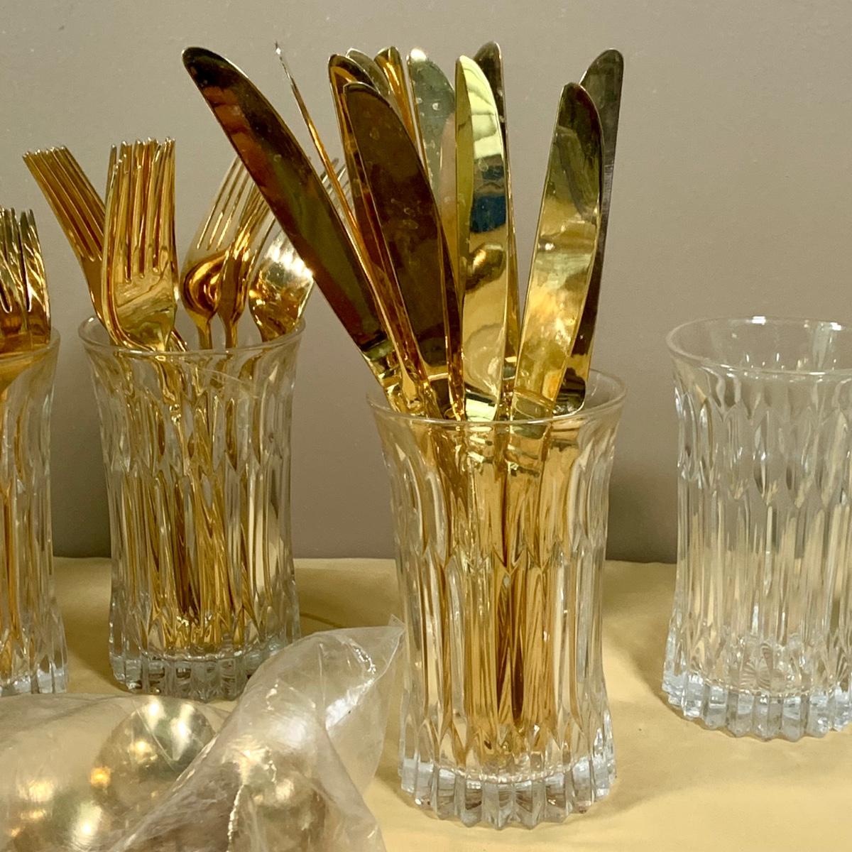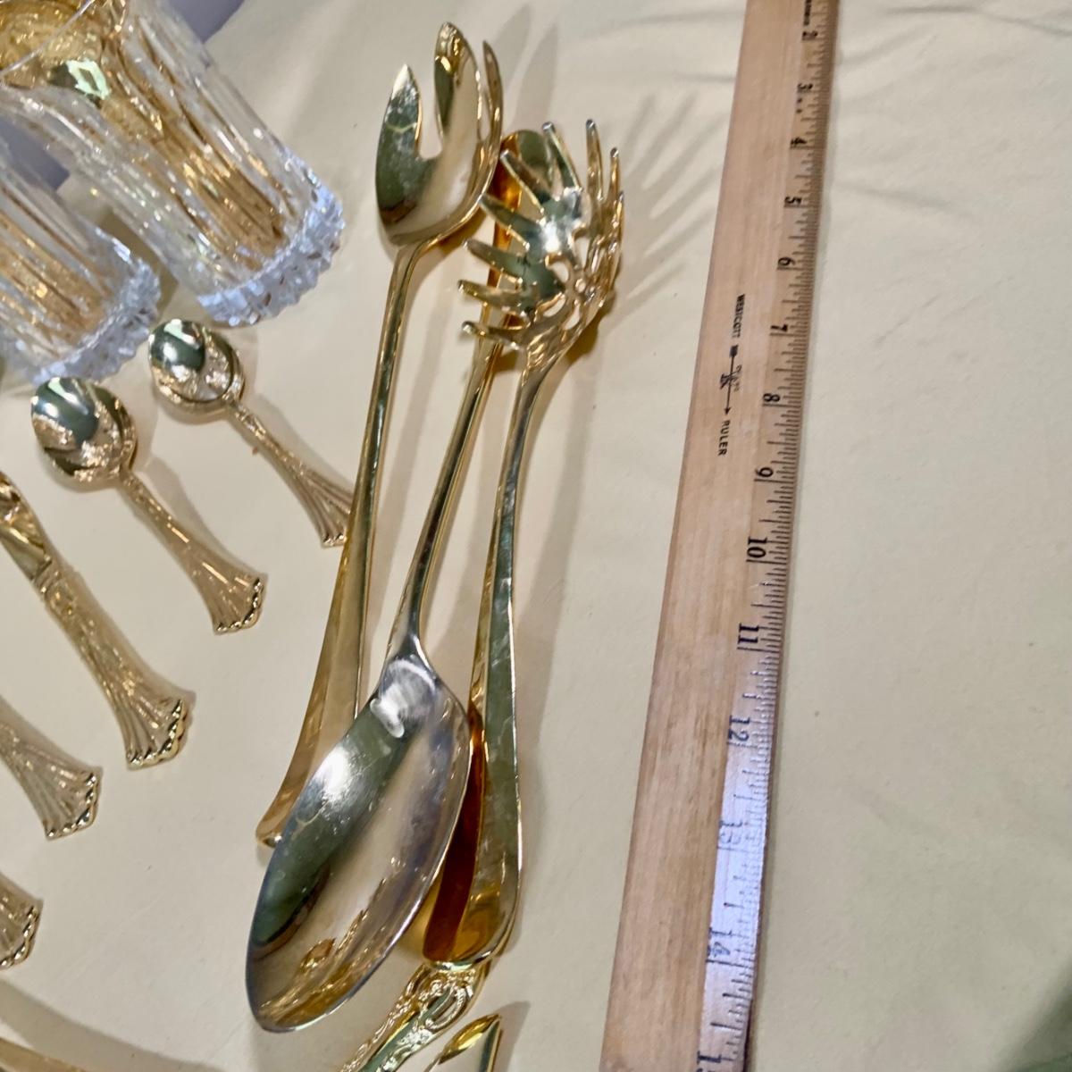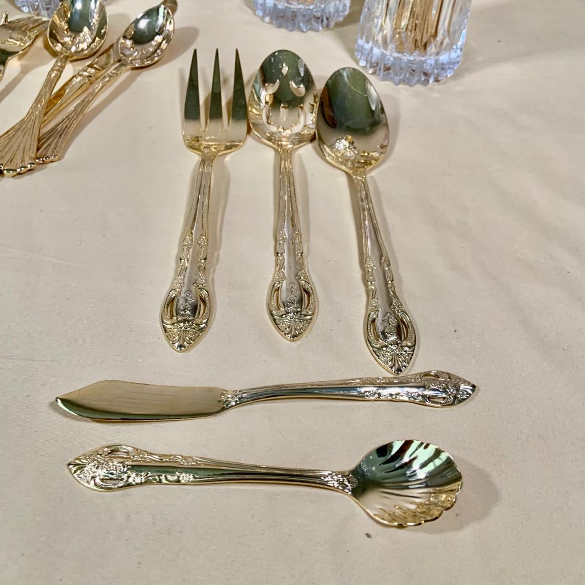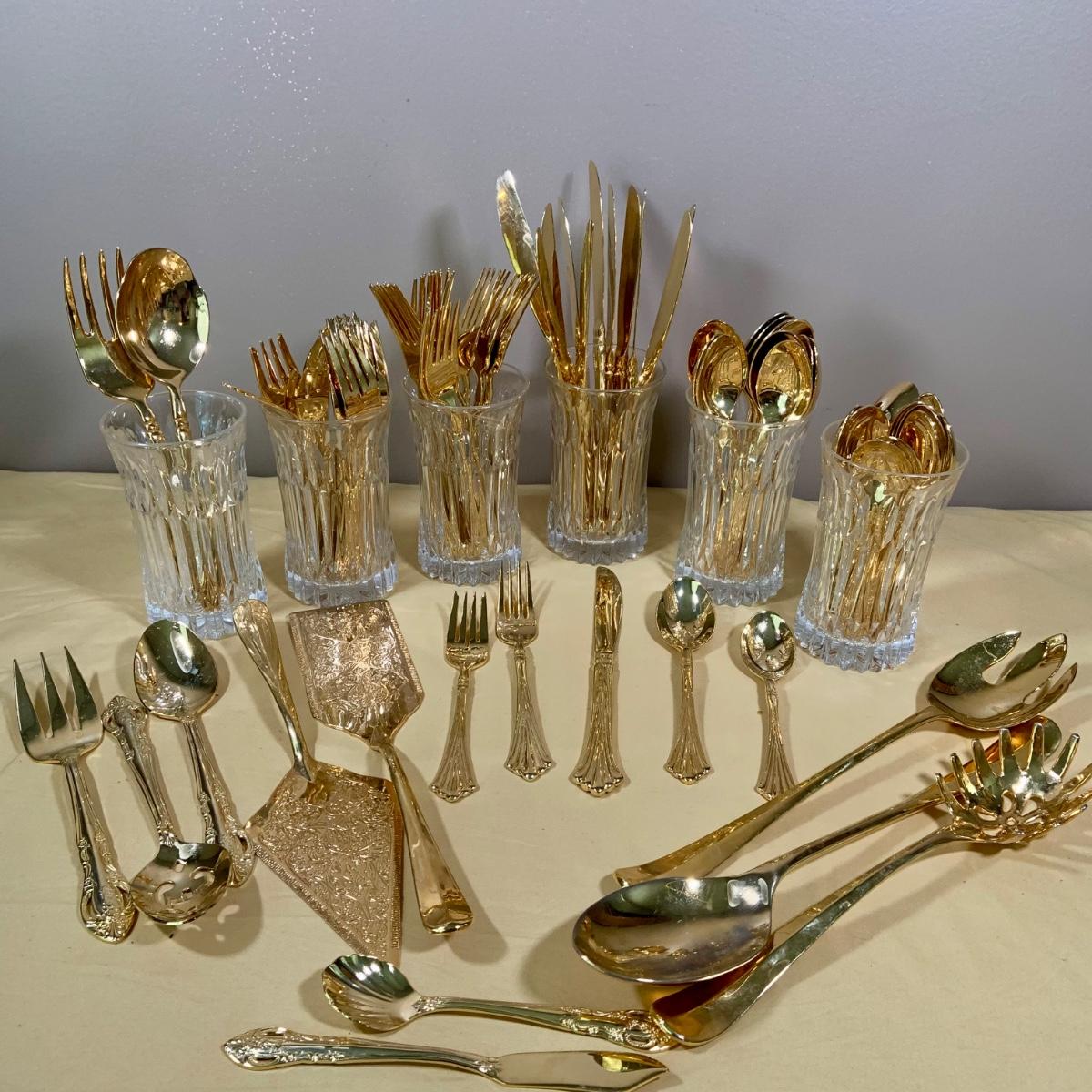 LOT:68: Goldtone Flatware and Service Set and Set of 6 Glasses