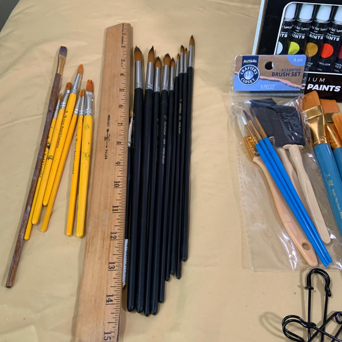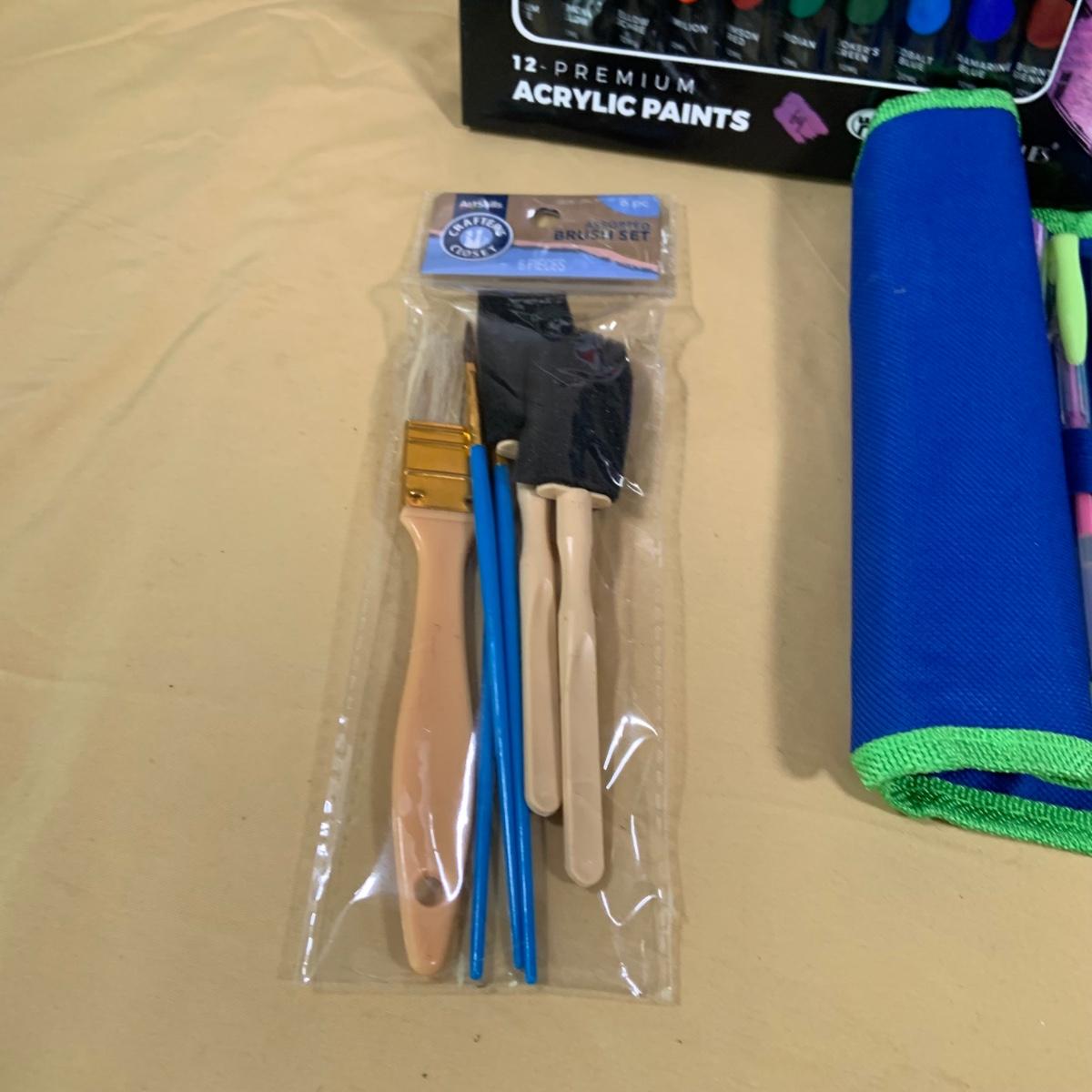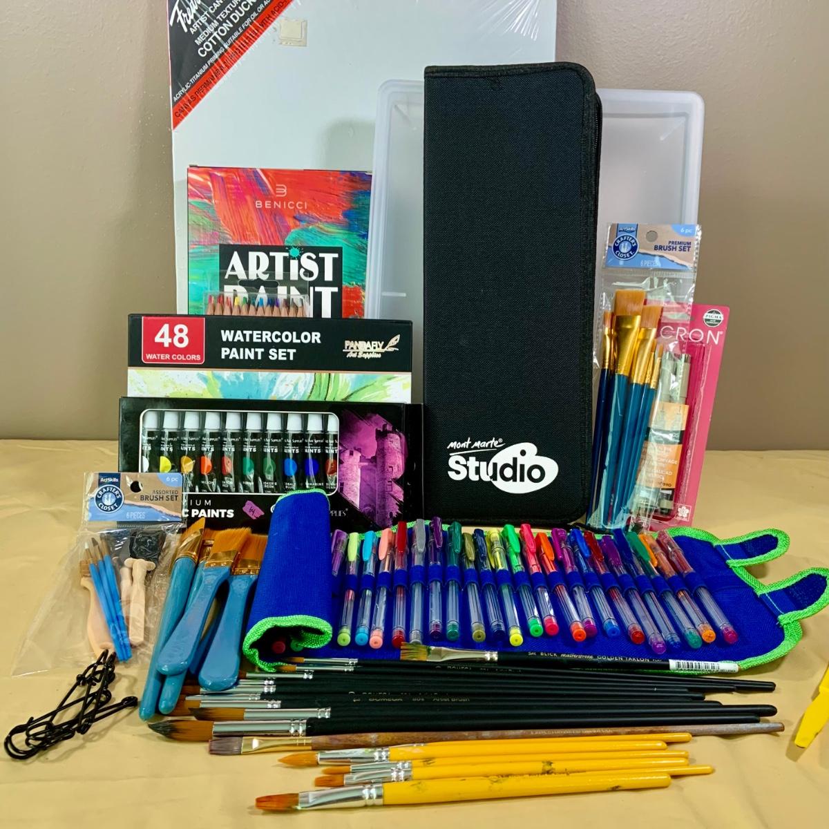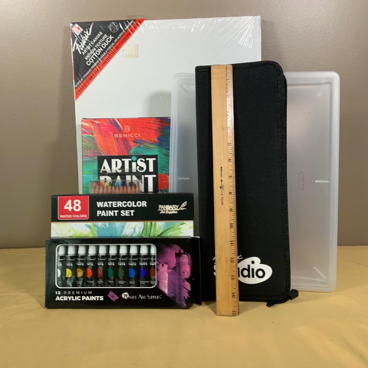 LOT69:: Selection of Art Supplies Most New or Unused Including Canvas, Brushes, Water Color and Acrylic Paint and More