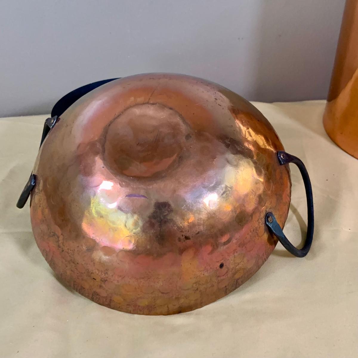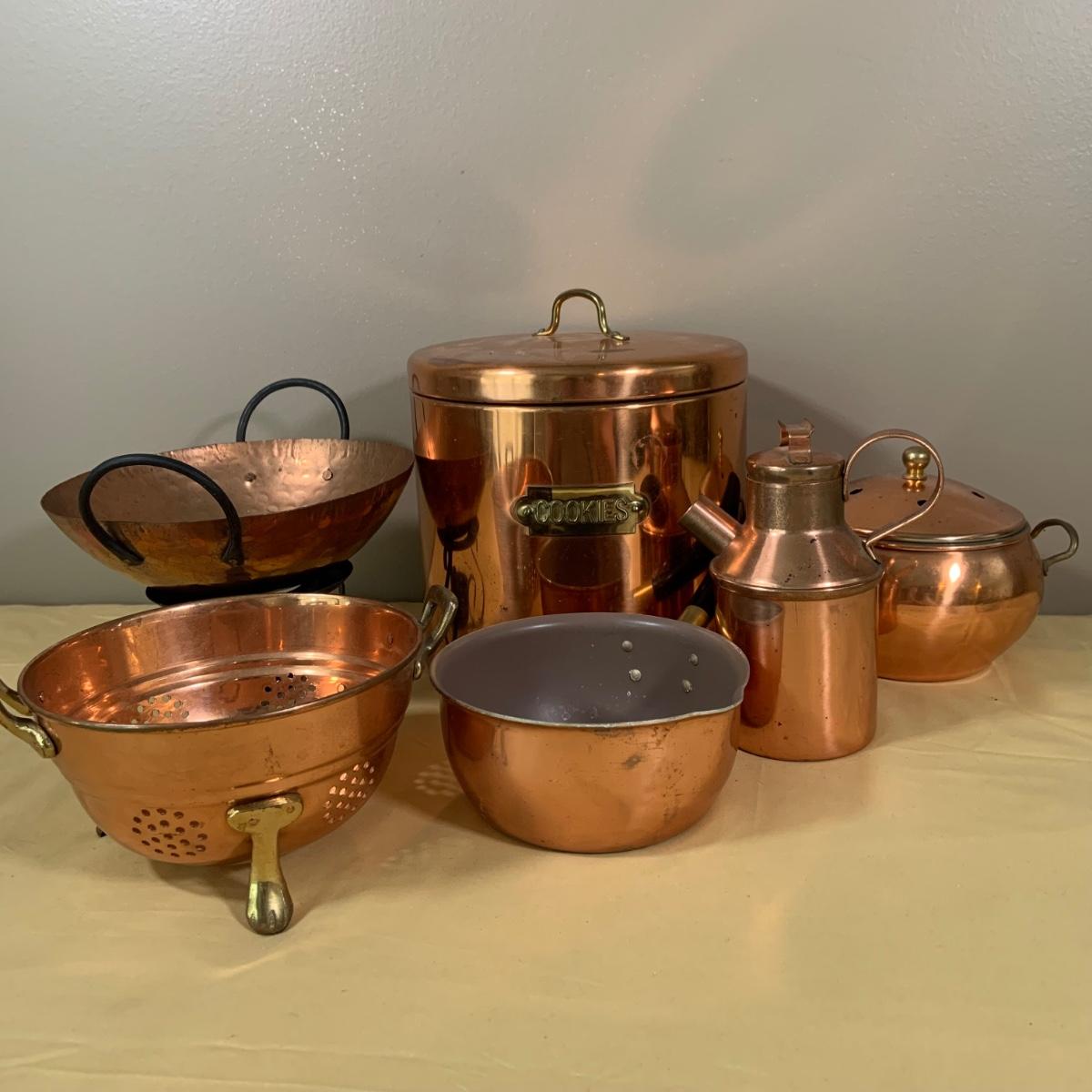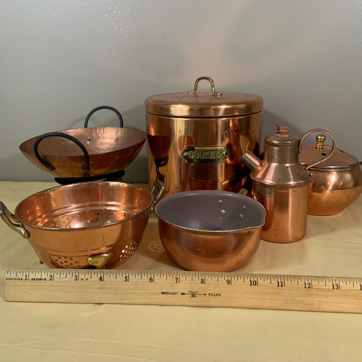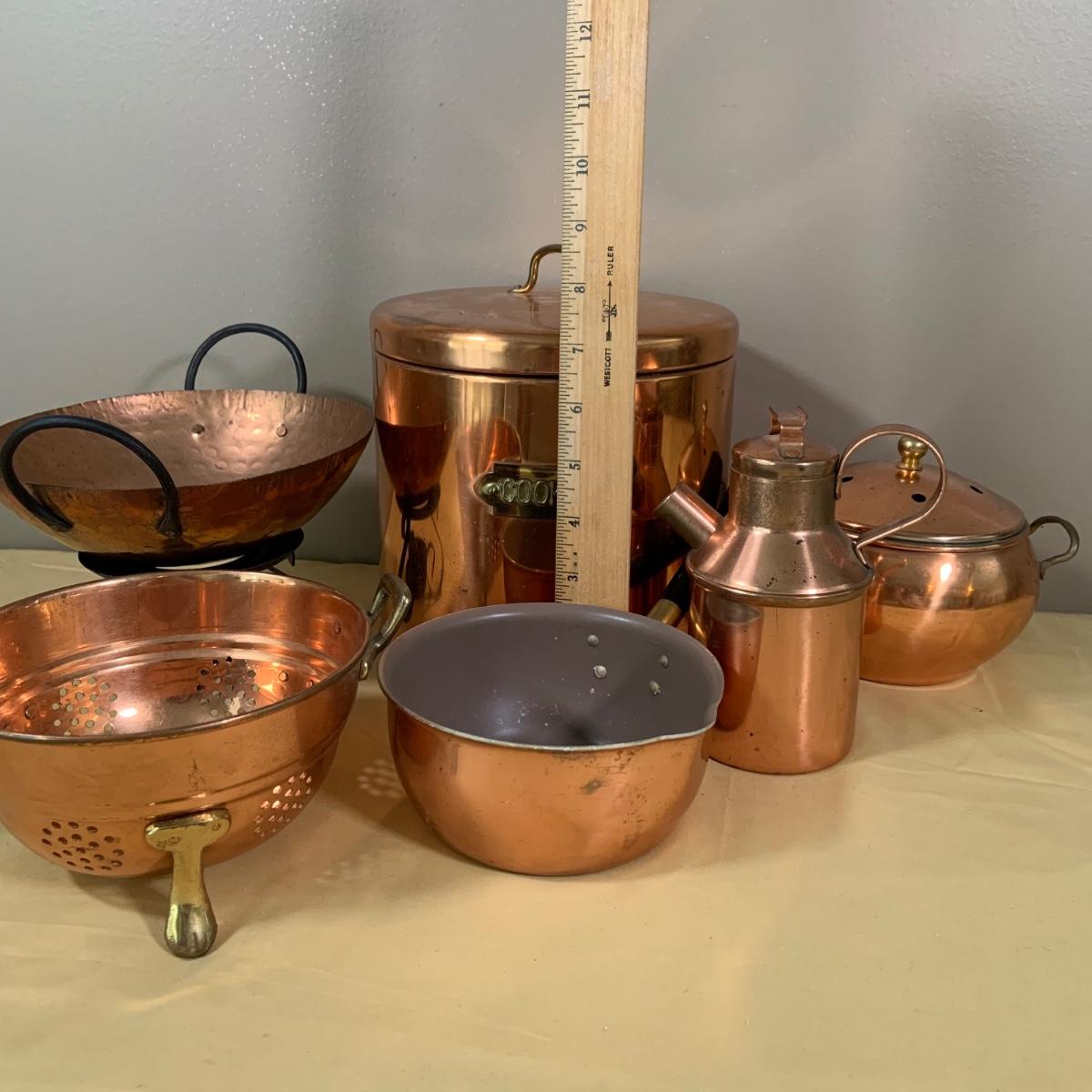 LOT:71: Copper Canisters, Calander, Pan, Bowl and Milk Jug/Creamer