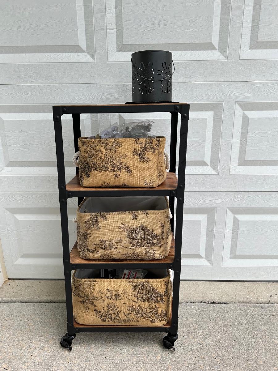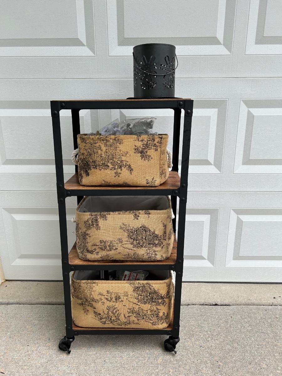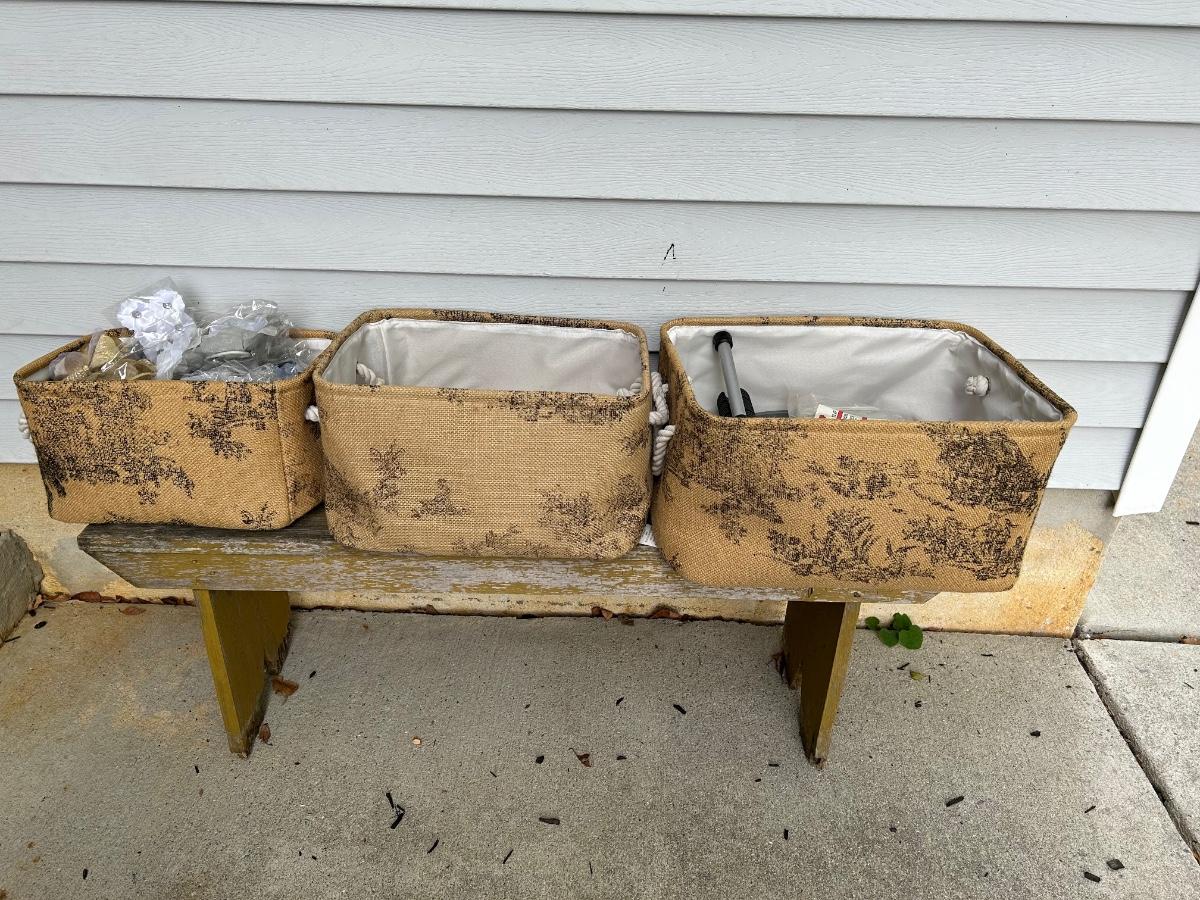 LOT 90: 41” Storage Table & Baskets- Filled With Craft and Home Basics