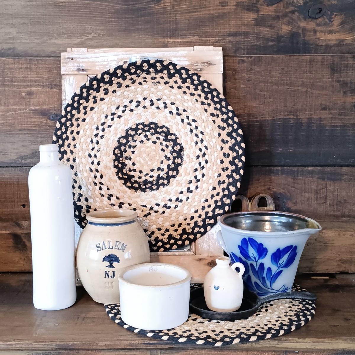 LOT 123: Collection of Vintage Pottery w/ Woven Placemats, Window Frame & More