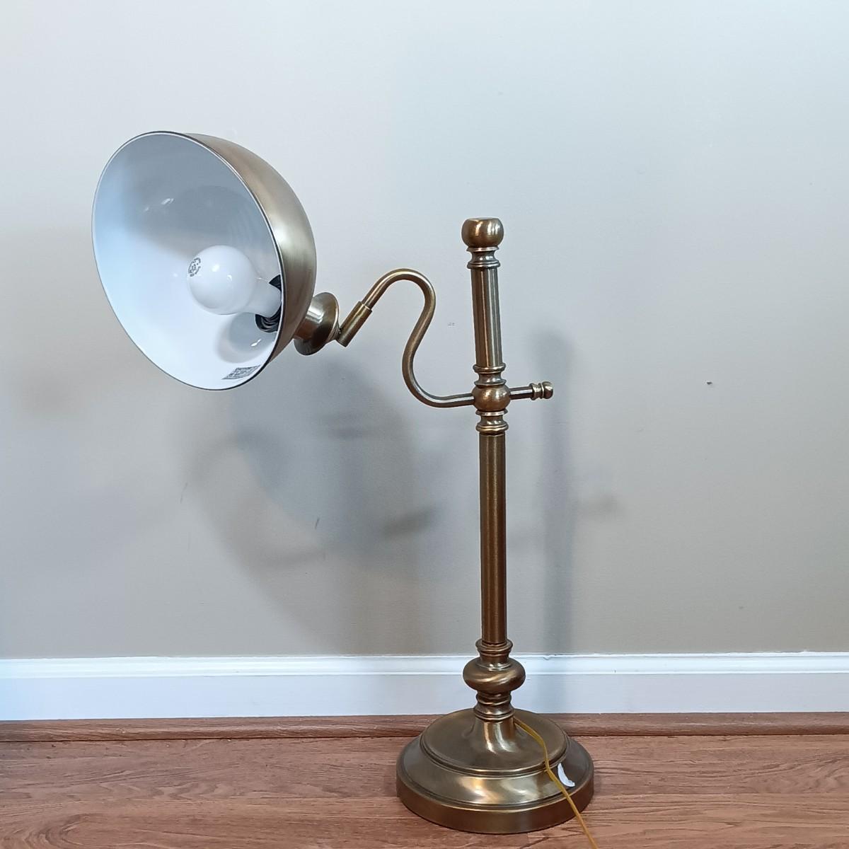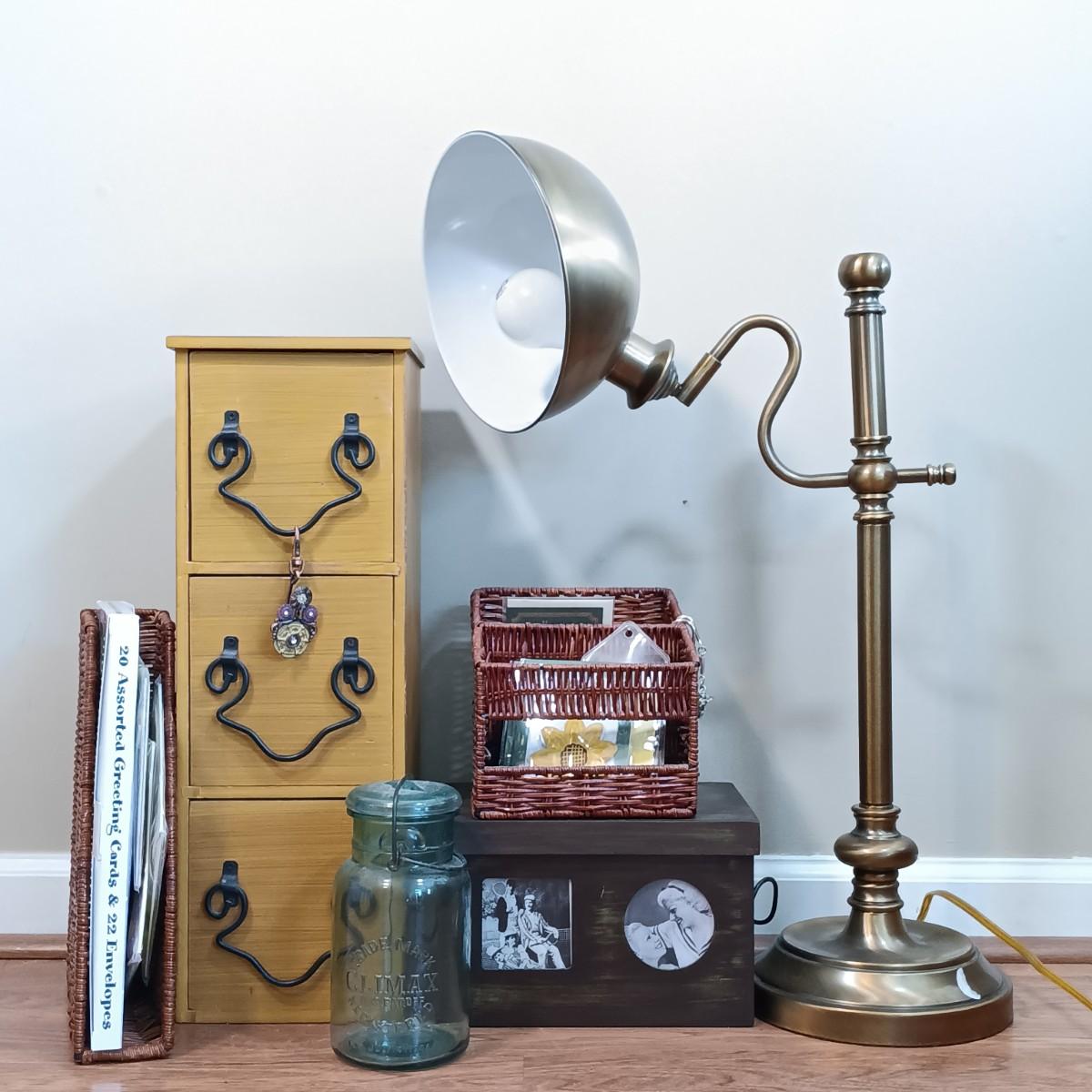 LOT 127: Industrial Curved Brass Table Lamp w/ Office Accessories & More