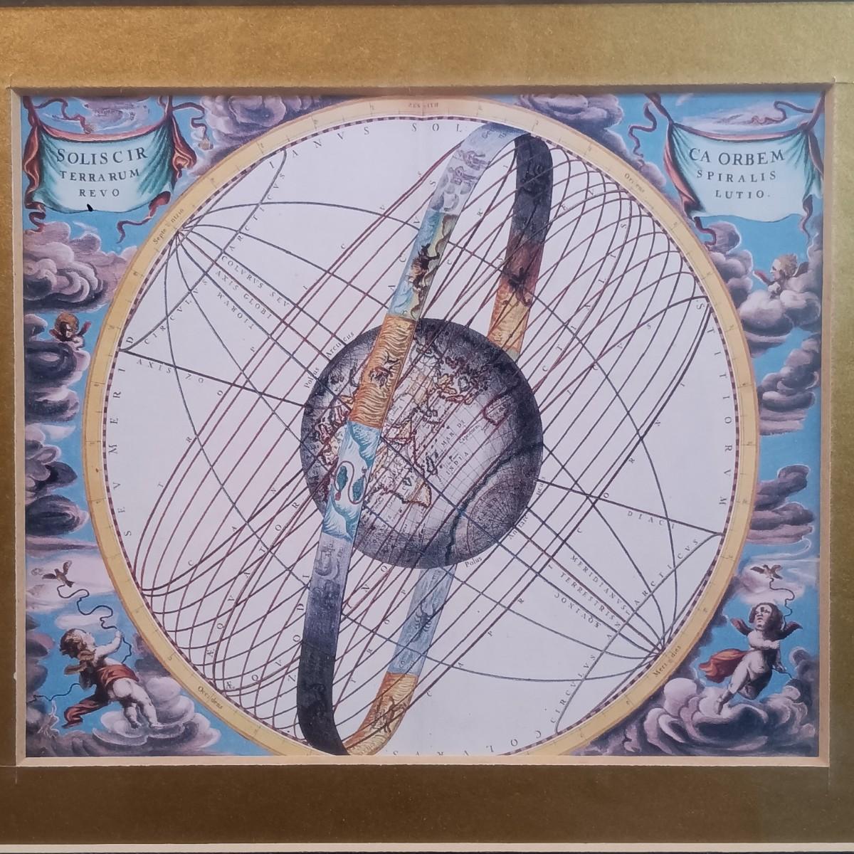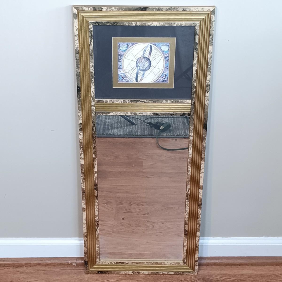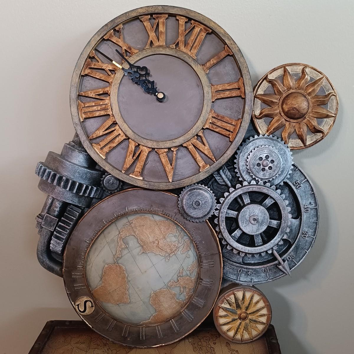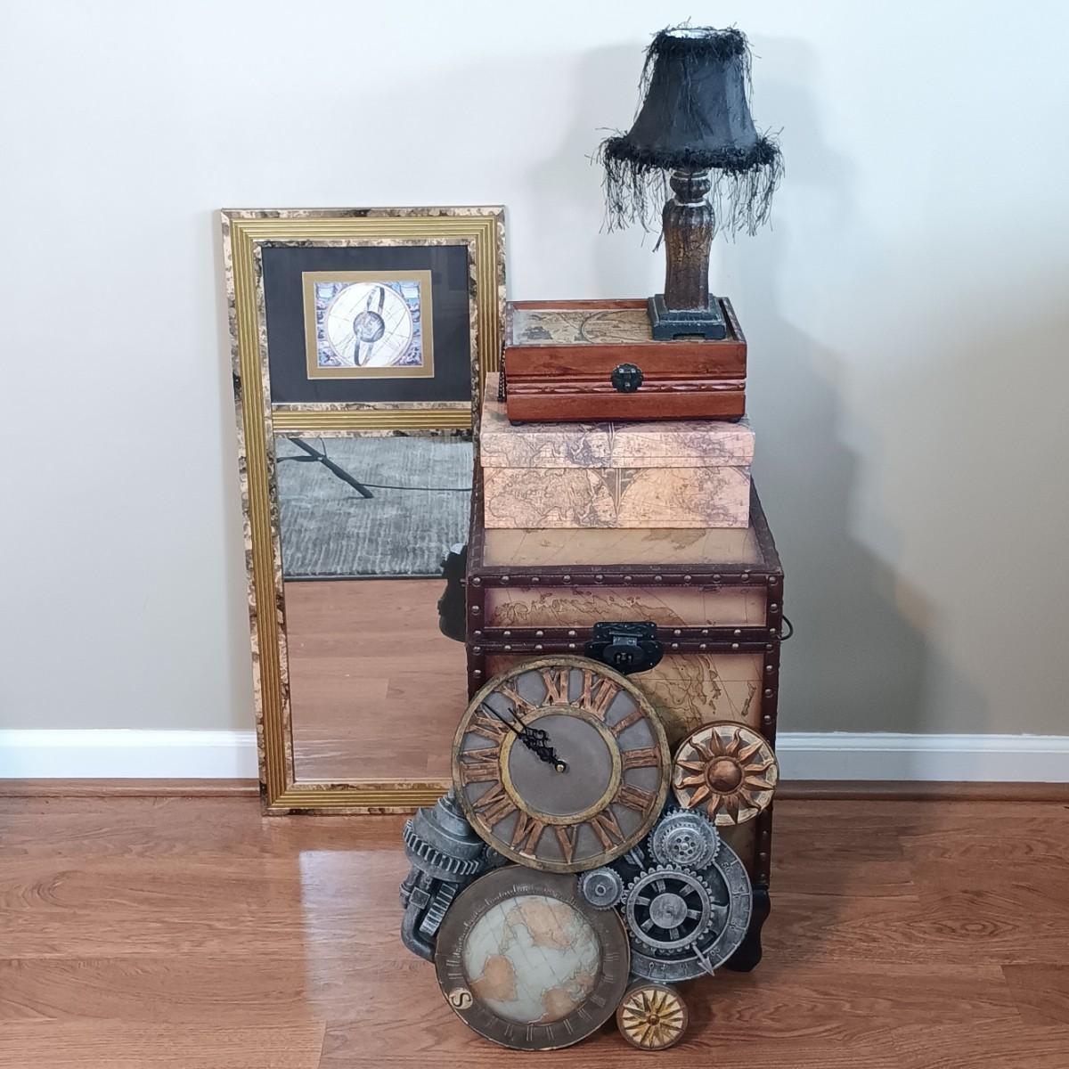 LOT 129: Gilt Framed Earth Rotation Chart Mirror w/ Storage Boxes, Steampunk Wall Clock & Lamp