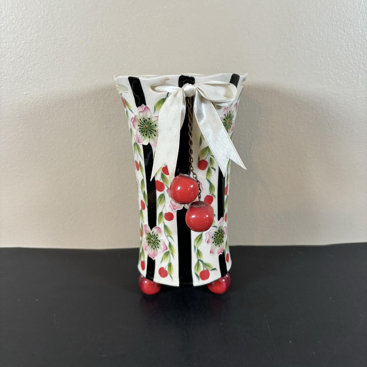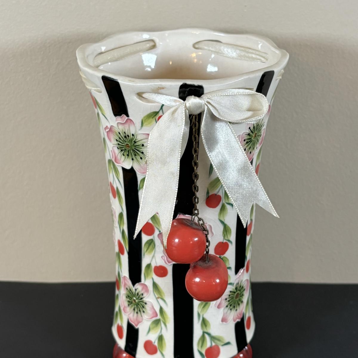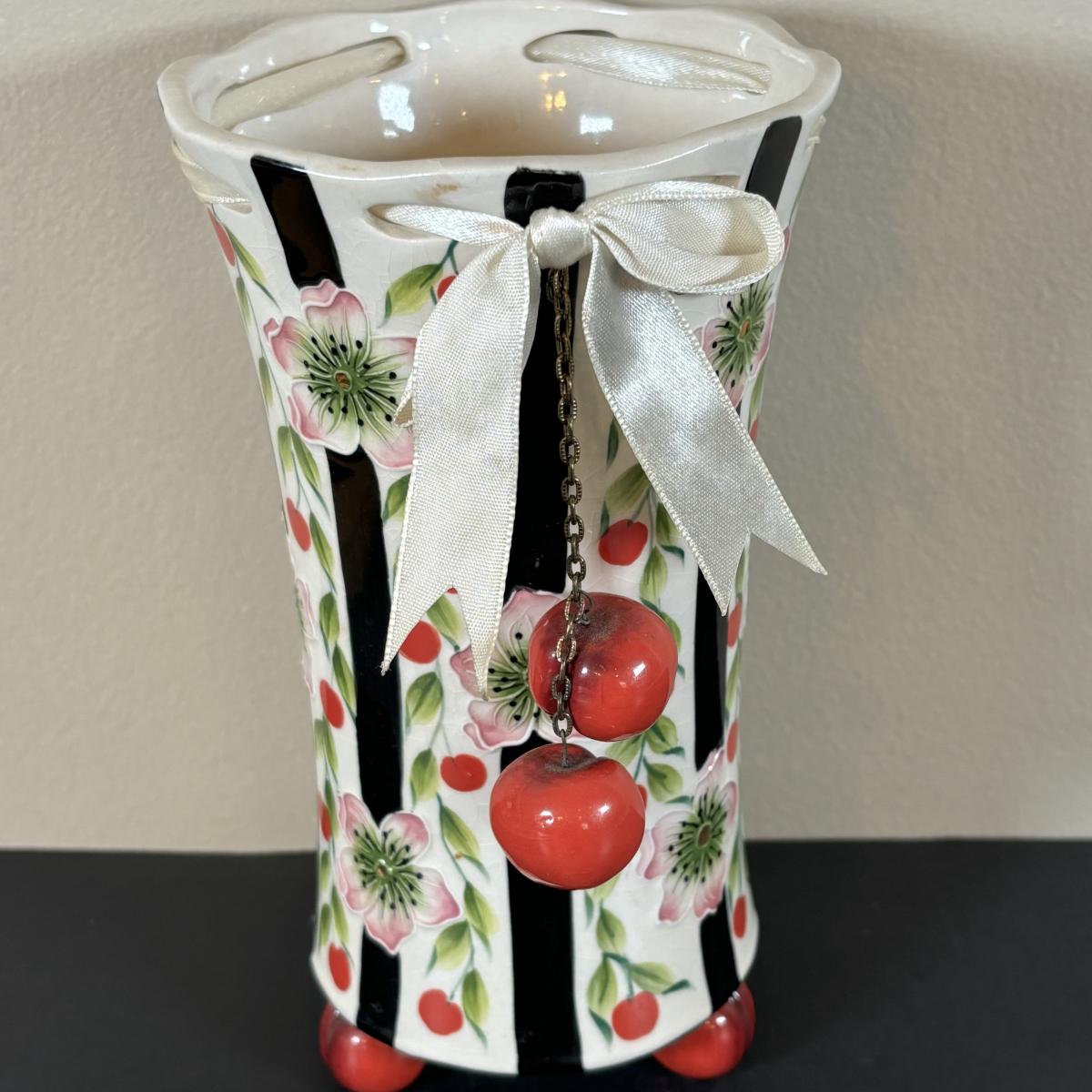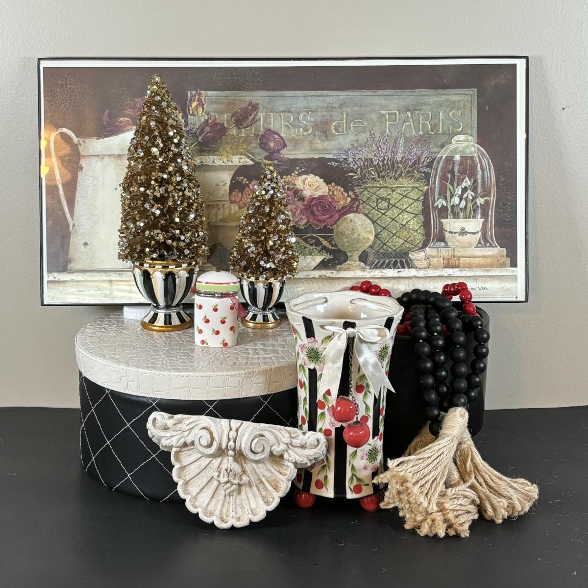 LOT 137: Mackenzie Childs Gold Bottle Brush Trees, J.McCall Blue Sky 2004 Cherries & Floral Ceramic Vase, Kathryn White Print, Black & Red Beads, Round Storage Box & More