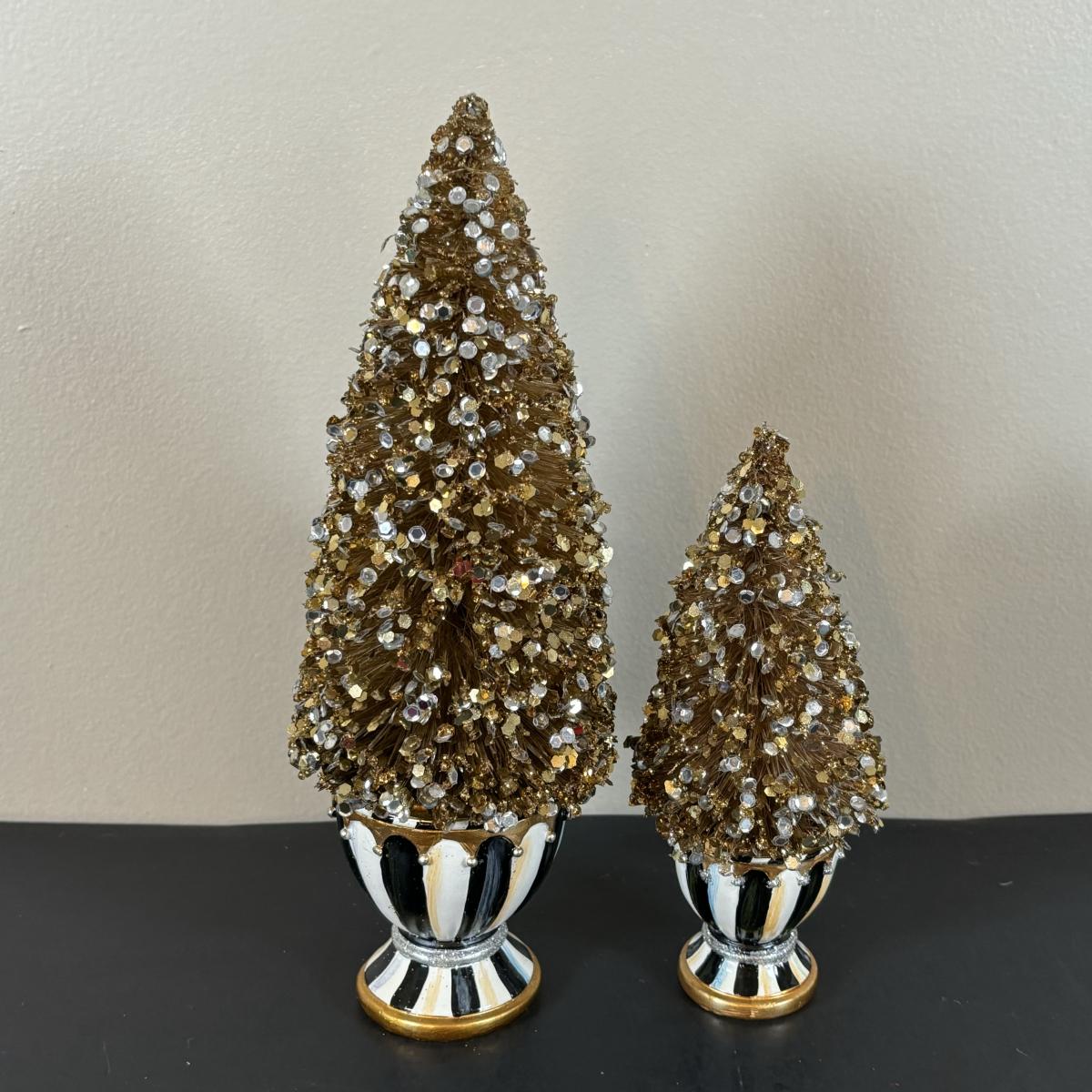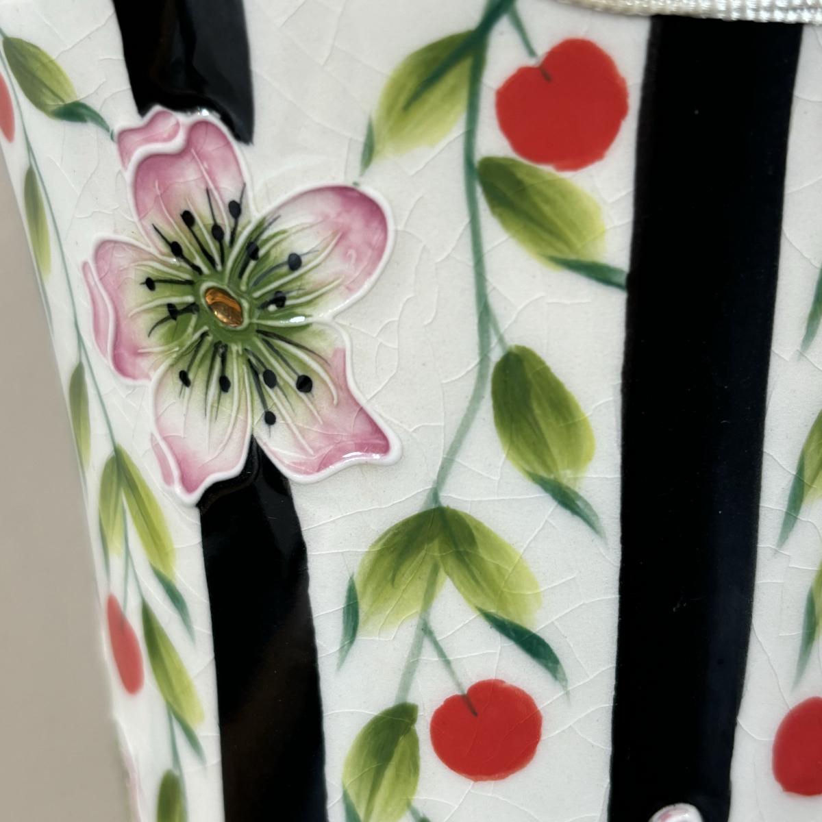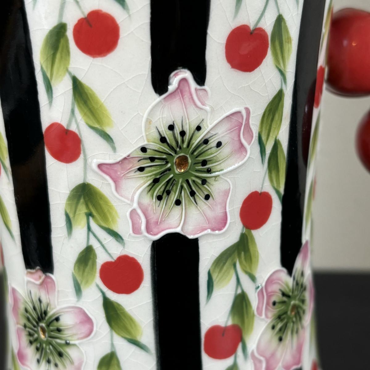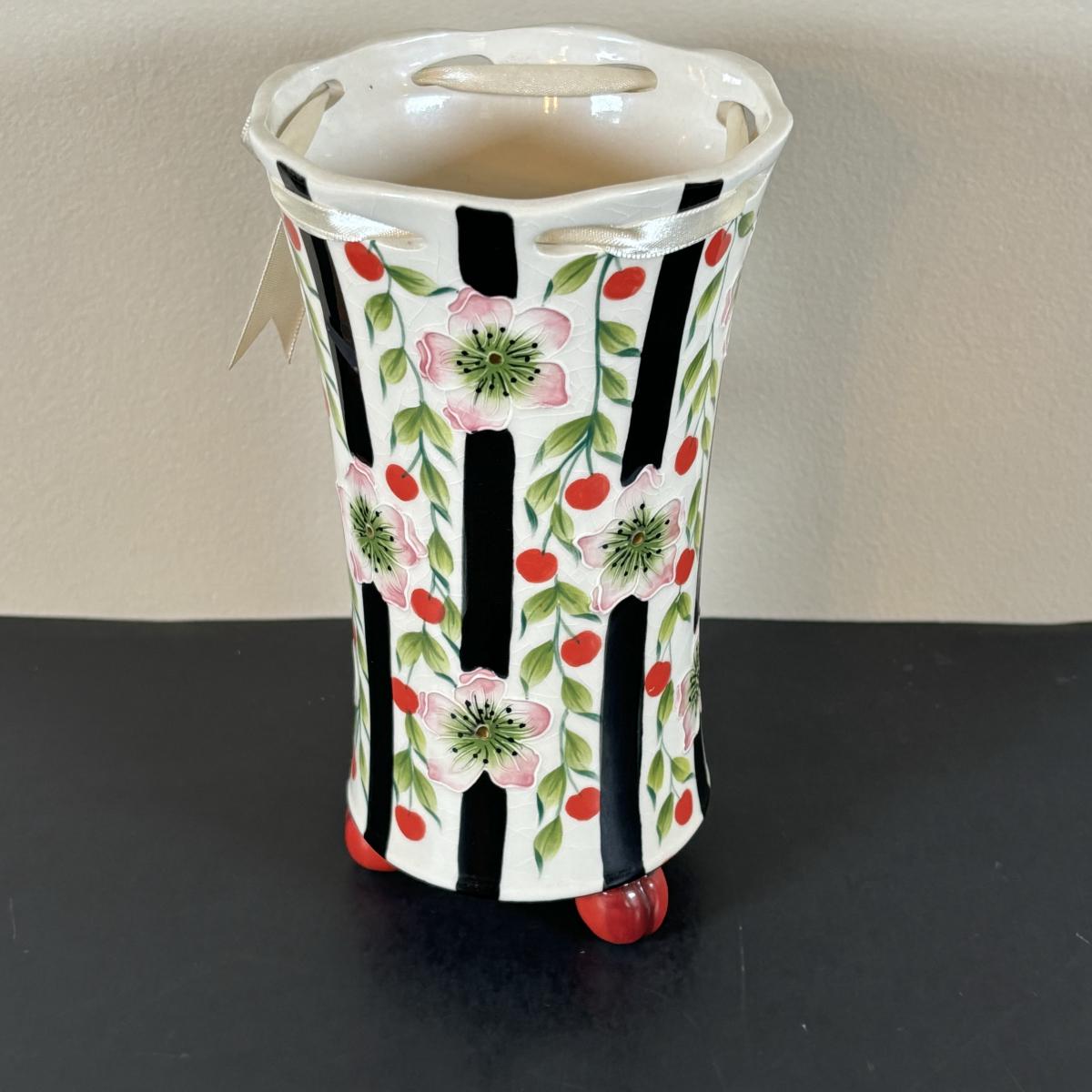 LOT 137: Mackenzie Childs Gold Bottle Brush Trees, J.McCall Blue Sky 2004 Cherries & Floral Ceramic Vase, Kathryn White Print, Black & Red Beads, Round Storage Box & More
