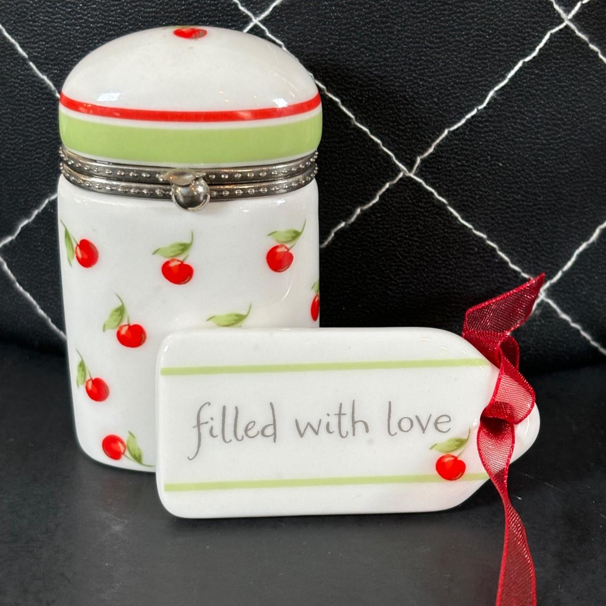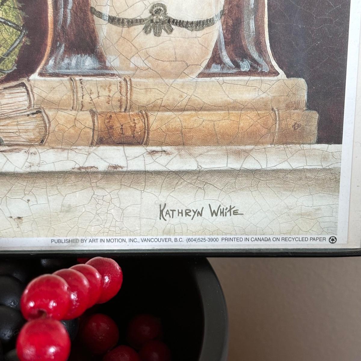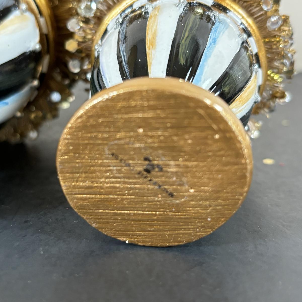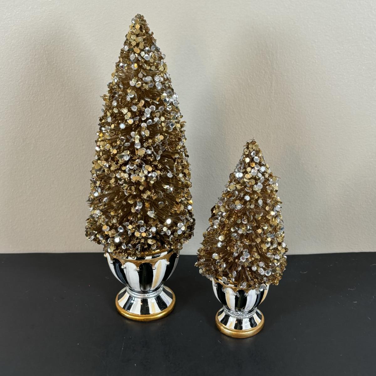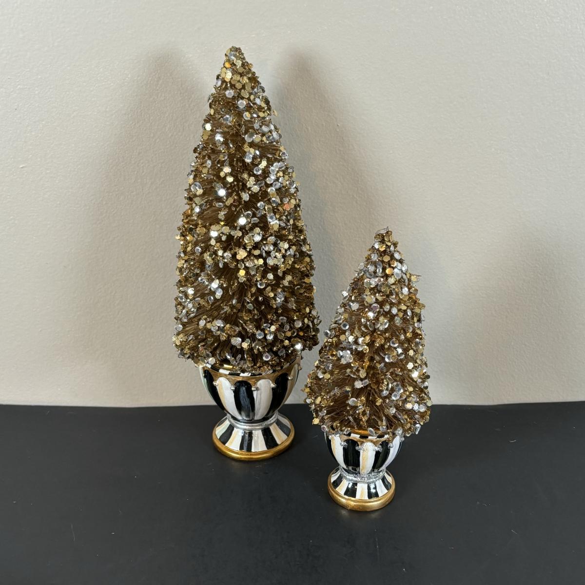 LOT 137: Mackenzie Childs Gold Bottle Brush Trees, J.McCall Blue Sky 2004 Cherries & Floral Ceramic Vase, Kathryn White Print, Black & Red Beads, Round Storage Box & More