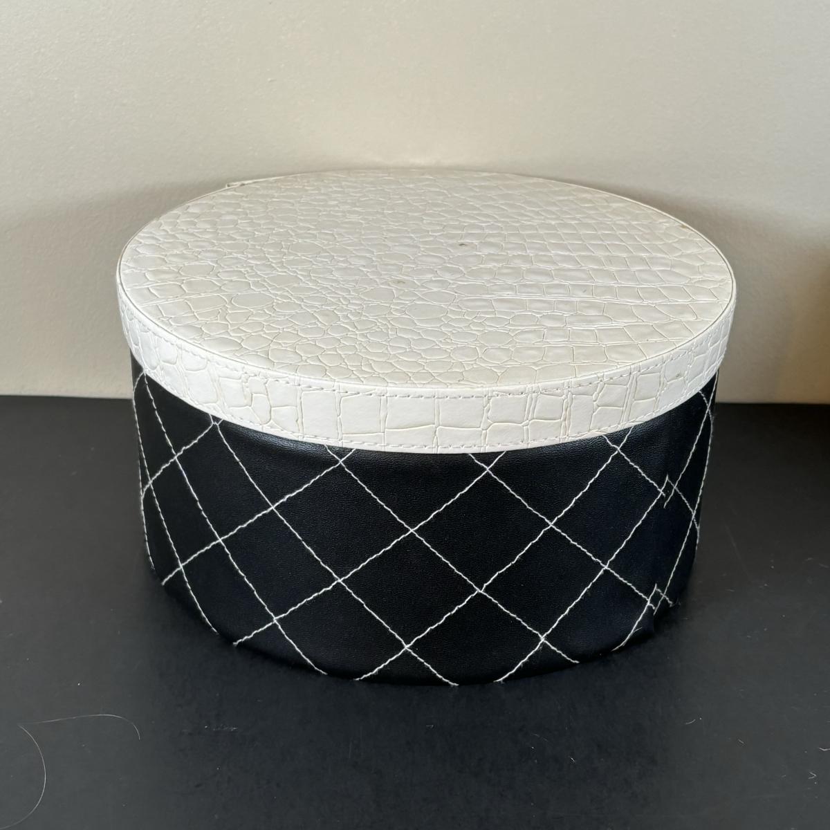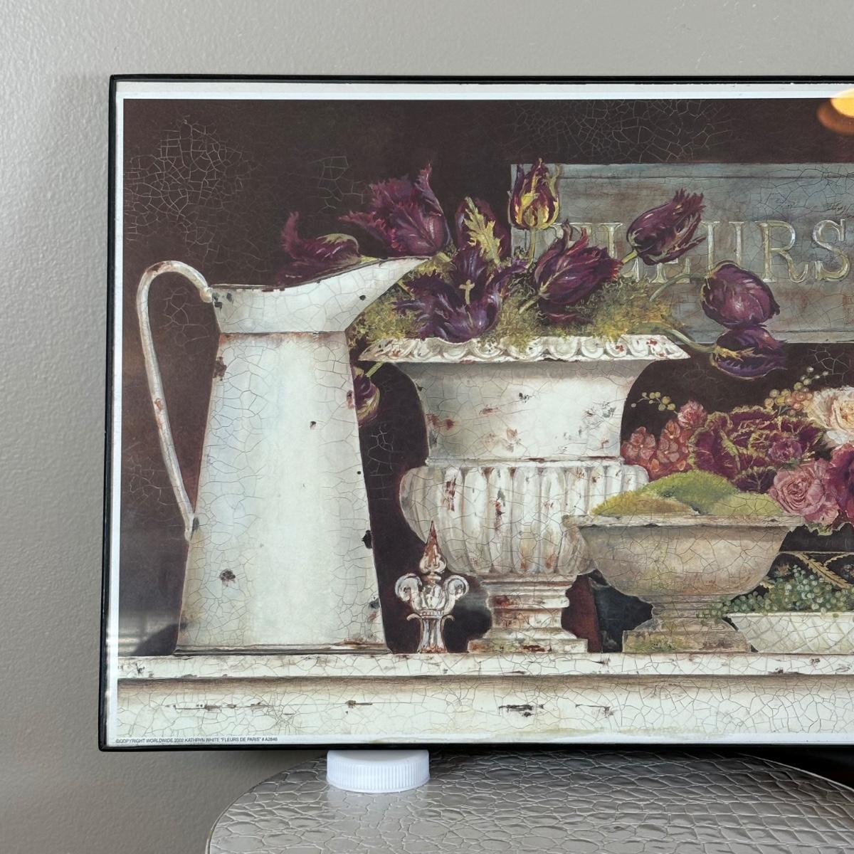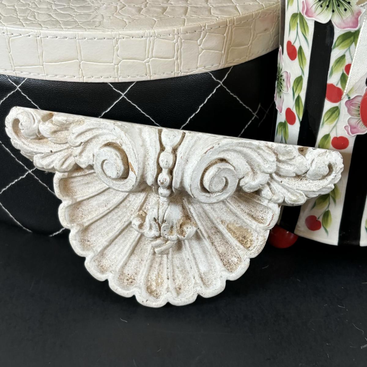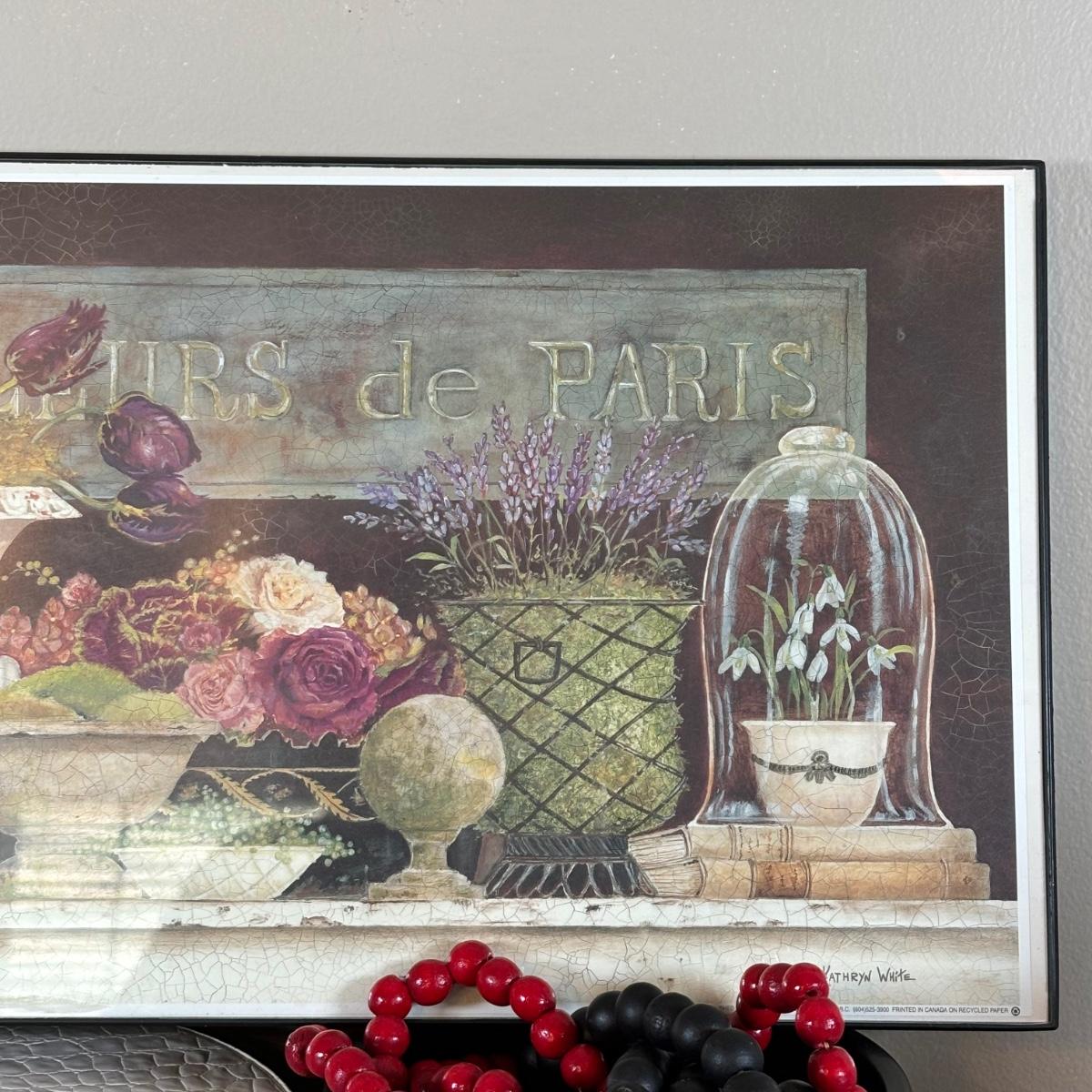 LOT 137: Mackenzie Childs Gold Bottle Brush Trees, J.McCall Blue Sky 2004 Cherries & Floral Ceramic Vase, Kathryn White Print, Black & Red Beads, Round Storage Box & More