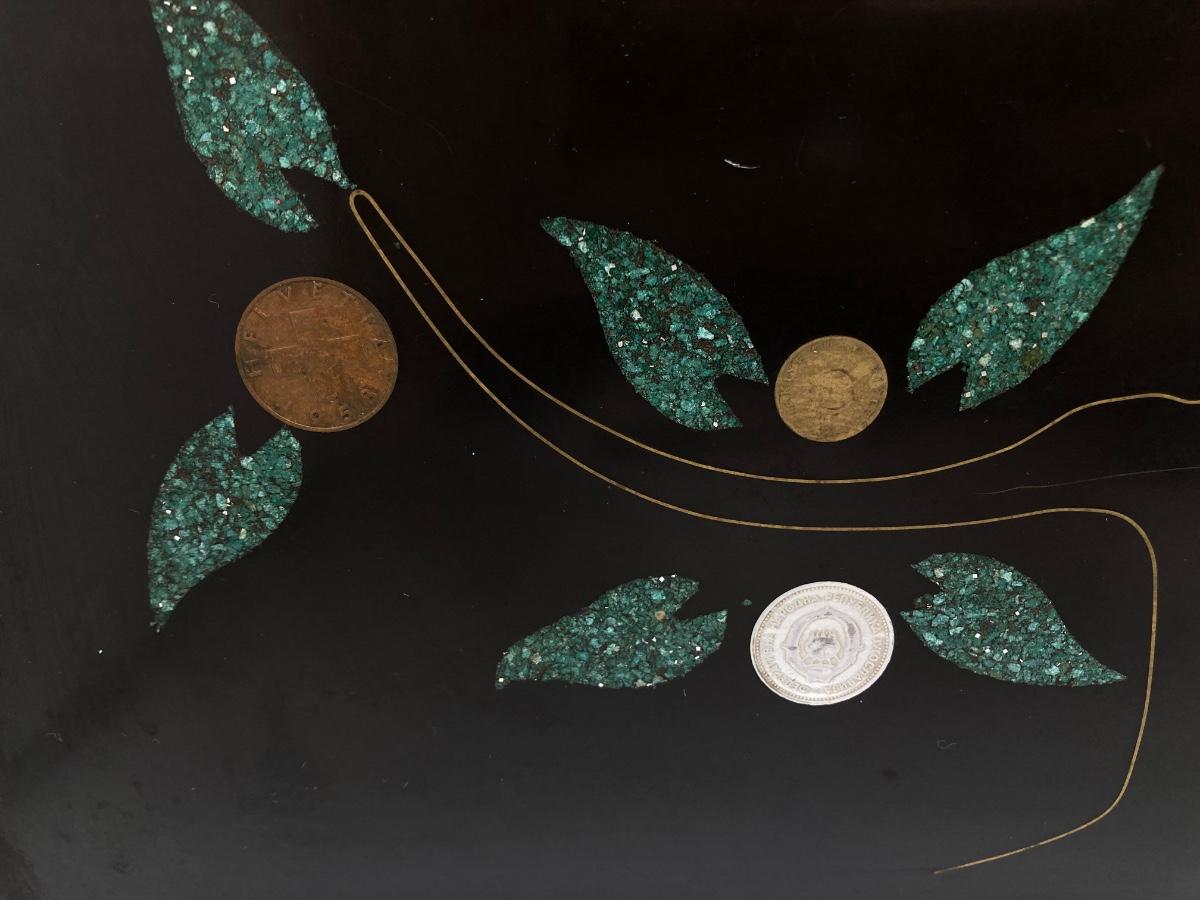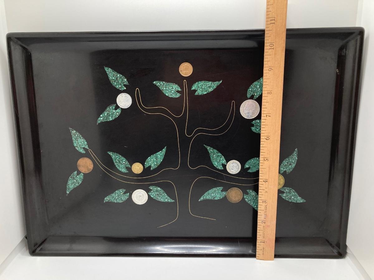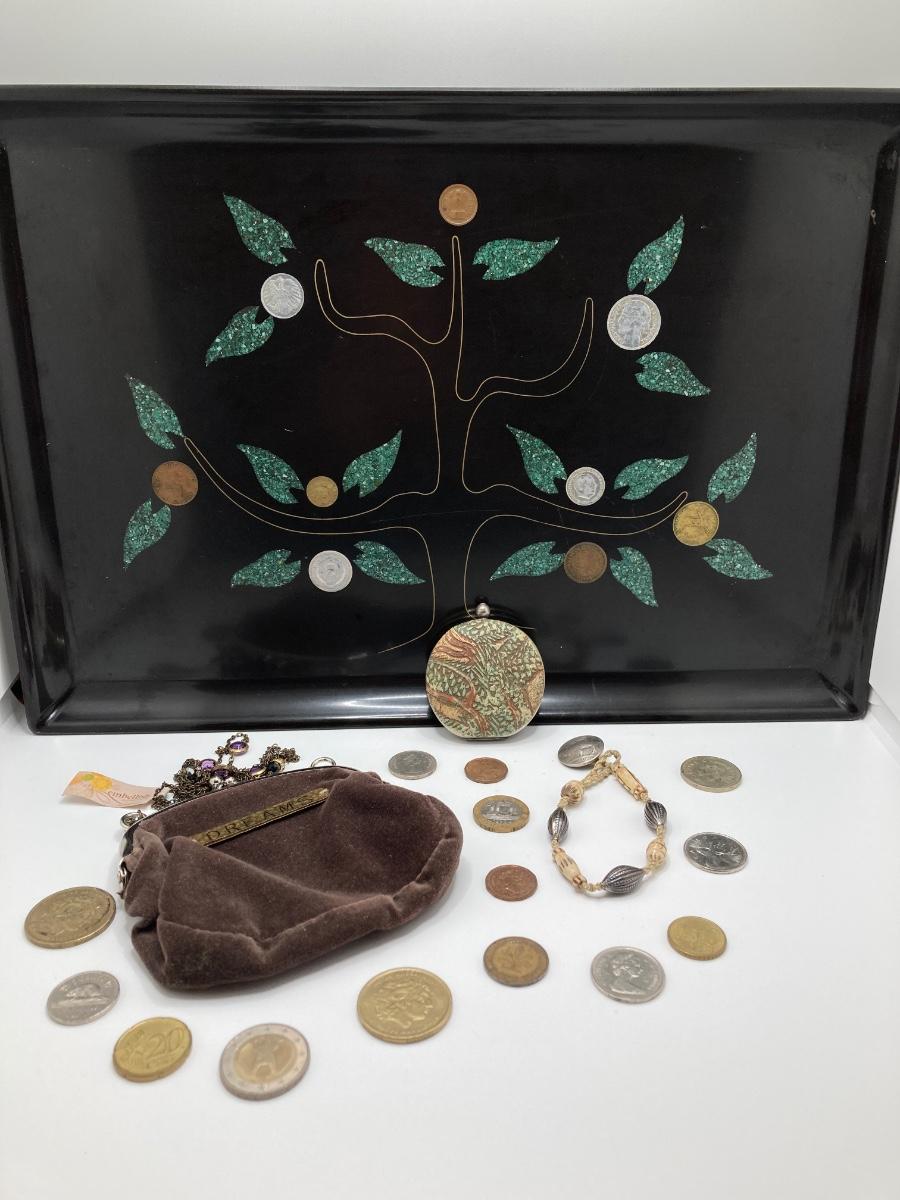 LOT 167: Couric Black Tray with Hand Inlaid Coins, Chain Purses, Foreign Coins and Buffalo Nickel Bracelet