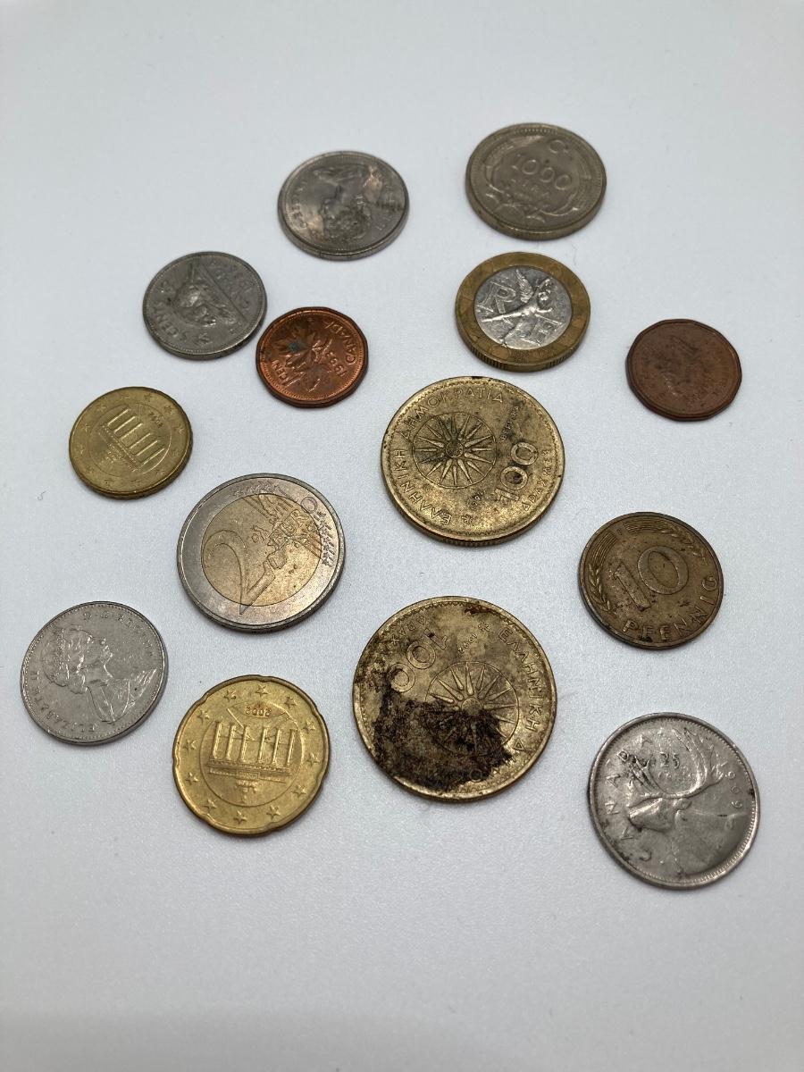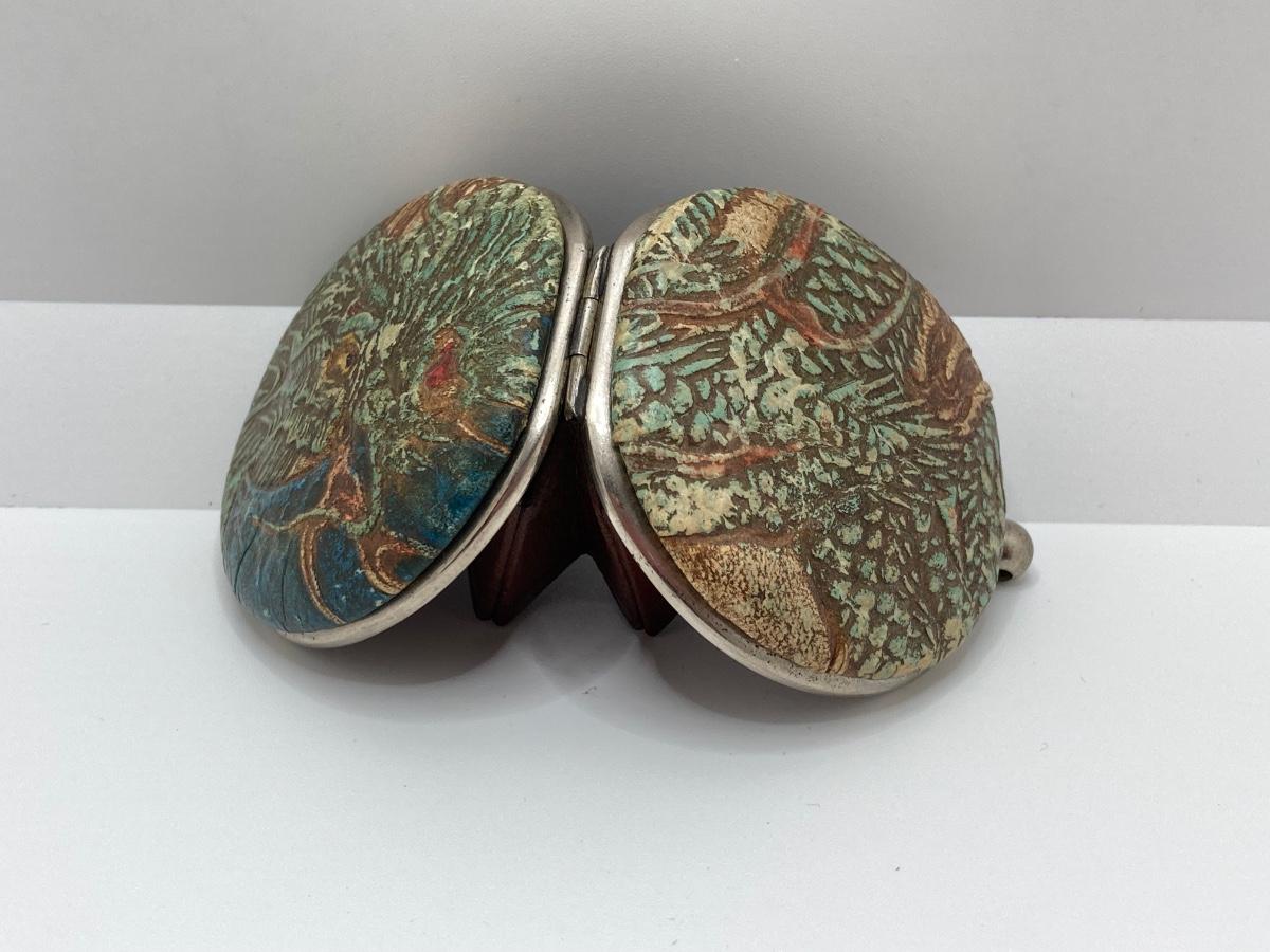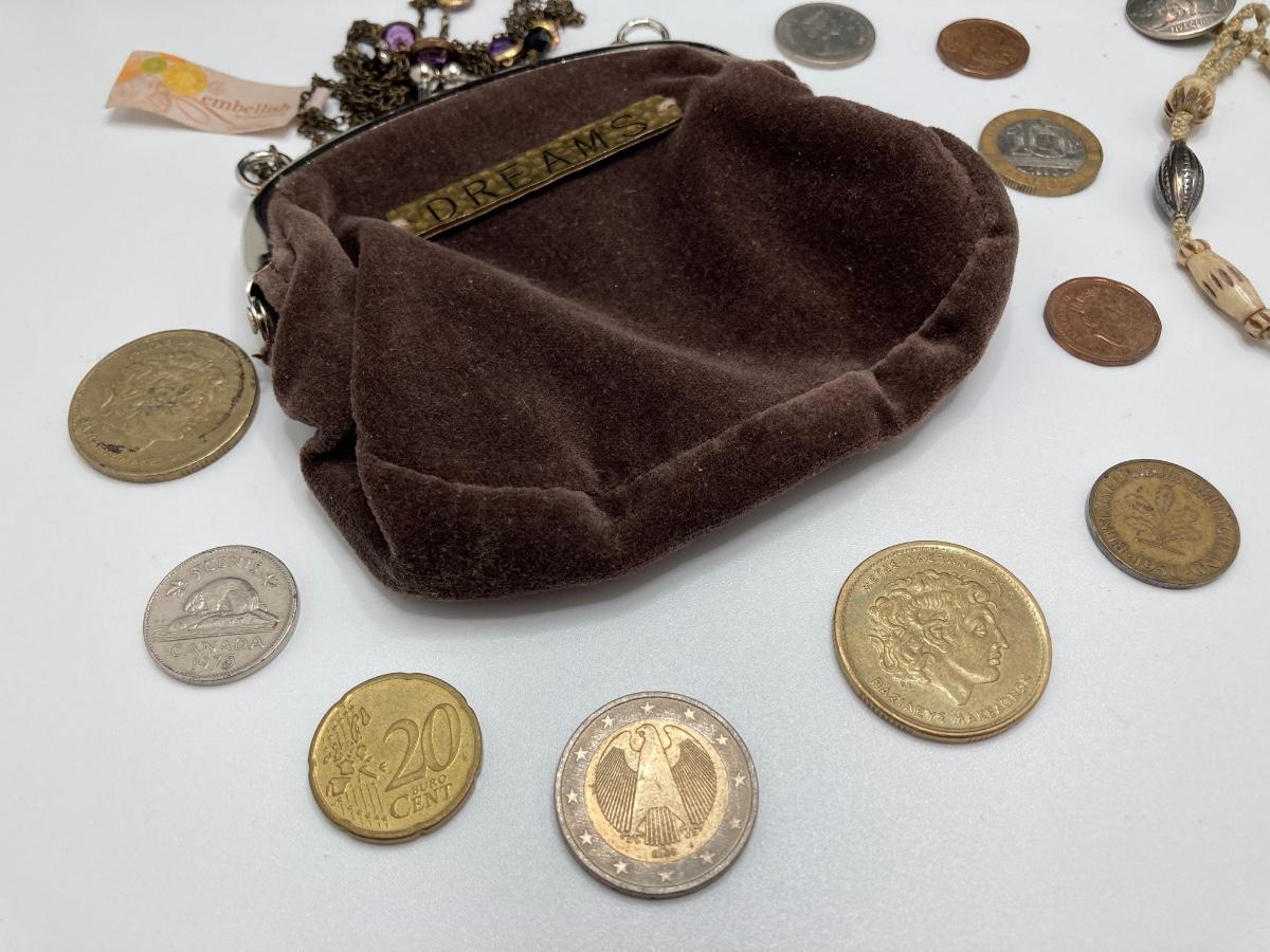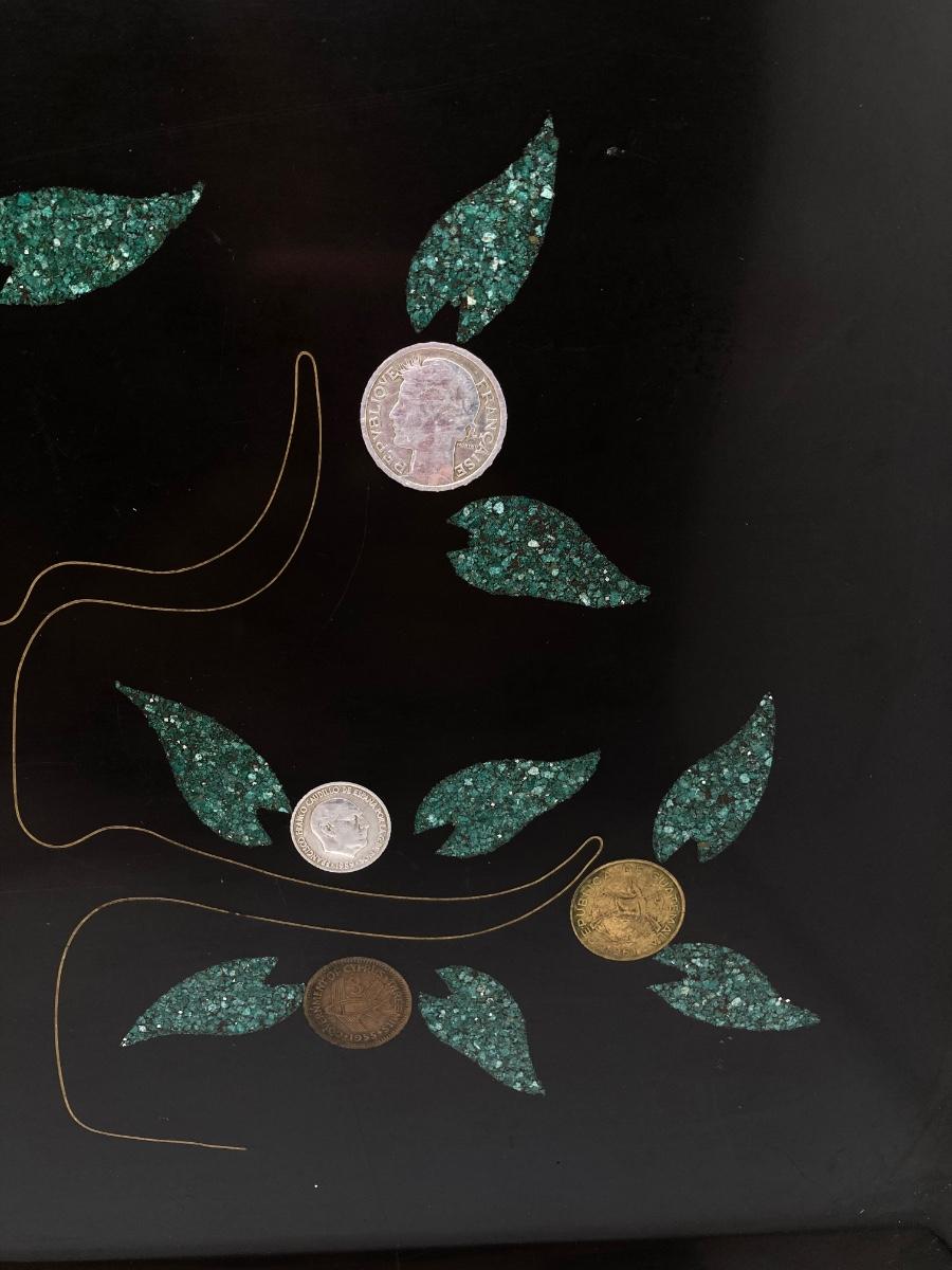 LOT 167: Couric Black Tray with Hand Inlaid Coins, Chain Purses, Foreign Coins and Buffalo Nickel Bracelet