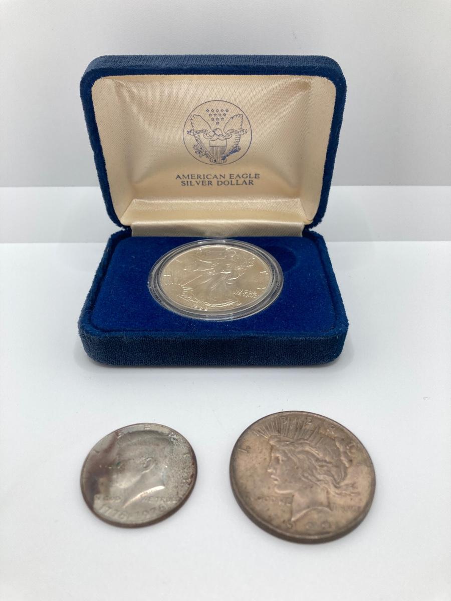 LOT 168: American Eagle Silver Dollar 1988 1 Oz. Fine Silver, 1922 Liberty Peace Dollar and 1776-1976 Kennedy Half Dollar