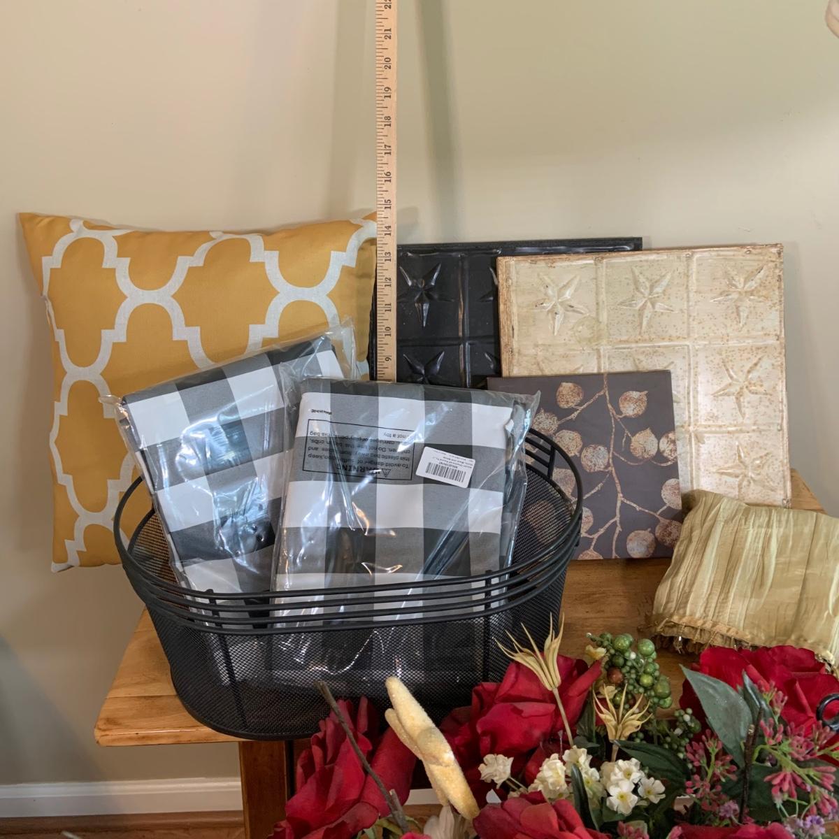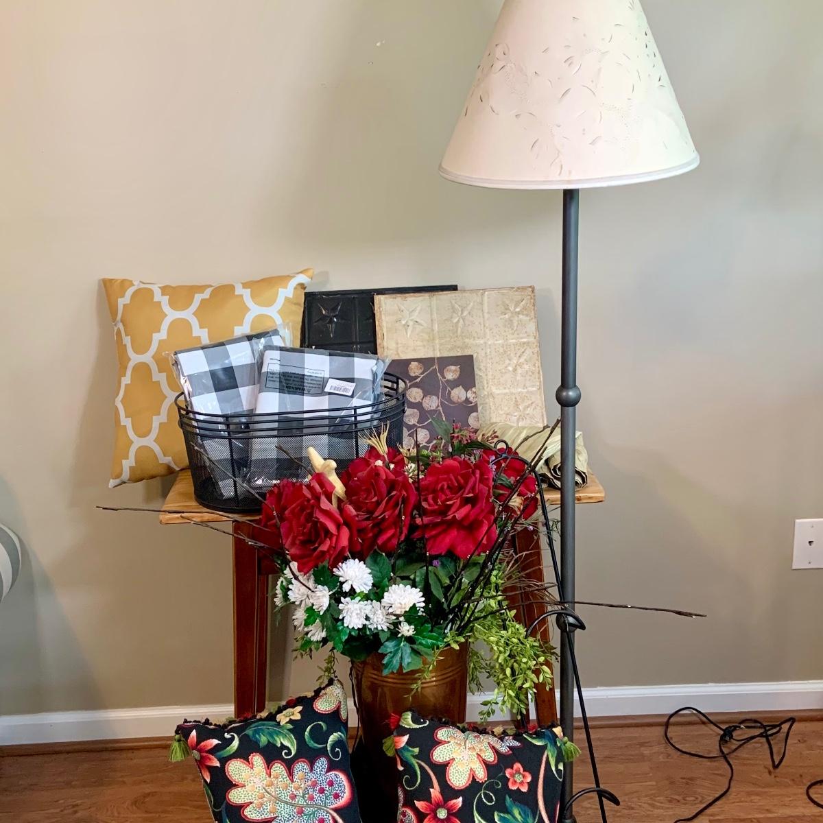 LOT 501: Home Decor: Lamp, Faux Flowers, Accent Pillows, Checkered Tablecloths