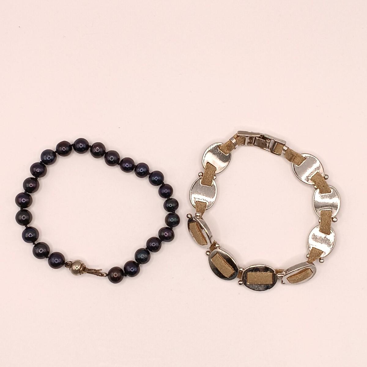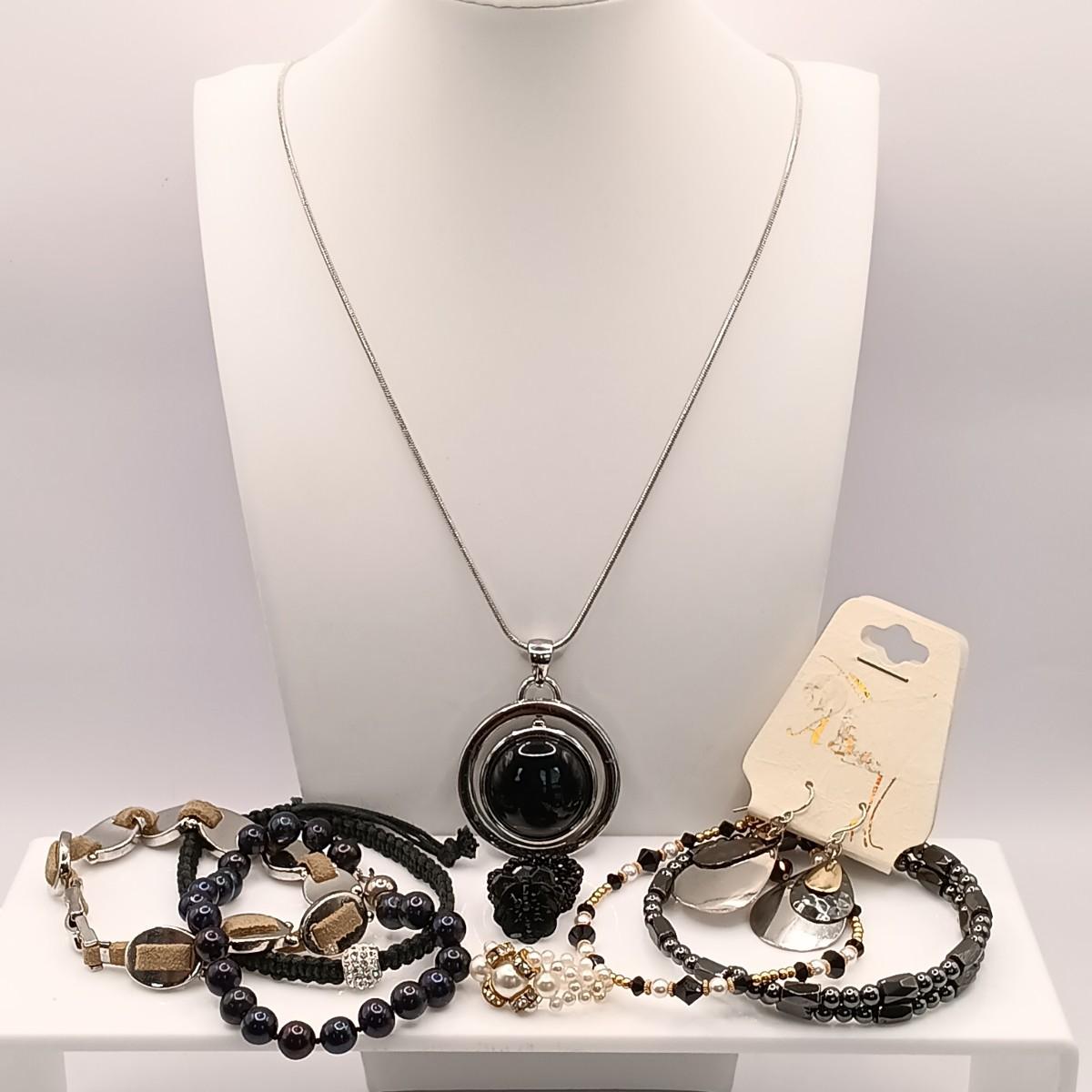 LOT 228: Silverstone Necklace w/ Black Sphere Pendant, Vintage Bracelets, Earrings & More
