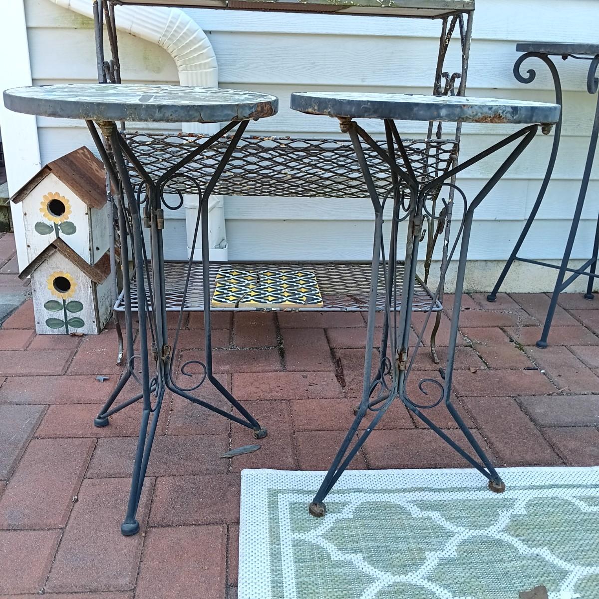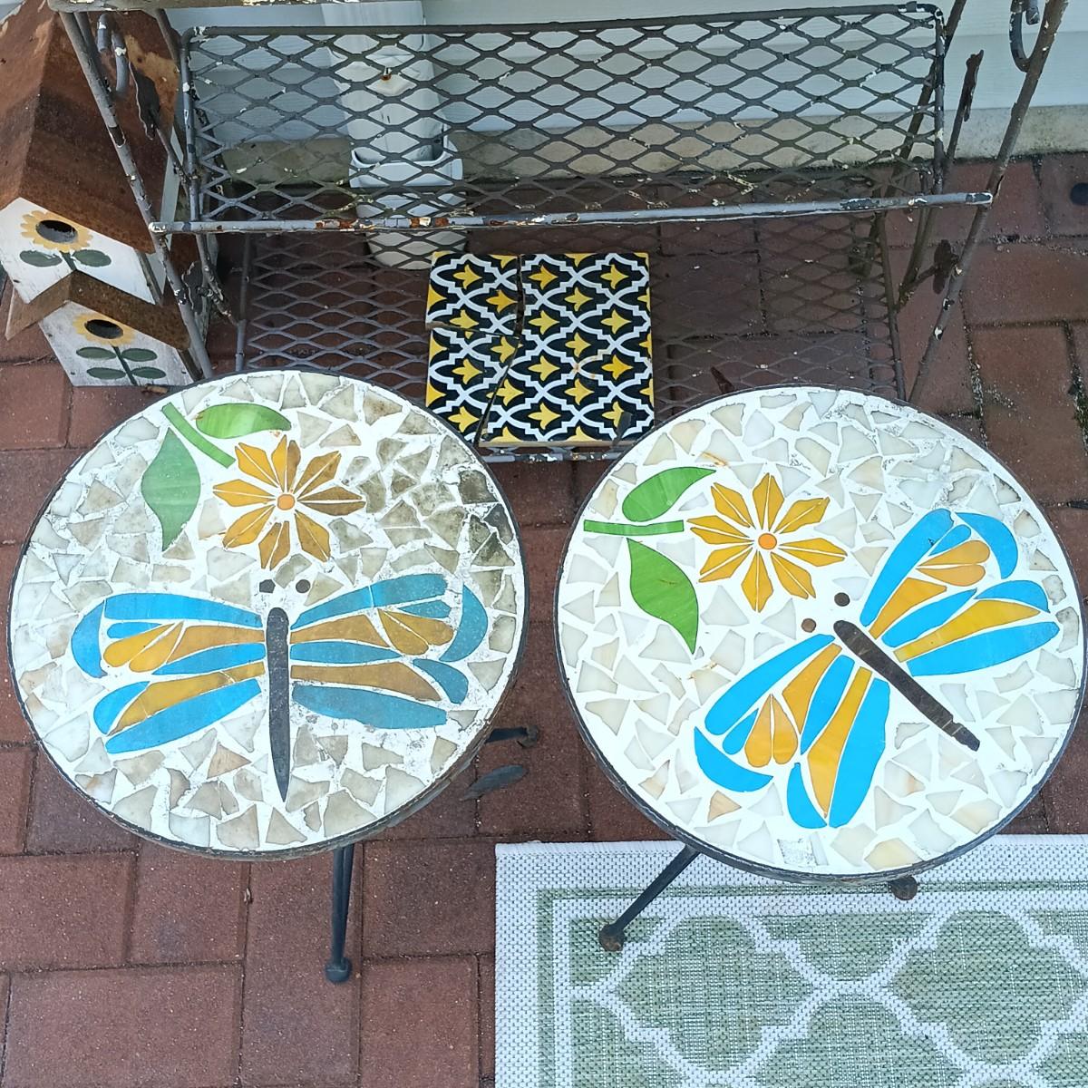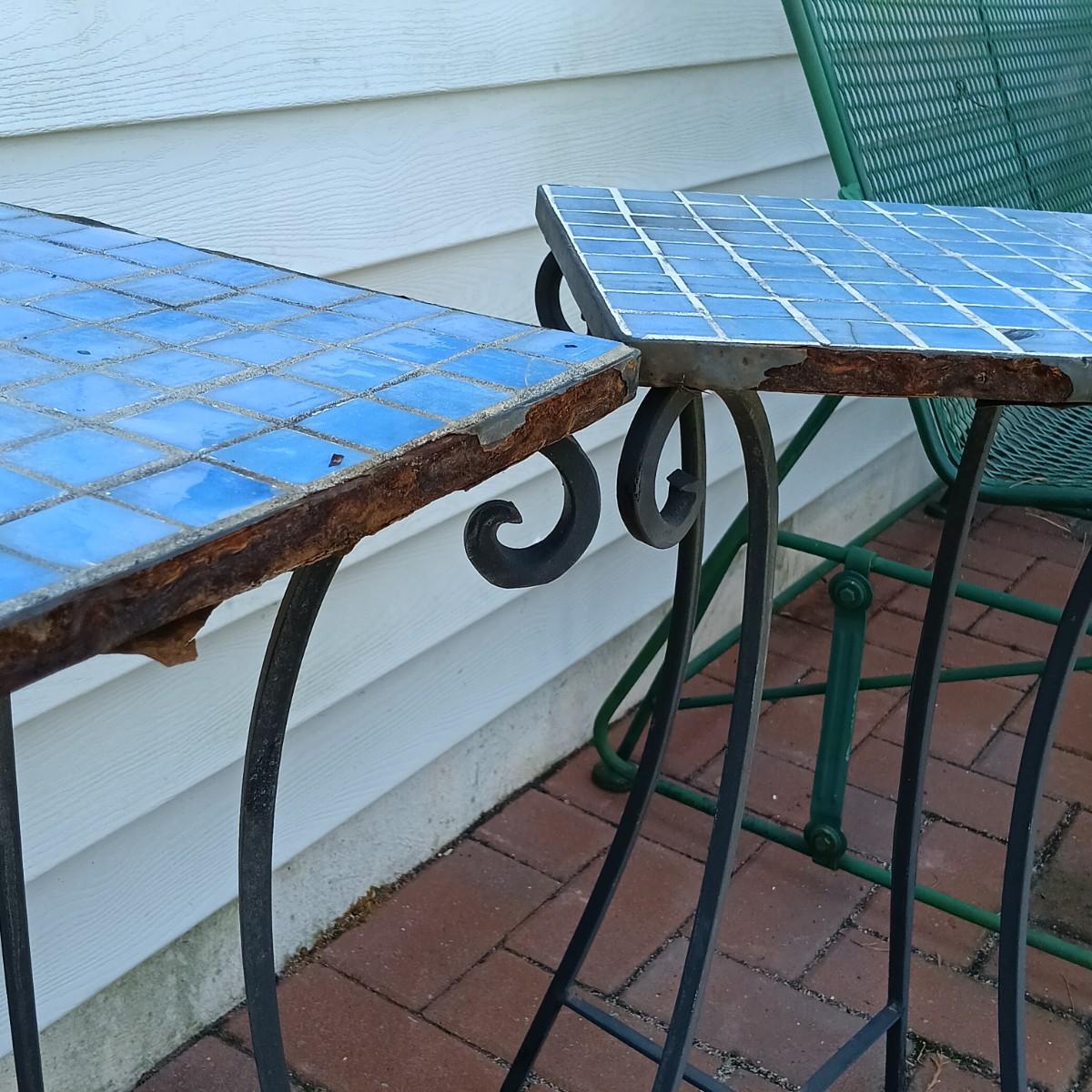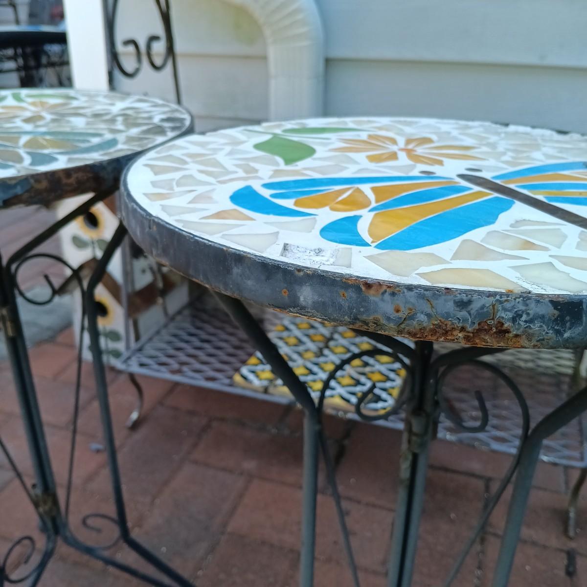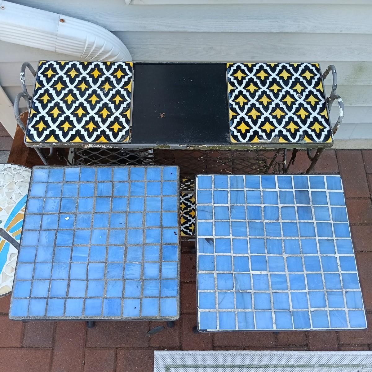 LOT 235: Mosaic Tile Top Side Tables, Metal Planter Rack, Glass Mosaic Bird Feeder & More