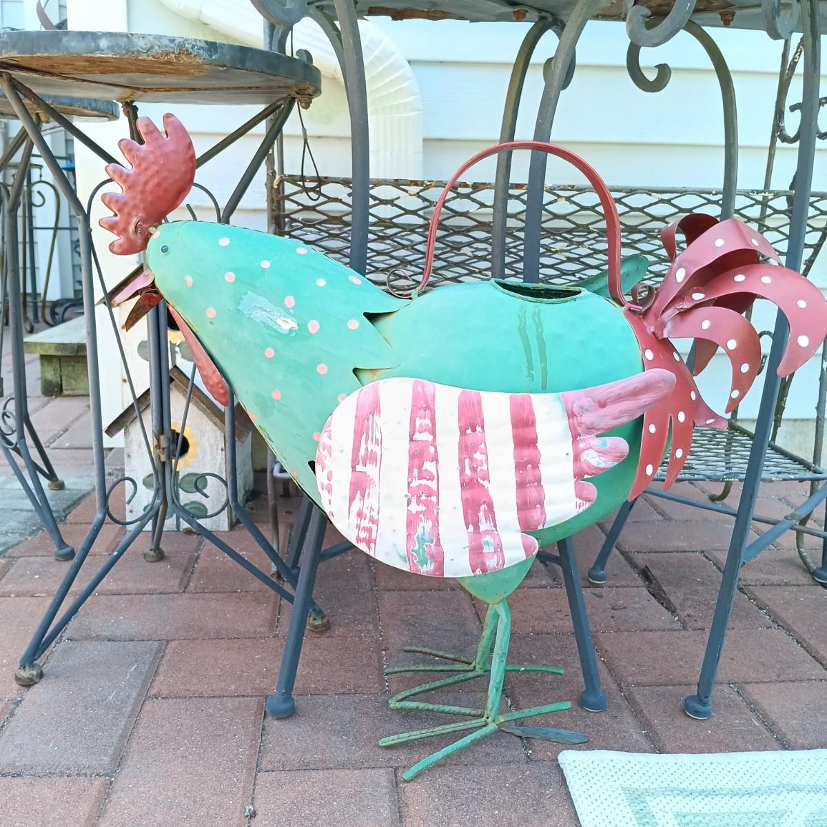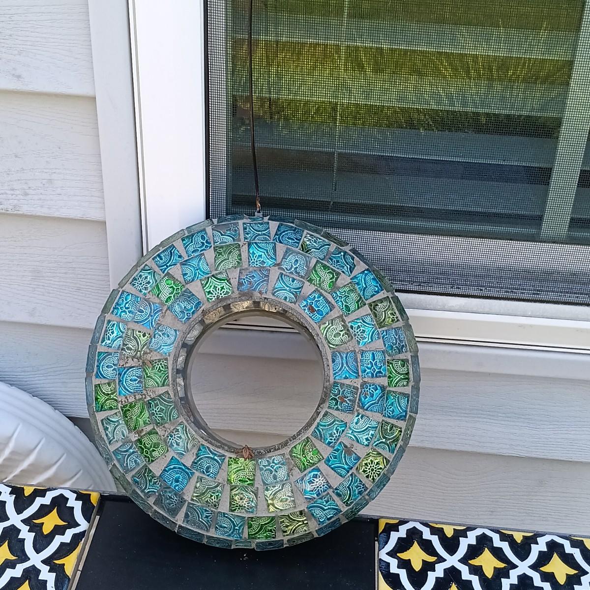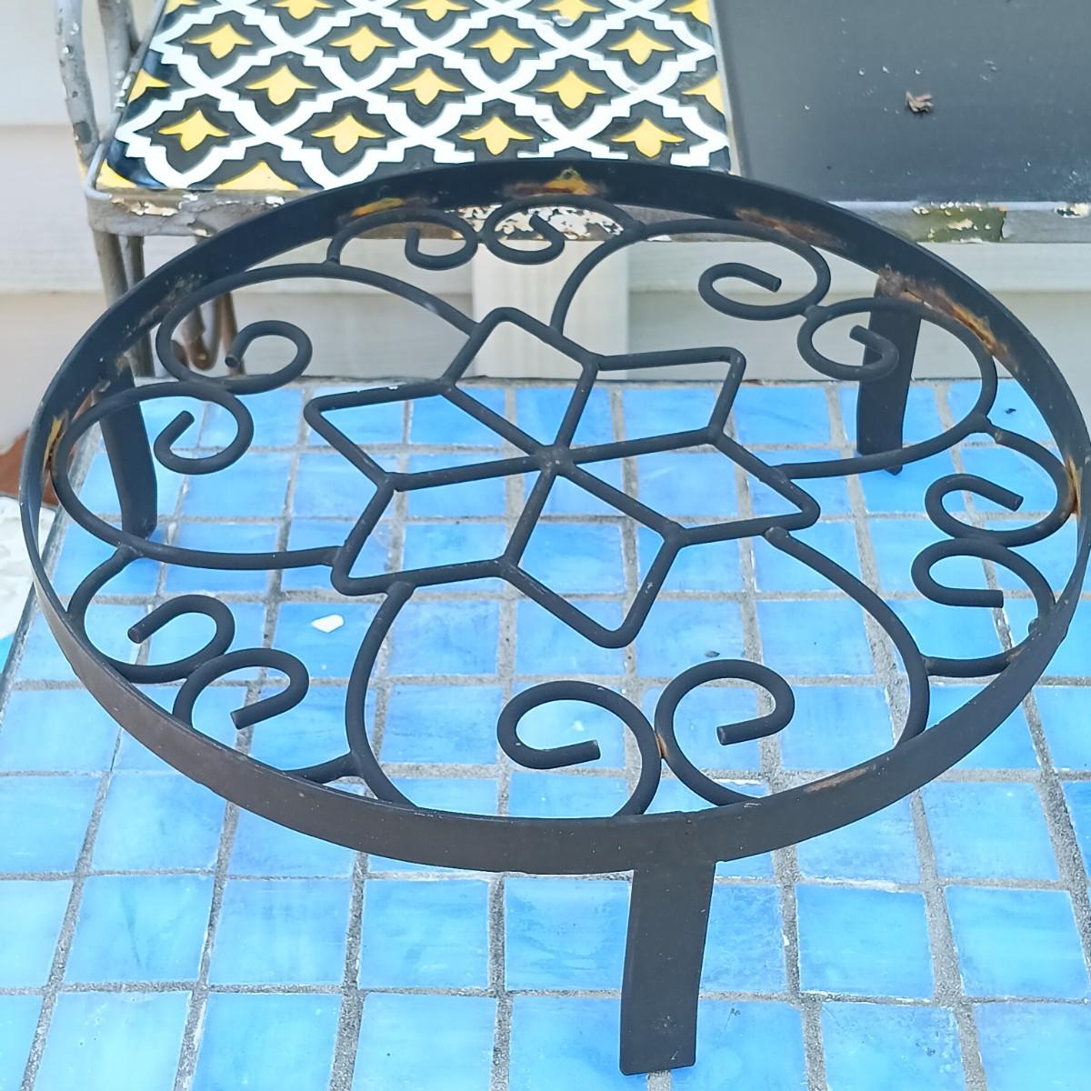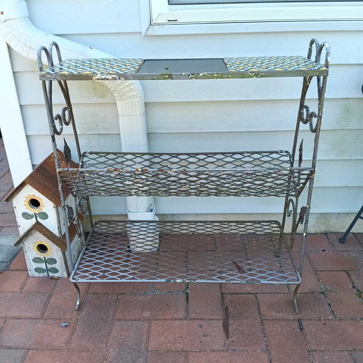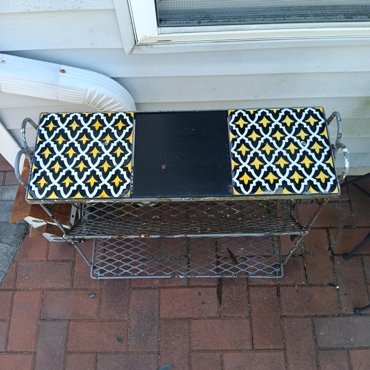 LOT 235: Mosaic Tile Top Side Tables, Metal Planter Rack, Glass Mosaic Bird Feeder & More