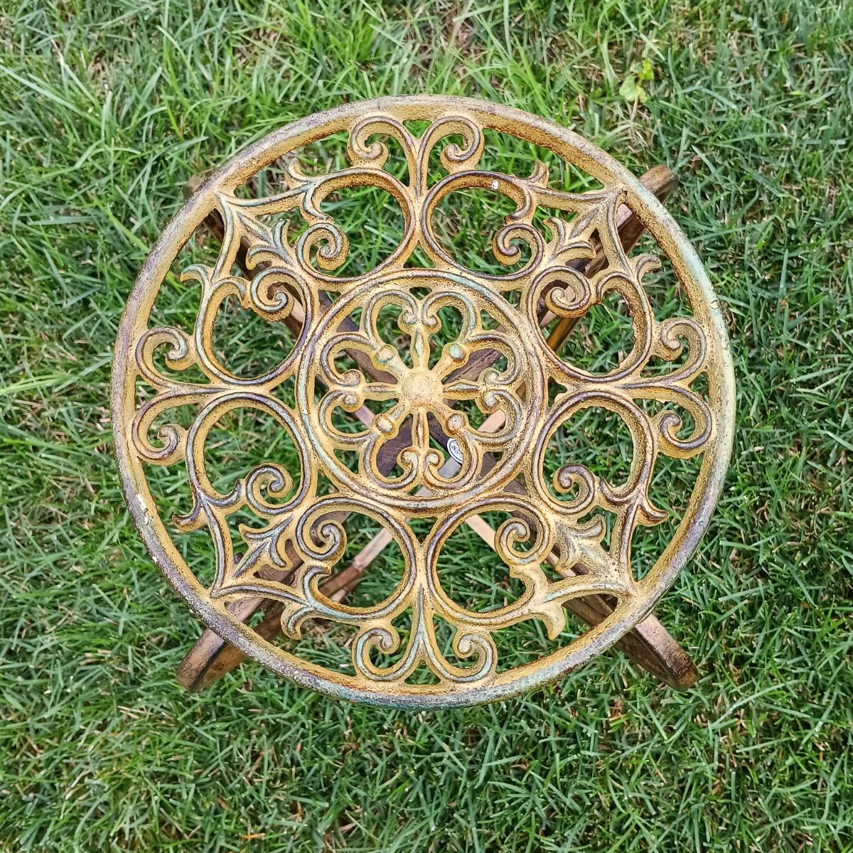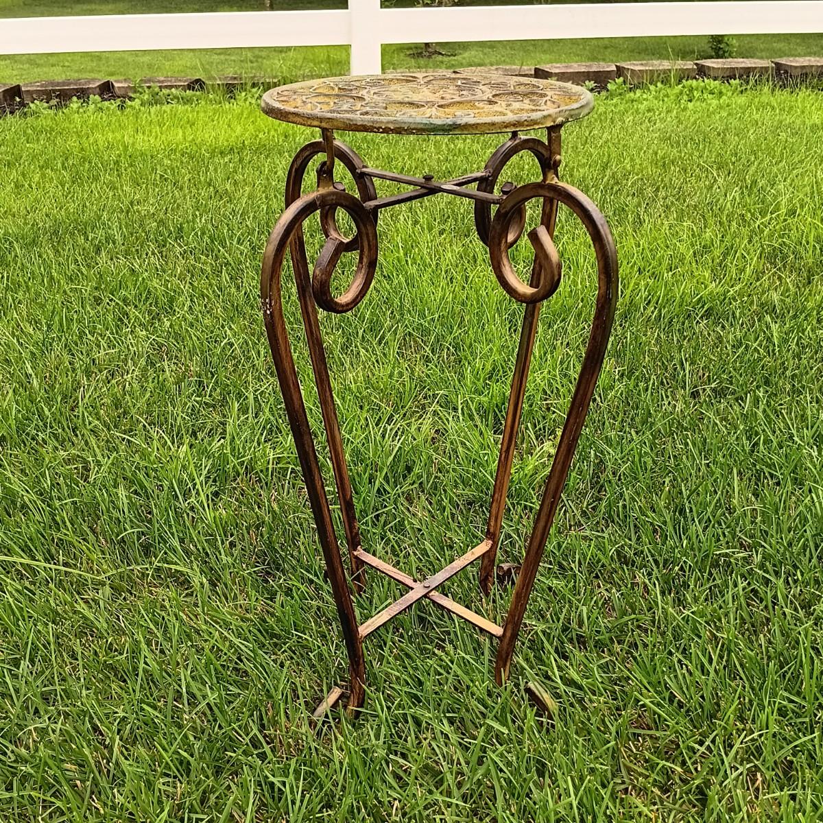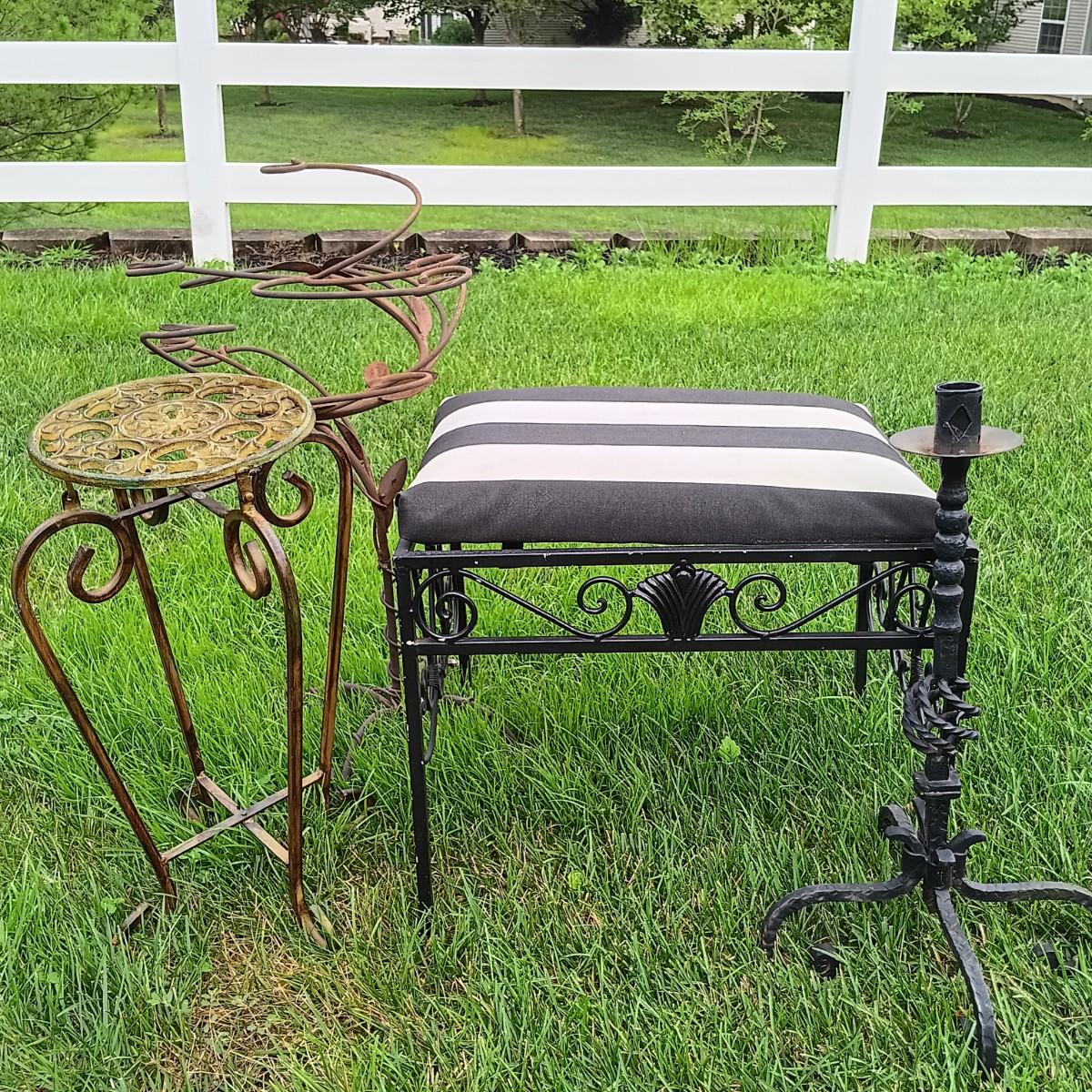 LOT 243: Wrought Iron Patio Stool, Side Table, Candlestick Holder & Garden Art