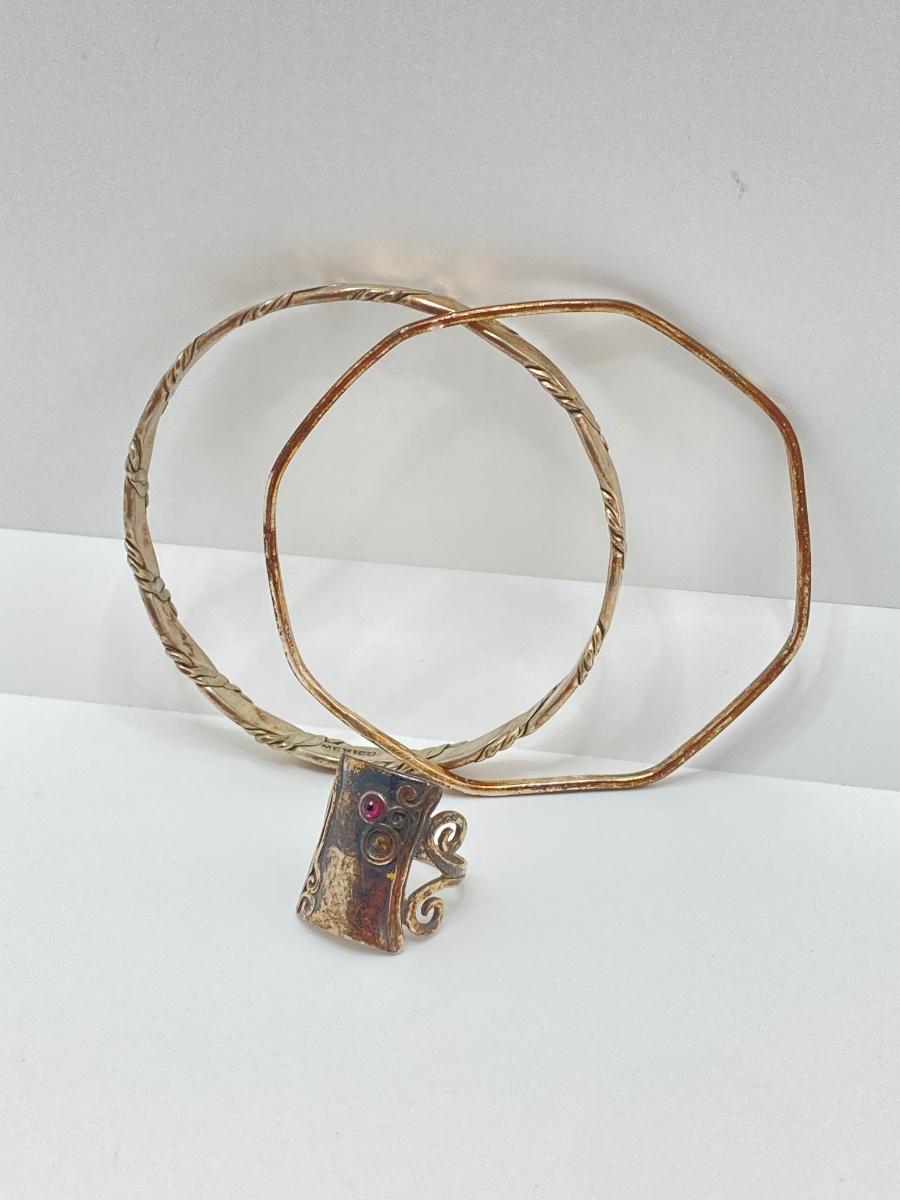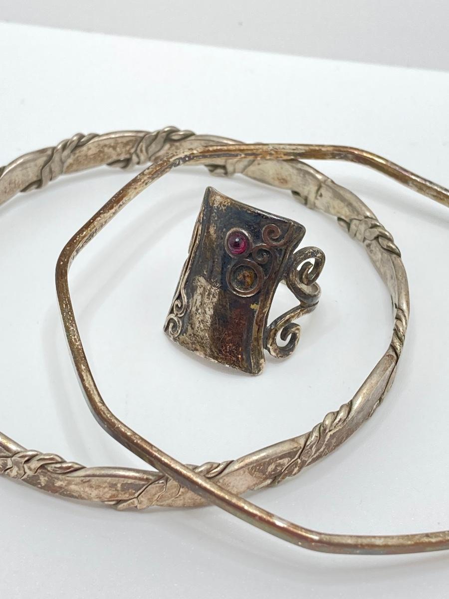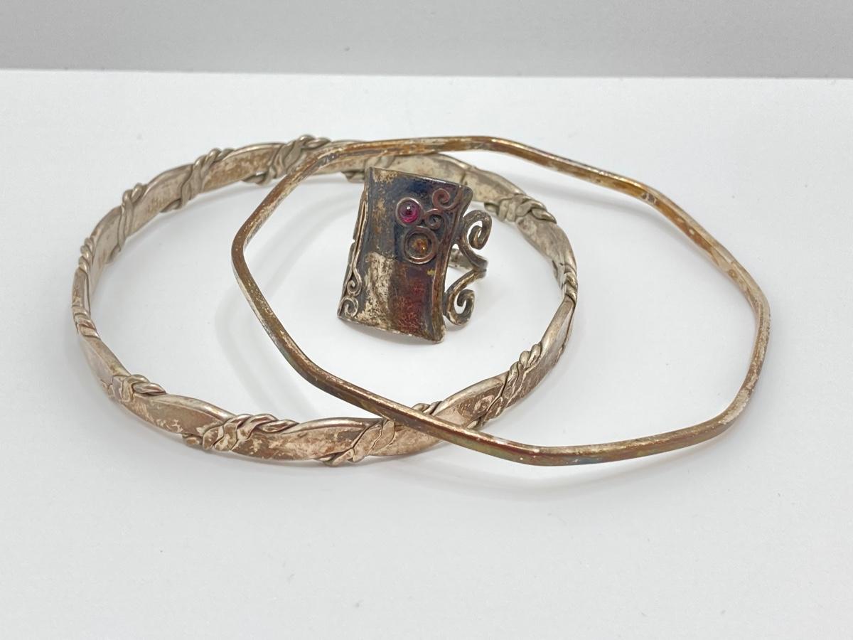 LOT 280: Sterling Jewelry - Two Mexico Bangle Bracelets TW 26.73g and AS Israel Ring - TW 4.63g Sz 7