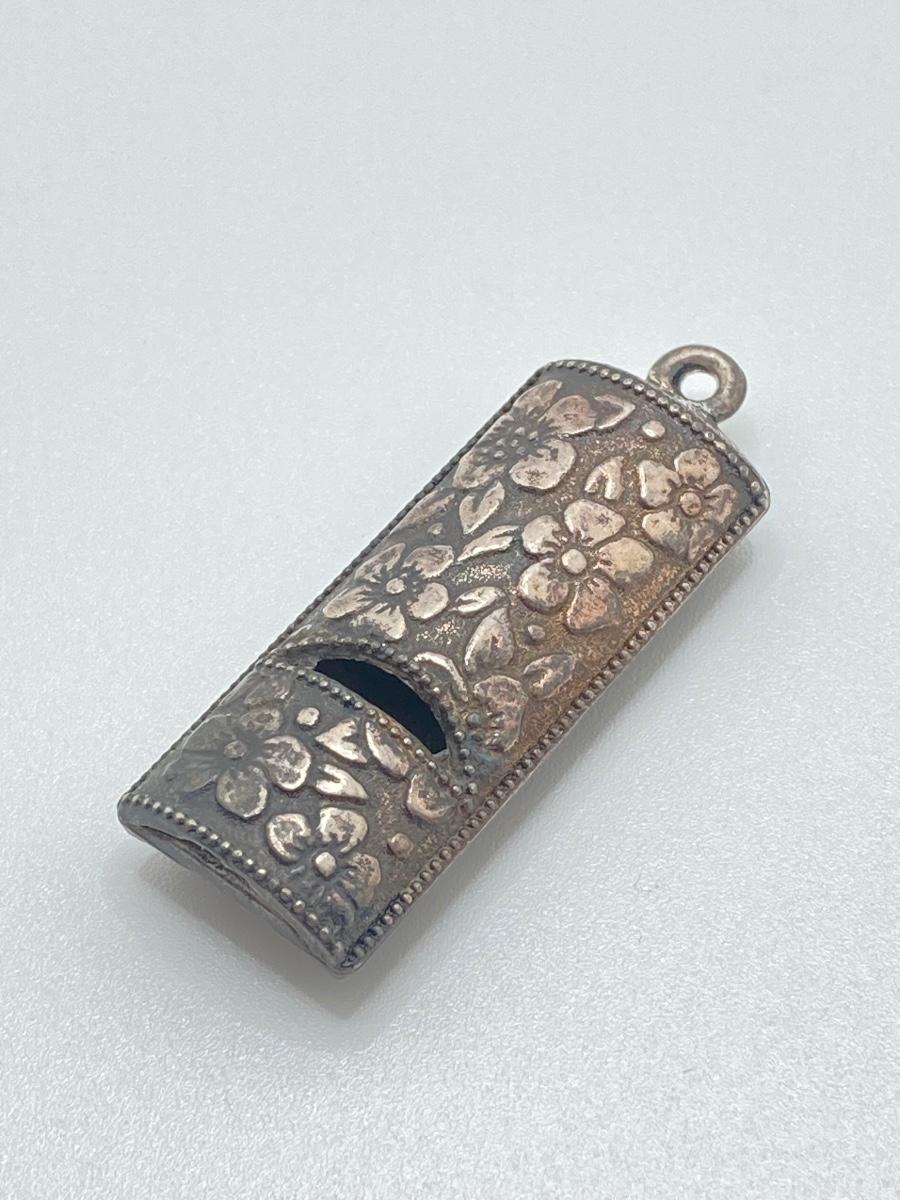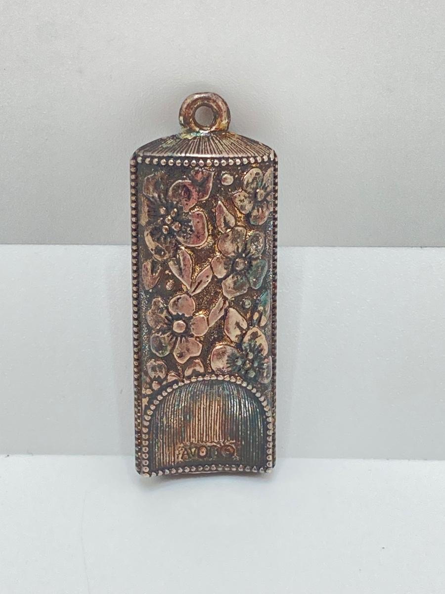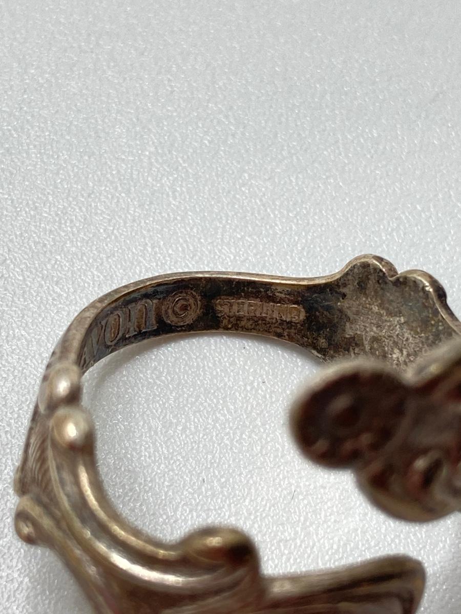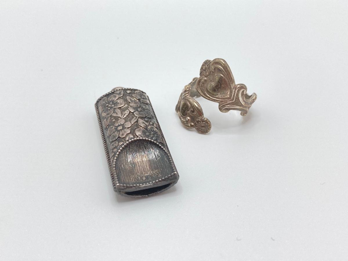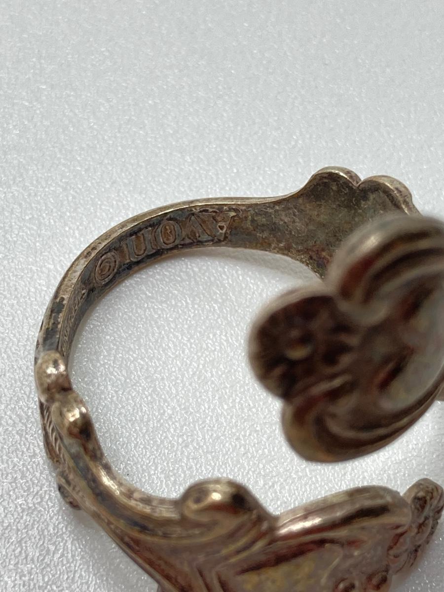 LOT 282: Avon Sterling Silver “Treasured Heart” Spoon Ring 197t and Avon 1975 Silver Note Repousse Floral Whistle Pendant
