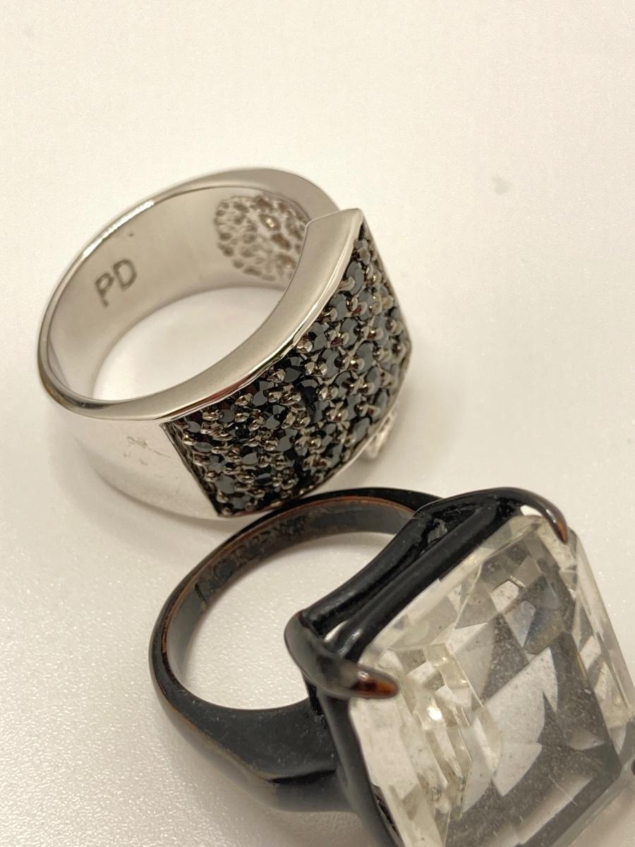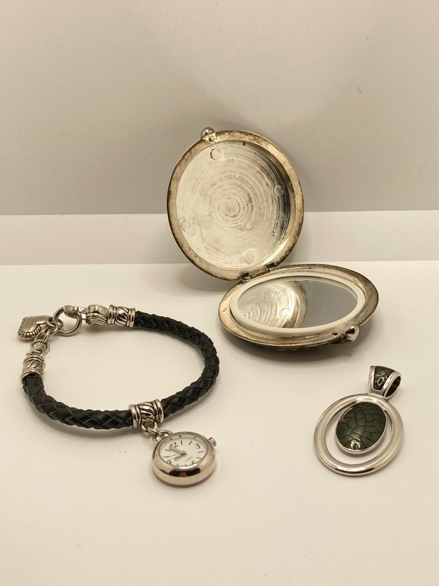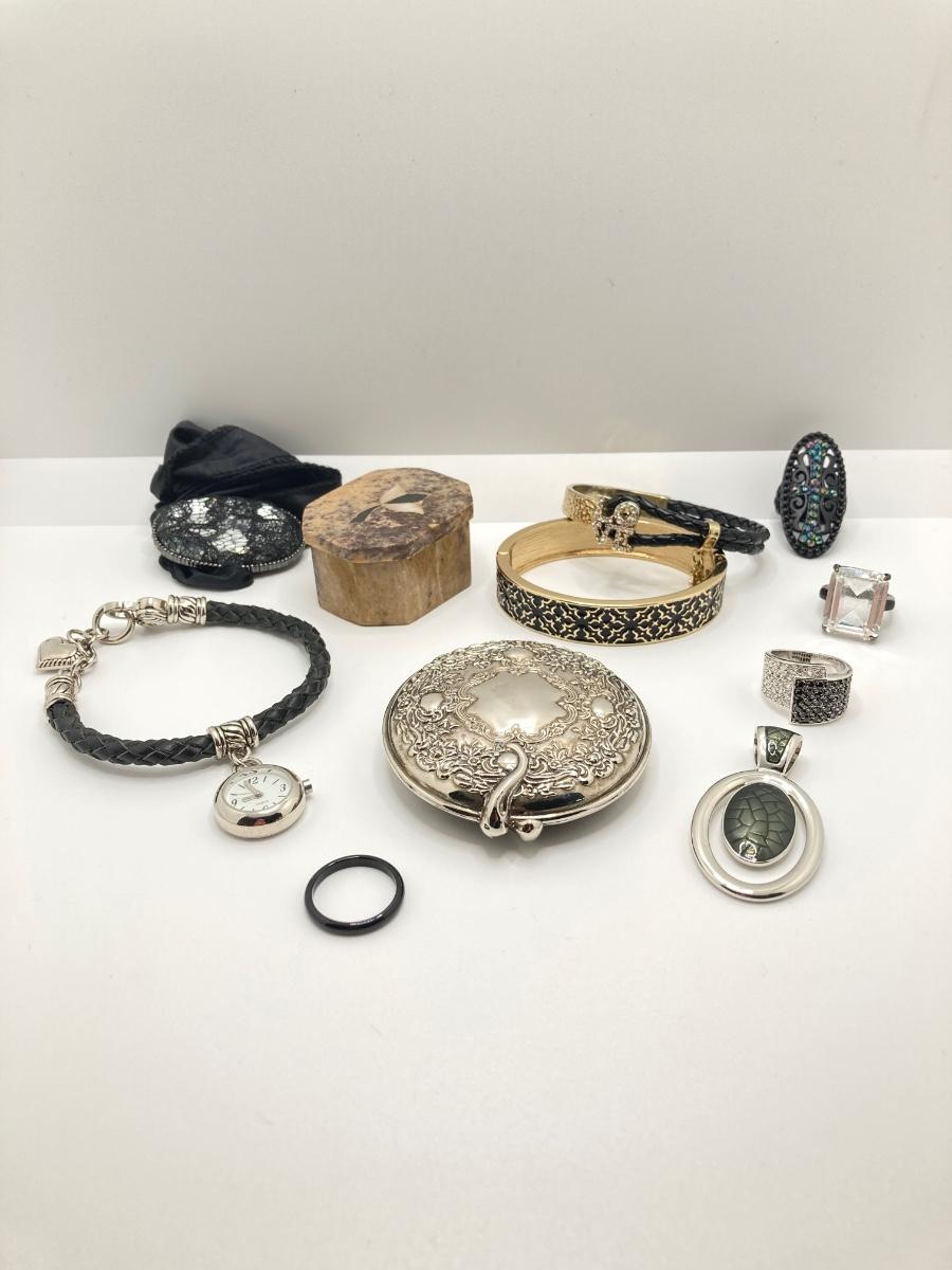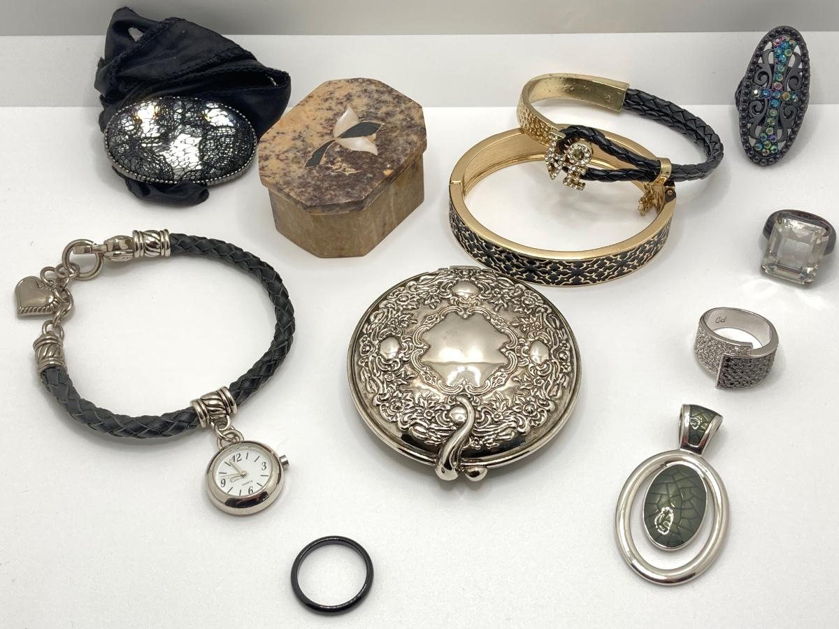 LOT 284: Collection of Fashion Rings, Compact, Inlay Trinket Box, Lia Sophia Pendant and More