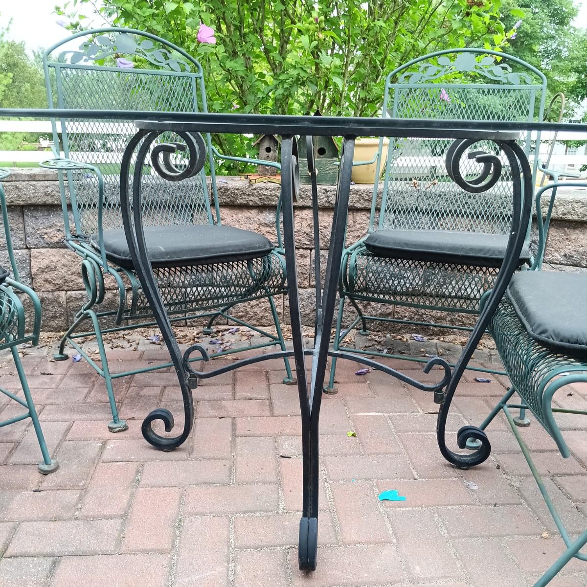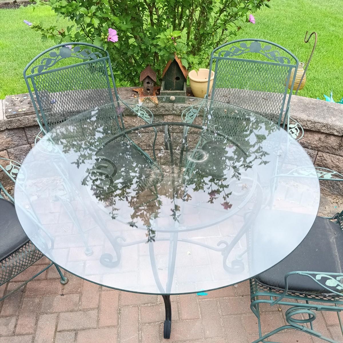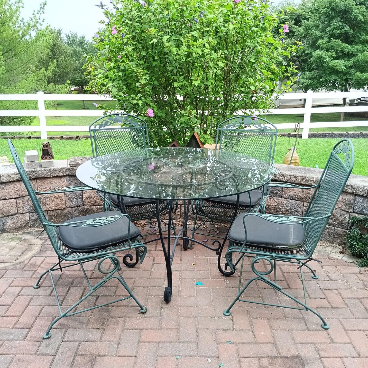 LOT 305: Set of Metal Patio Chairs with Wrought Iron and Glass Top Table
