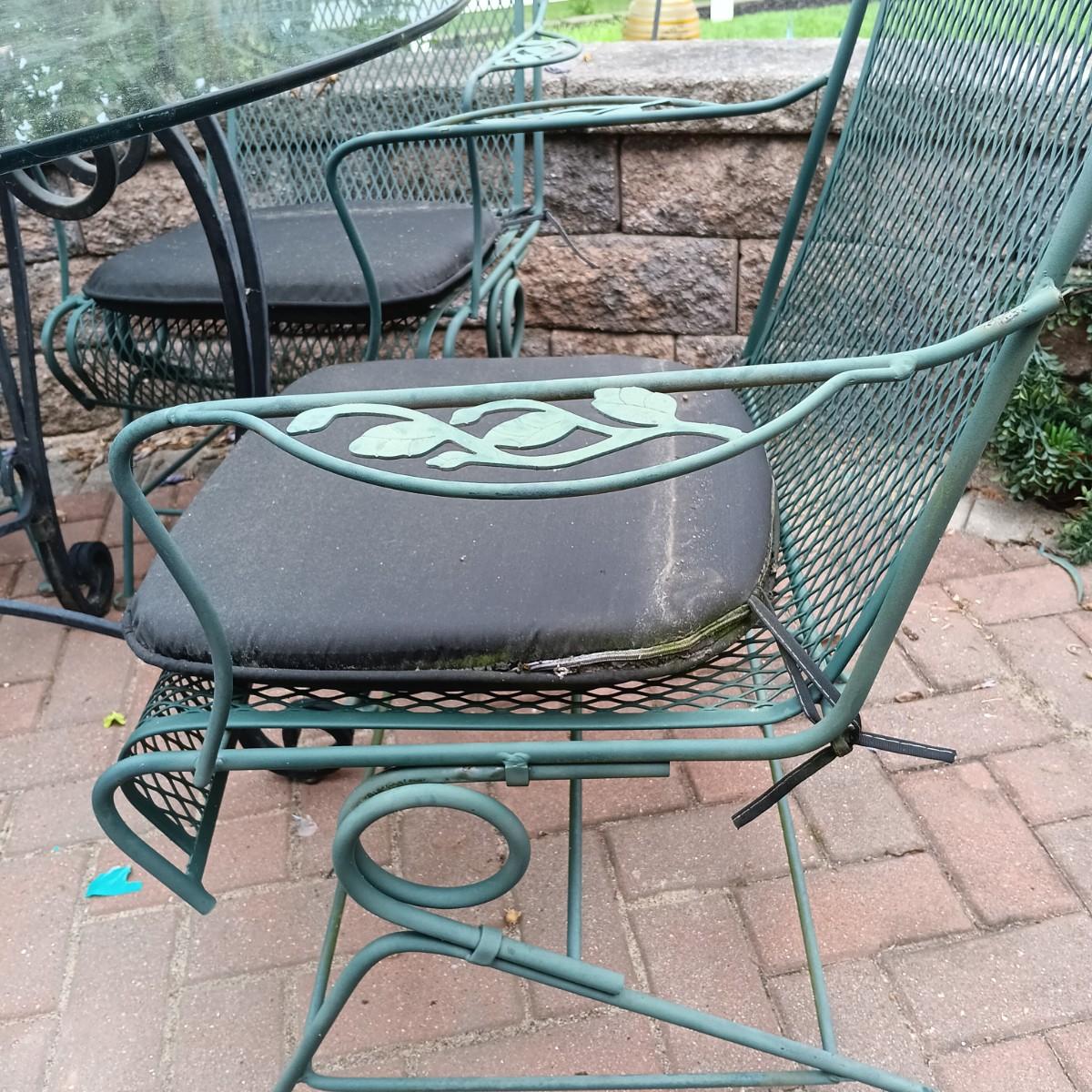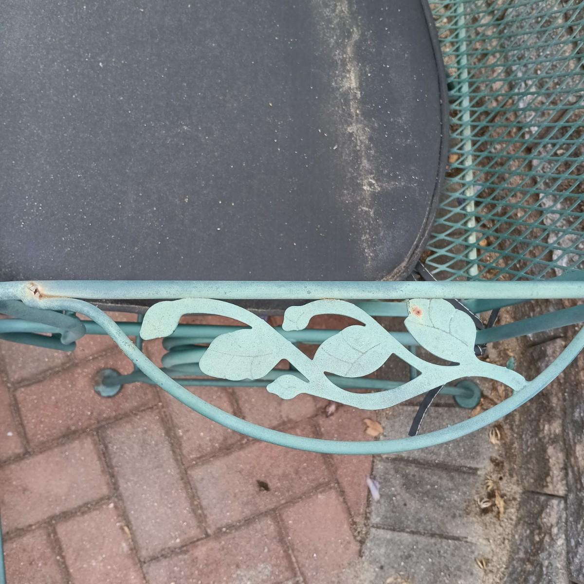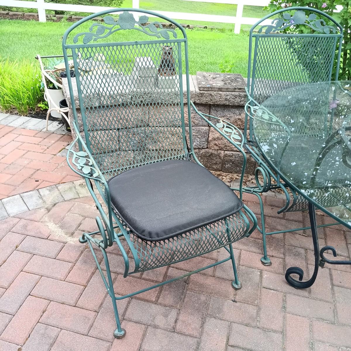 LOT 305: Set of Metal Patio Chairs with Wrought Iron and Glass Top Table
