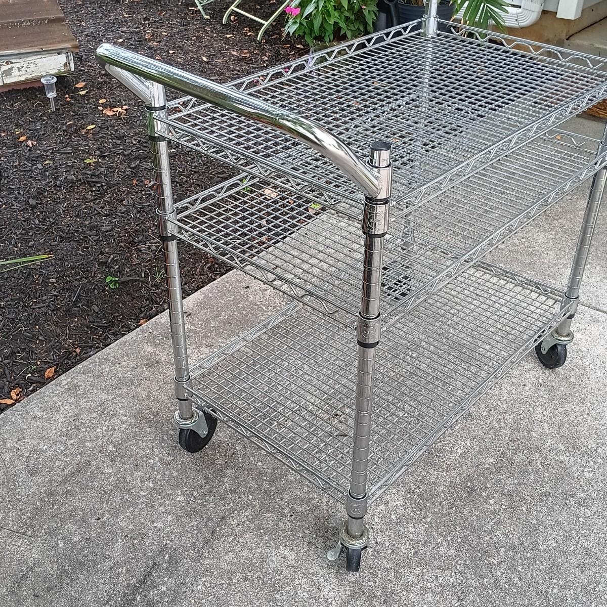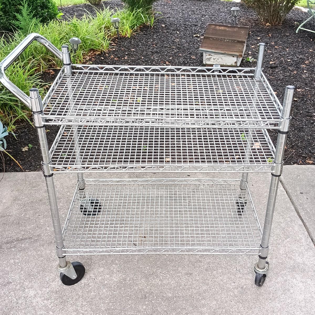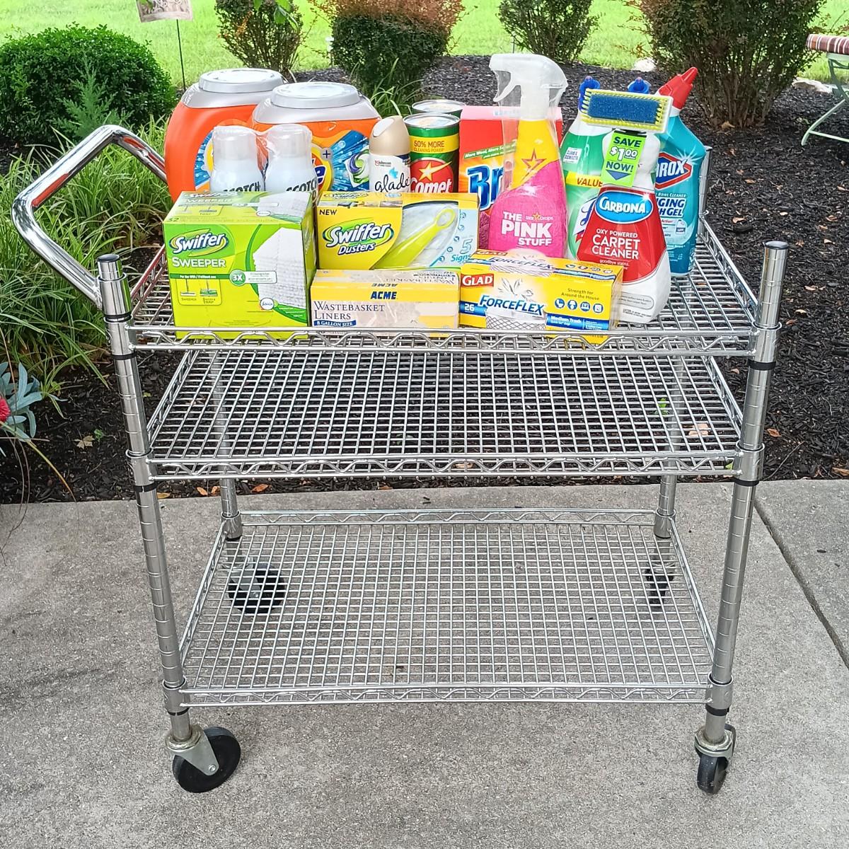 LOT 313: Rolling Metal Cart with New in Box / Old Stock Cleaning Products