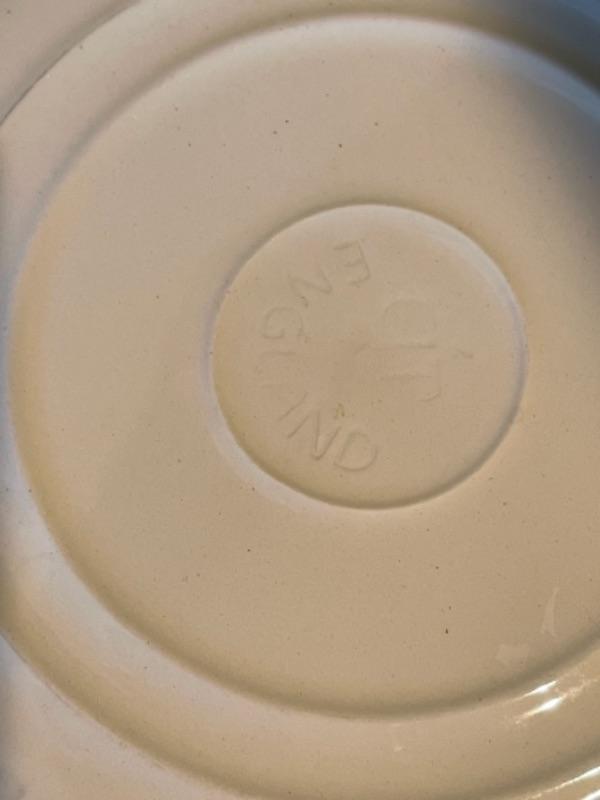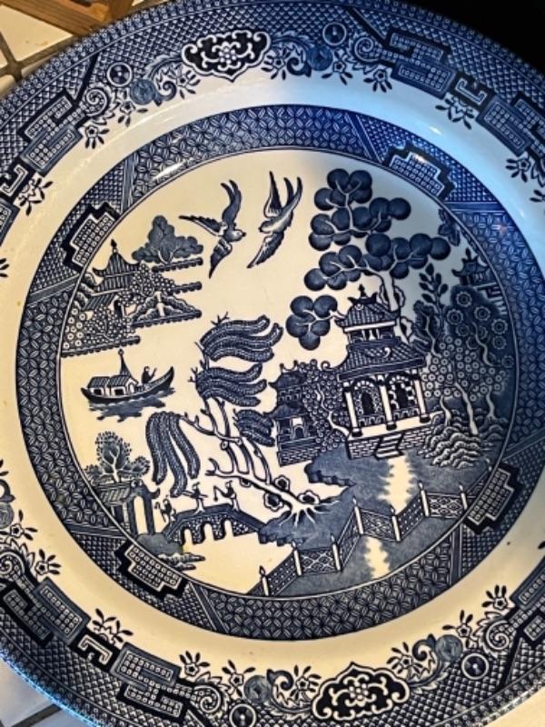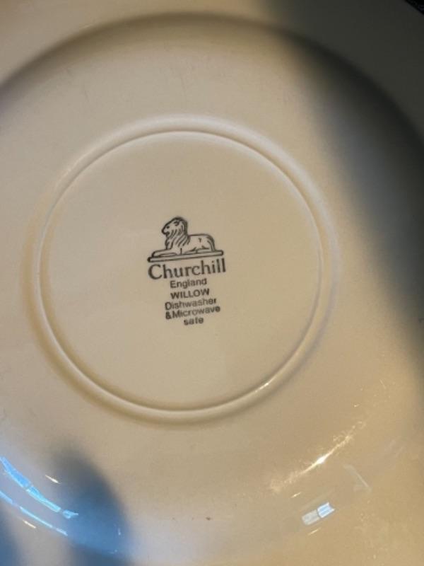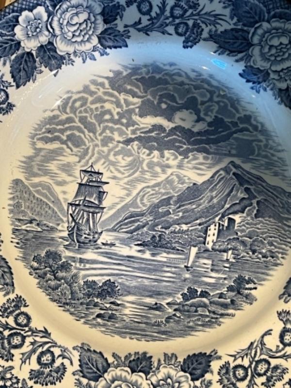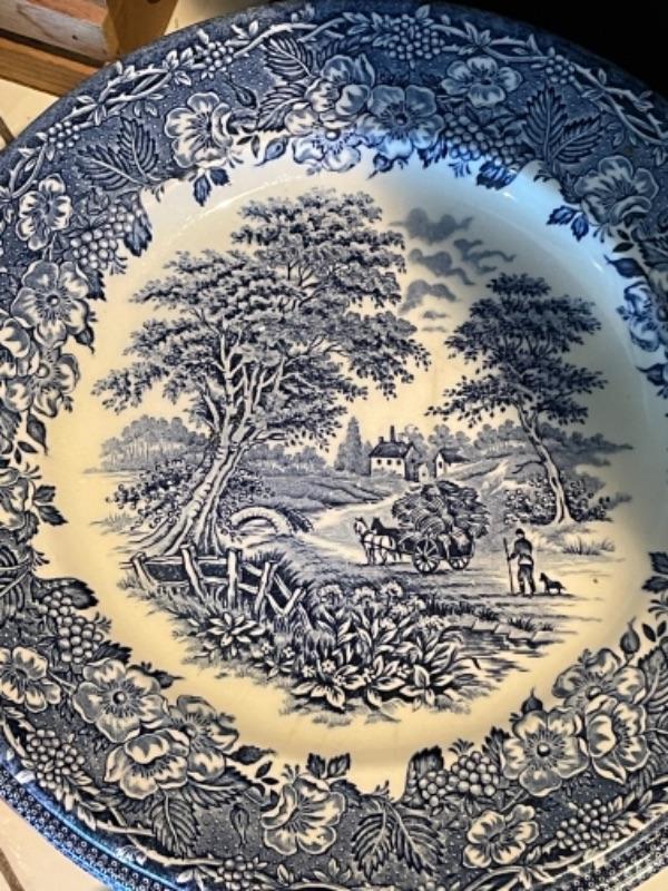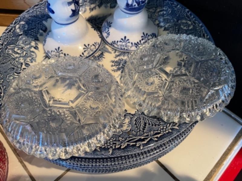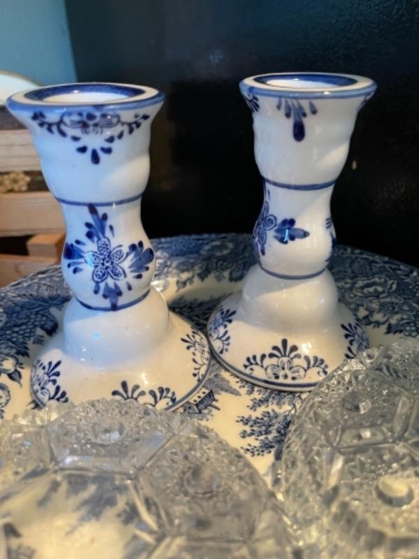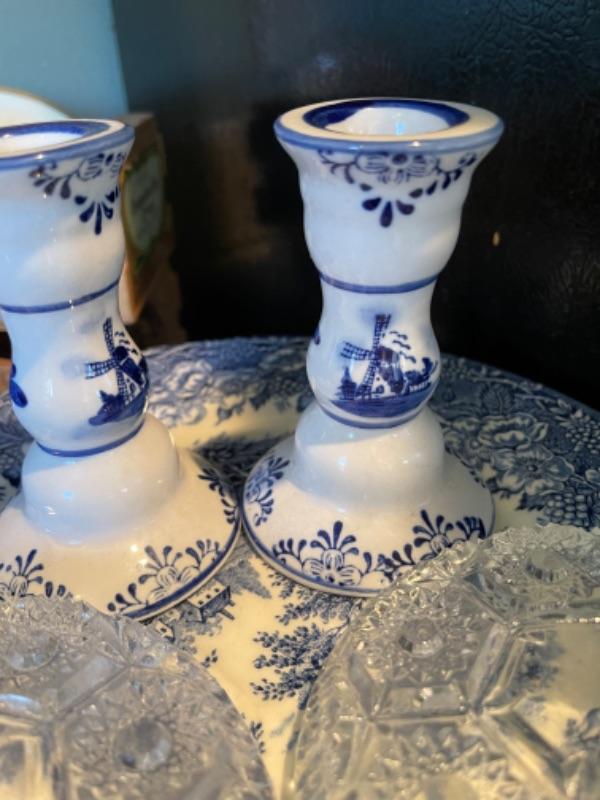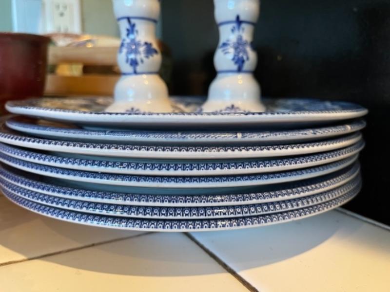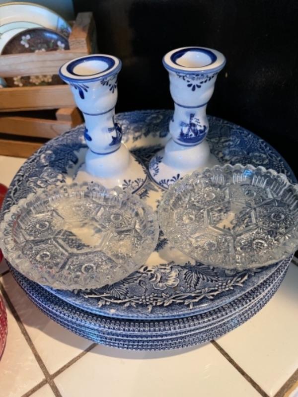 Lot 105K. Collection of English blue dinner ceramic dinner plates; 2 ceramic candlesticks, 2 glass coasters--$40