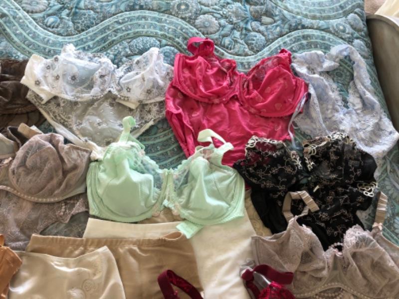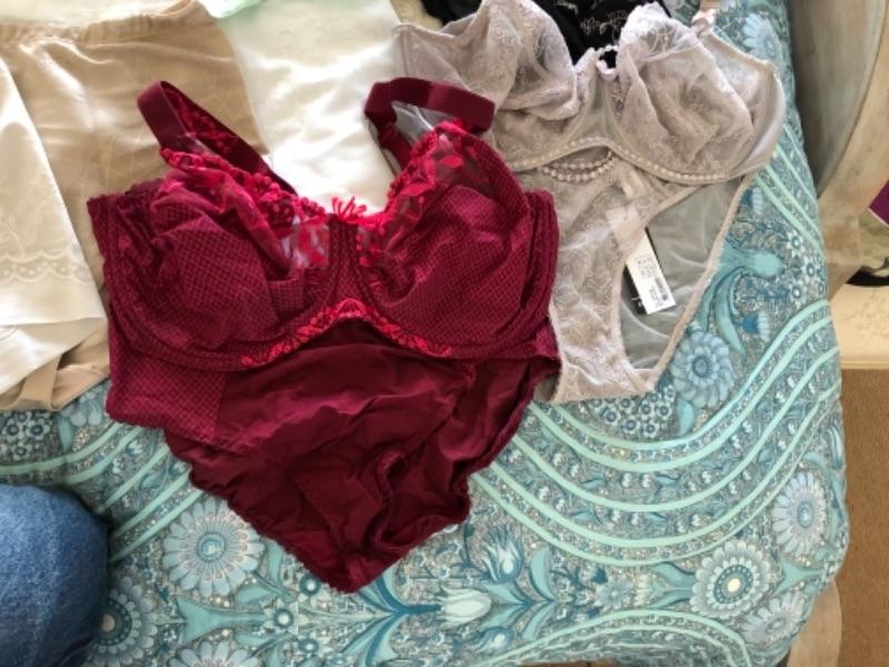 Lot 105U. Nine bra and pantie sets, 1 teddy, 5 briefs, 2 single bras, size UK 38 or US 38 or UK40 or US 40D, panties are XL, New--$125