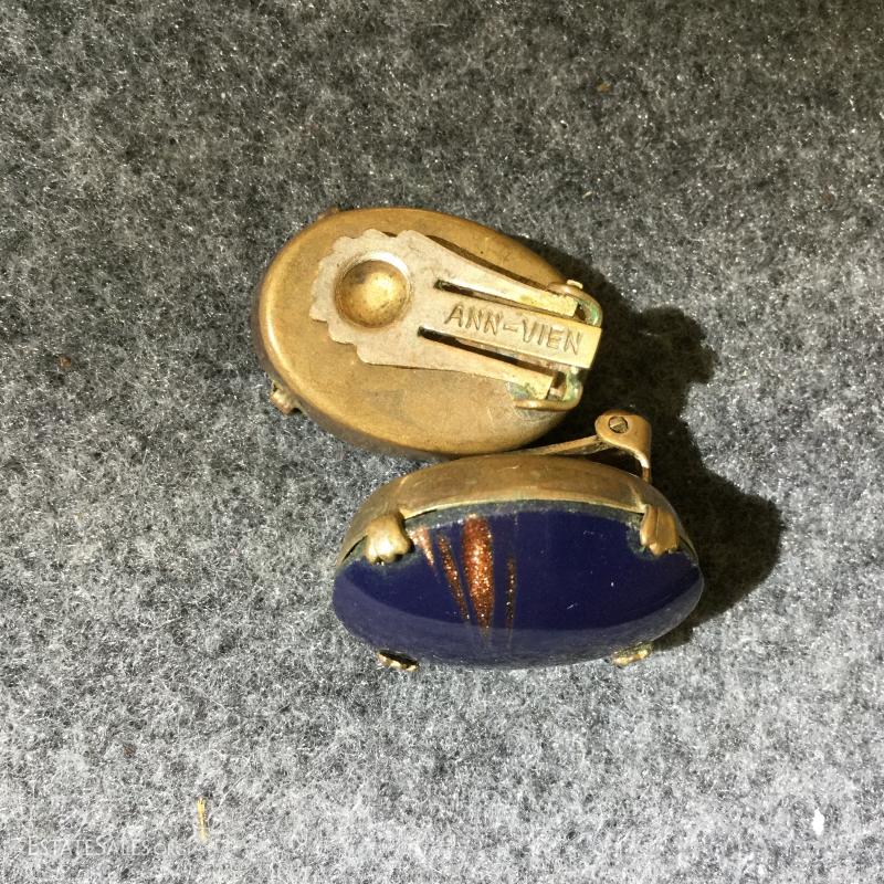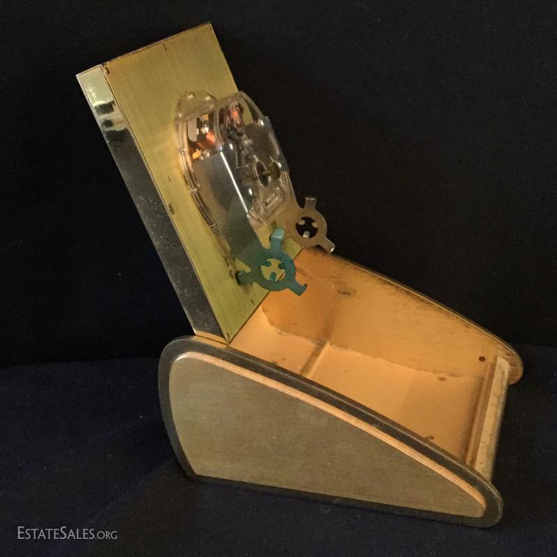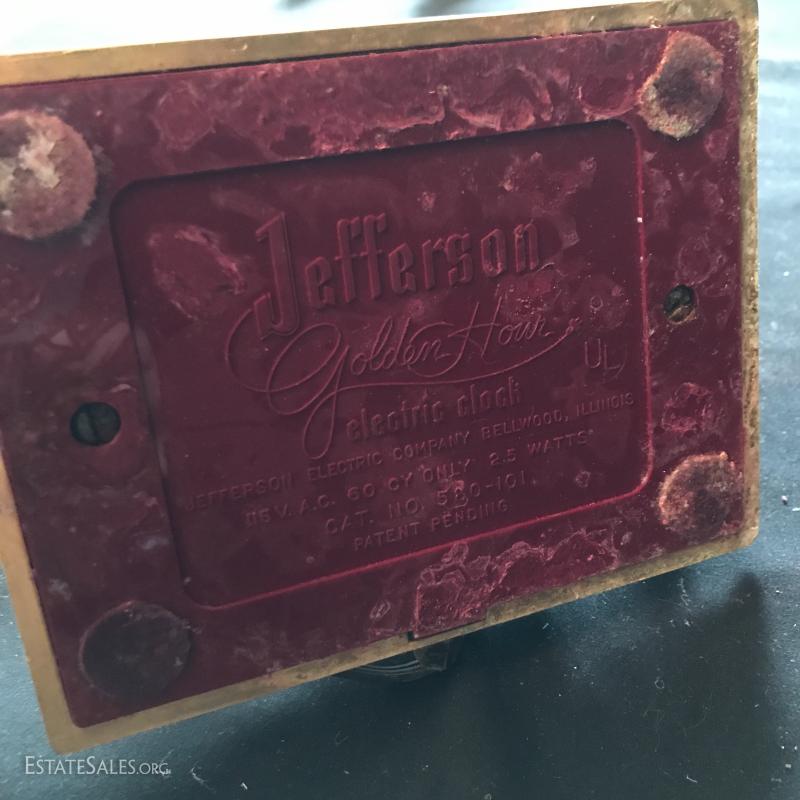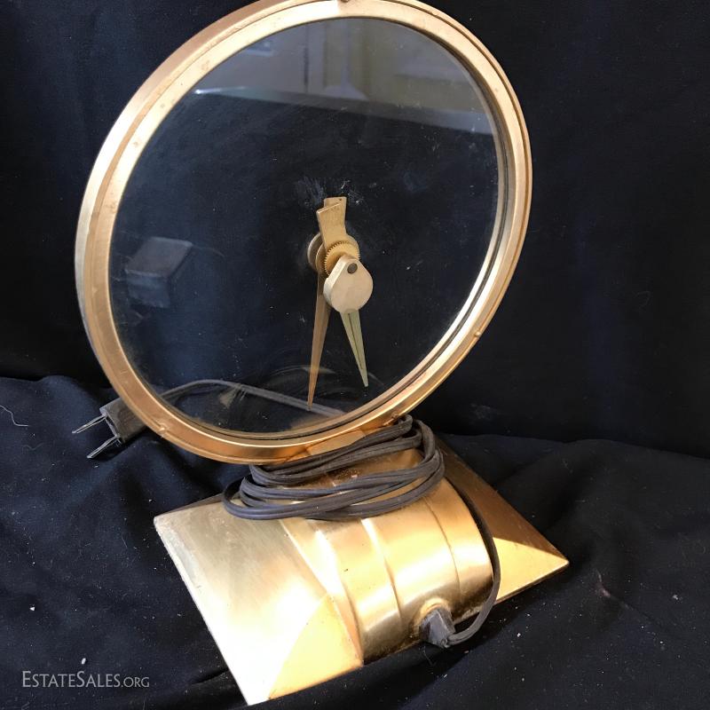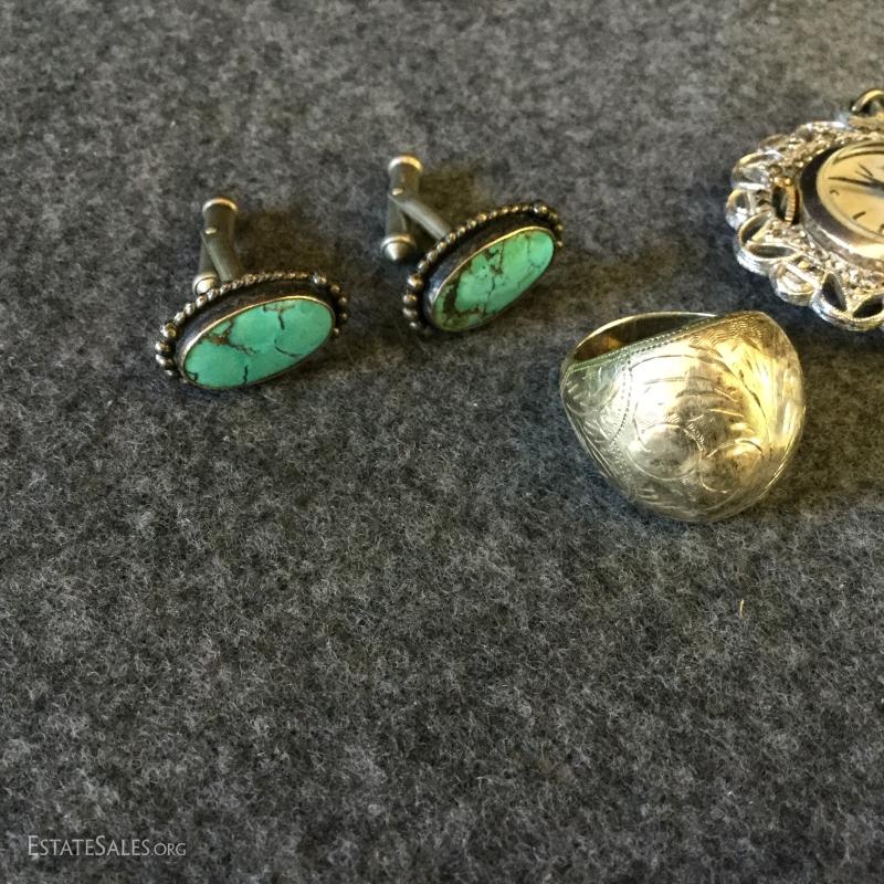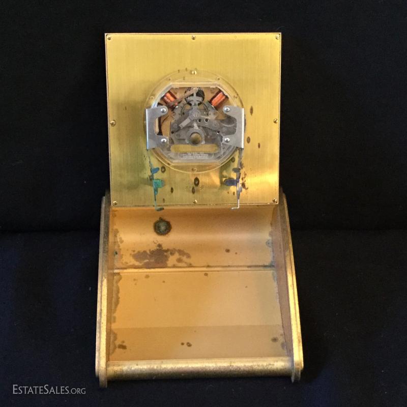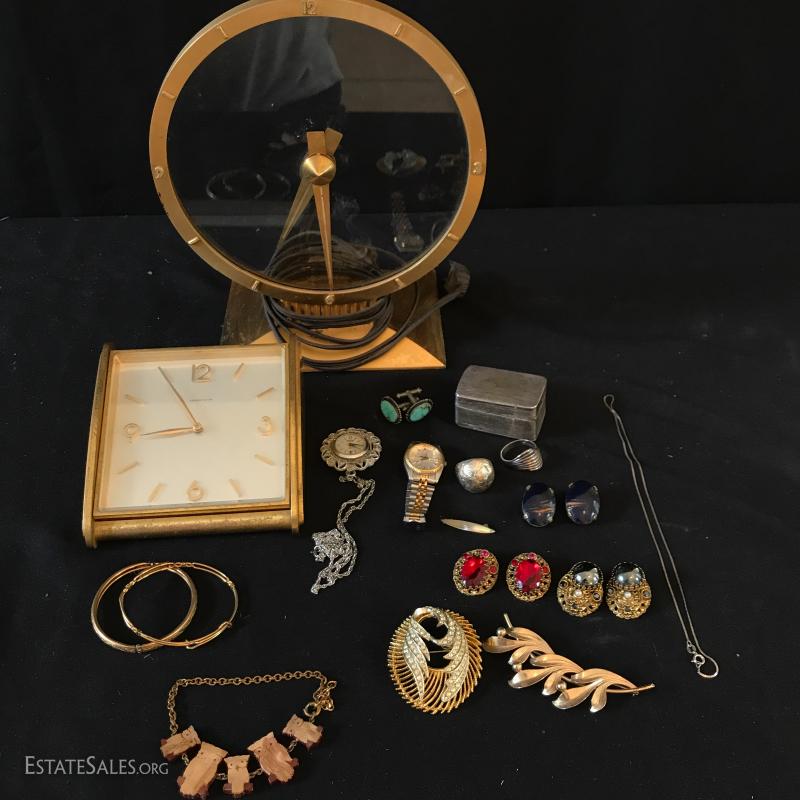 This lot includes a table top clock (5"l x 4.5"w x 2"h) from Tiffany & Co. that was a gift from Smith Barney & Co Directors. See pic of engraving on back of clock. Uncertain if works as there is some corrosion inside. The brass is also worn on outside. Also a very cool MCM table top electric clock by Jefferson Golden Hour. This lot also includes two Sterling rings, a Sterling pin and cuff links with turquoise. There is a gorgeous set of stone clip earrings made by Ann-Vien and other vintage jewelry. See photos. Marks inside bracelets are ineligible. Small silver box is 2"l x 1.25"w x 1"h. Shipping available or local pick up in Flat Rock, NC.