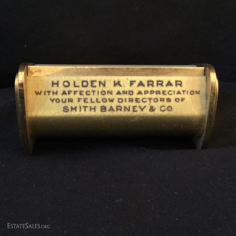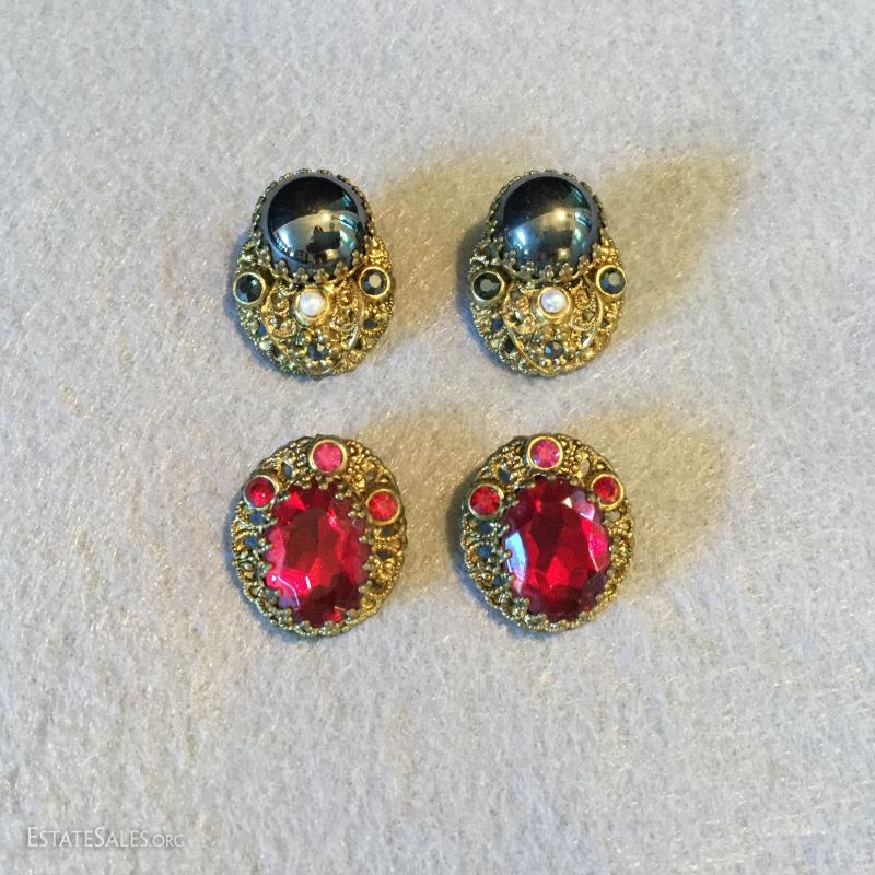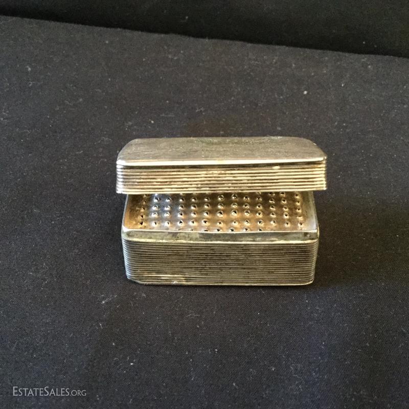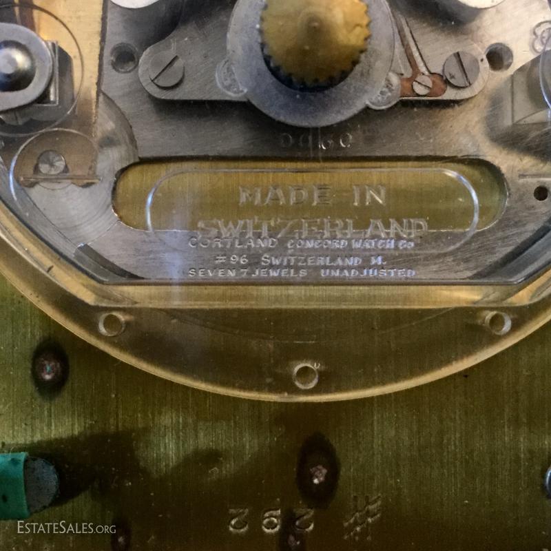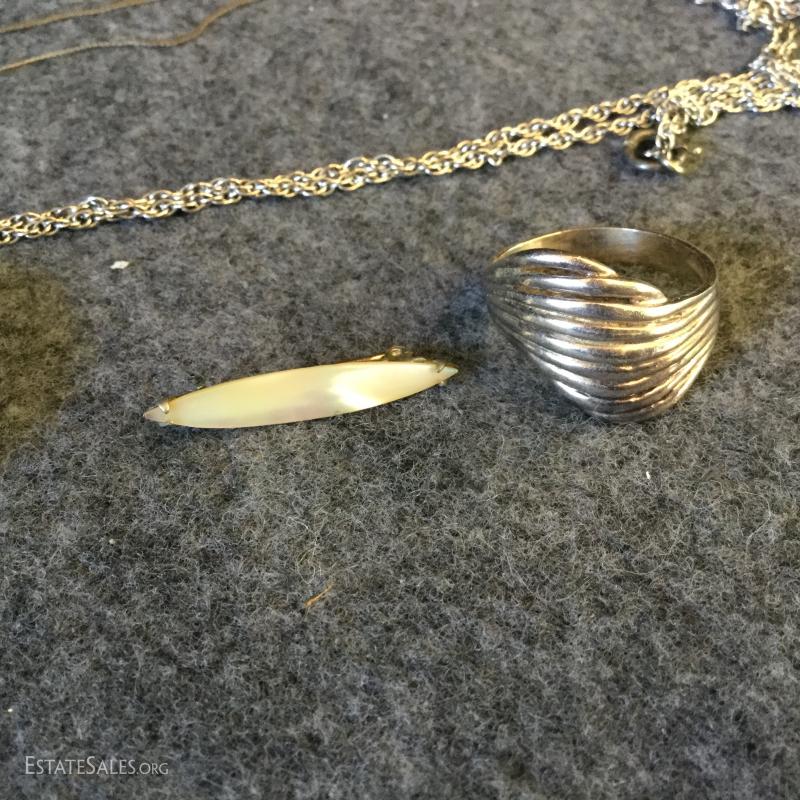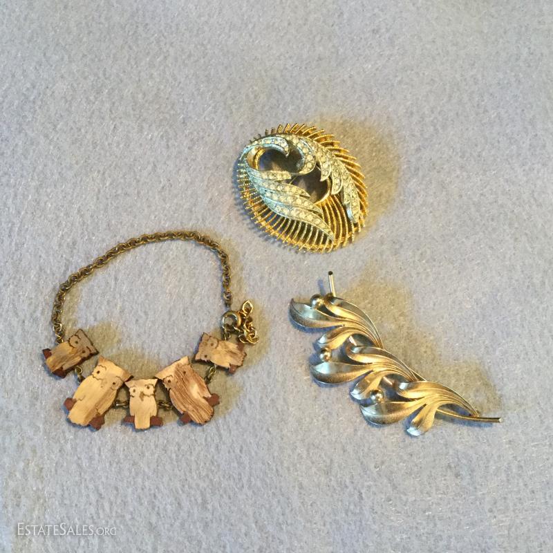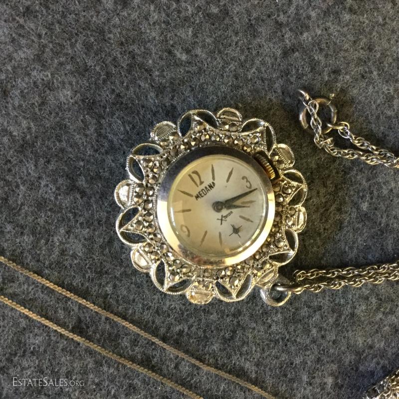 This lot includes a table top clock (5"l x 4.5"w x 2"h) from Tiffany & Co. that was a gift from Smith Barney & Co Directors. See pic of engraving on back of clock. Uncertain if works as there is some corrosion inside. The brass is also worn on outside. Also a very cool MCM table top electric clock by Jefferson Golden Hour. This lot also includes two Sterling rings, a Sterling pin and cuff links with turquoise. There is a gorgeous set of stone clip earrings made by Ann-Vien and other vintage jewelry. See photos. Marks inside bracelets are ineligible. Small silver box is 2"l x 1.25"w x 1"h. Shipping available or local pick up in Flat Rock, NC.