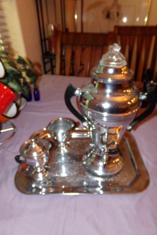 STAINLESS STEEL COFFEE URN, CREAM, SUGAR AND TRAY